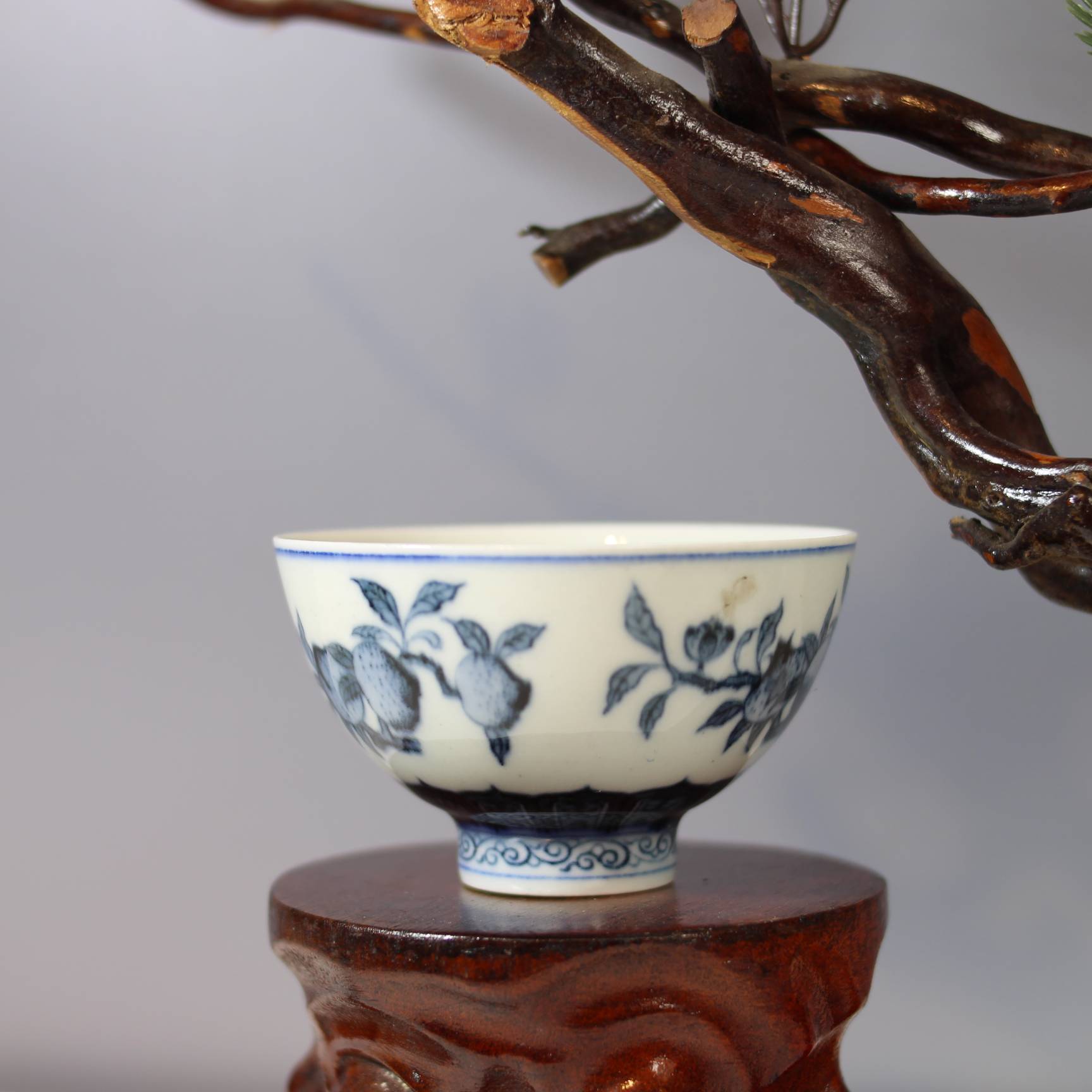 这是一只青花瓜果纹茶杯,采用了传统的青花瓷工艺。以含氧化钴的钴矿为原料,在瓷胎上绘制纹饰,再罩以透明釉,经过高温烧制,钴料在高温下发生化学反应,呈现出稳定的蓝色,与洁白的瓷胎相互映衬,形成清新雅致的蓝白配色,这种工艺使得图案能够历经岁月而不褪色