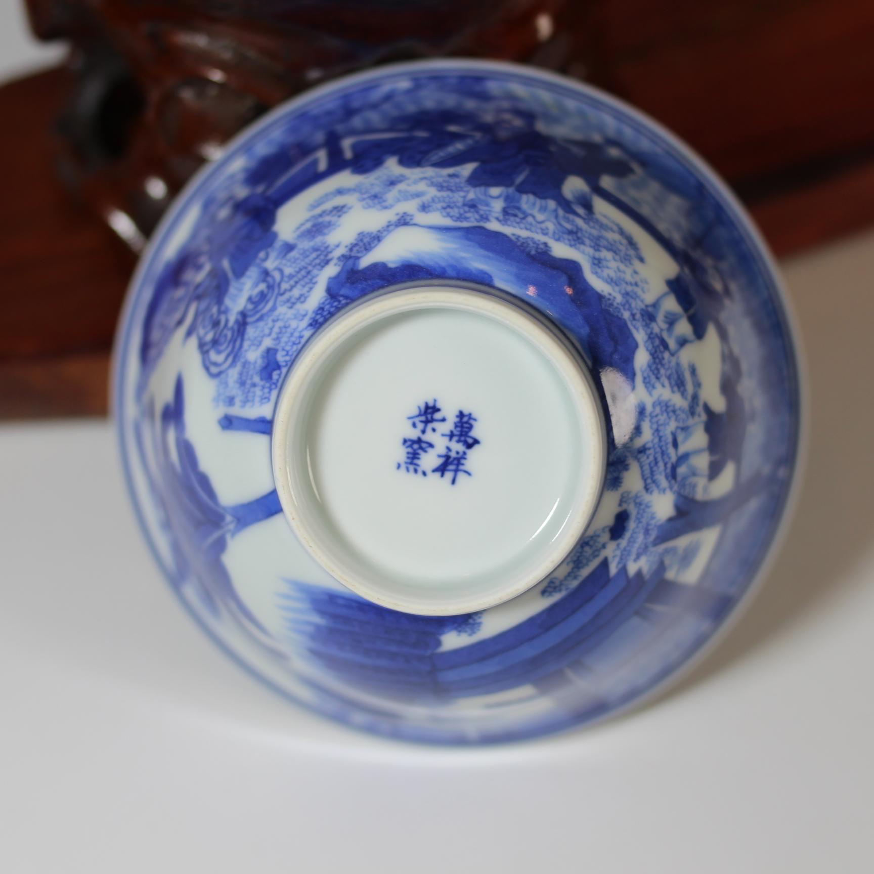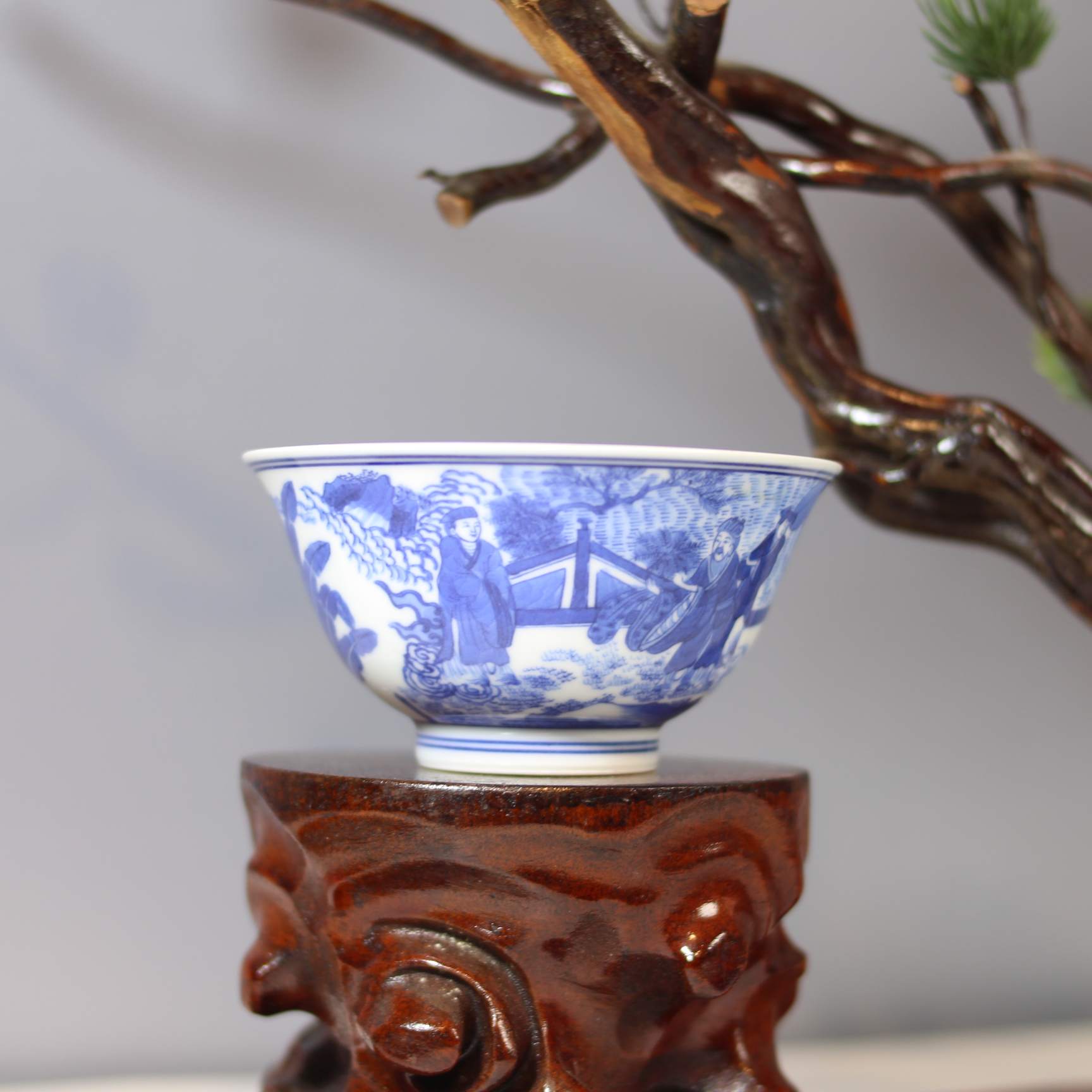 景德镇青花杯,采用了经典的青花瓷工艺制作。以氧化钴为颜料,先在瓷胎上细致描绘图案,之后施透明釉,再经高温烧制,使氧化钴呈现出稳定且鲜明的蓝色,与白色瓷胎相互映衬,形成清新雅致的蓝白外观 ,且图案不易褪色。