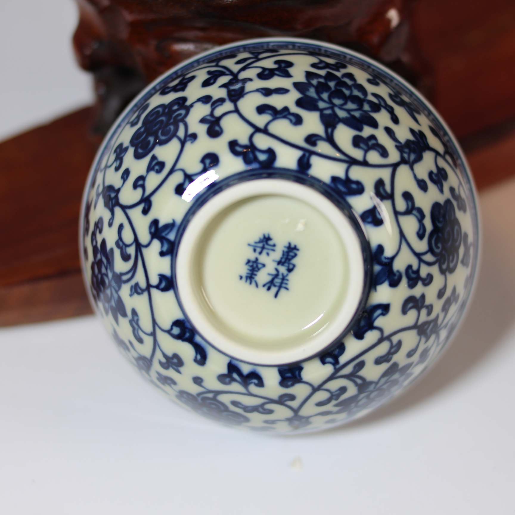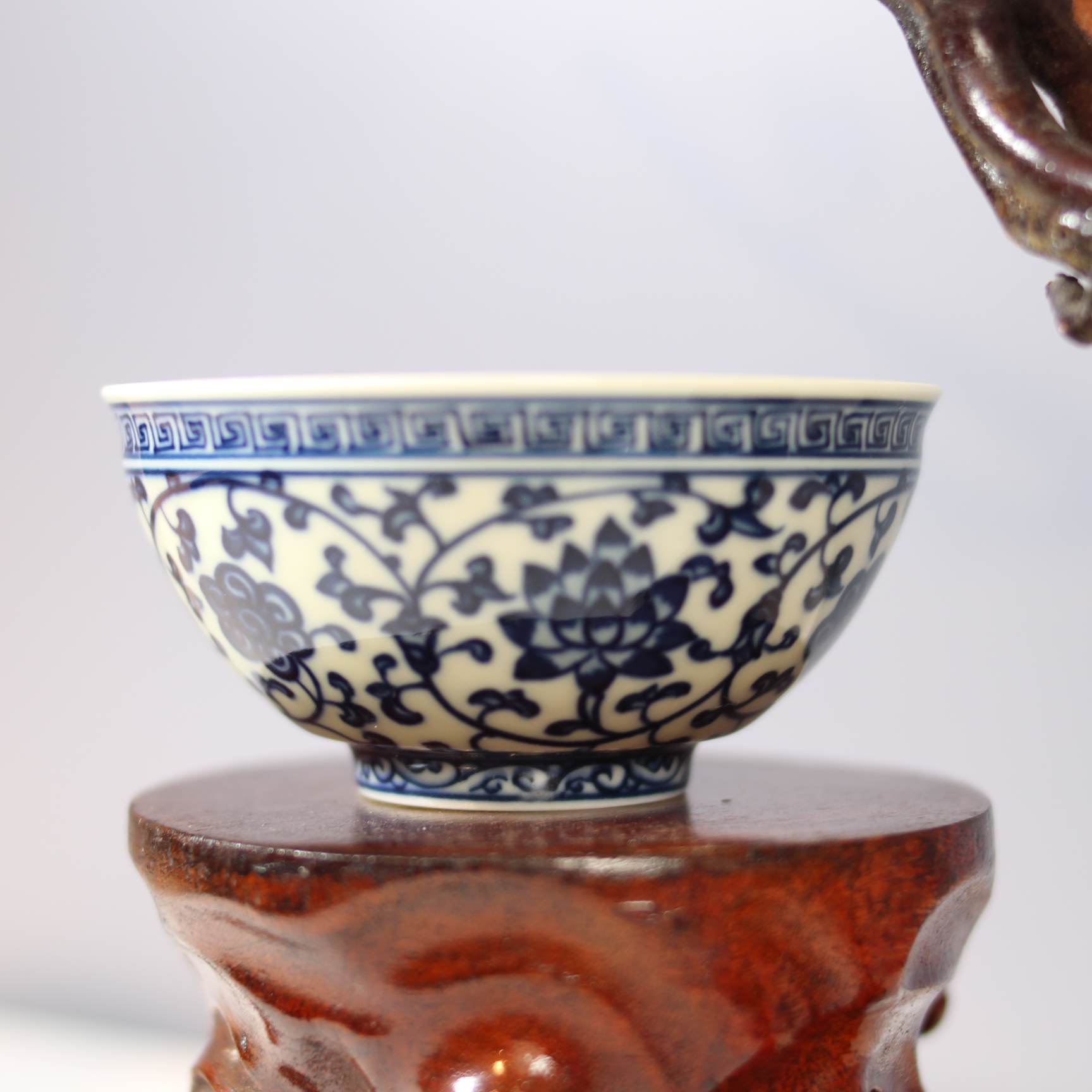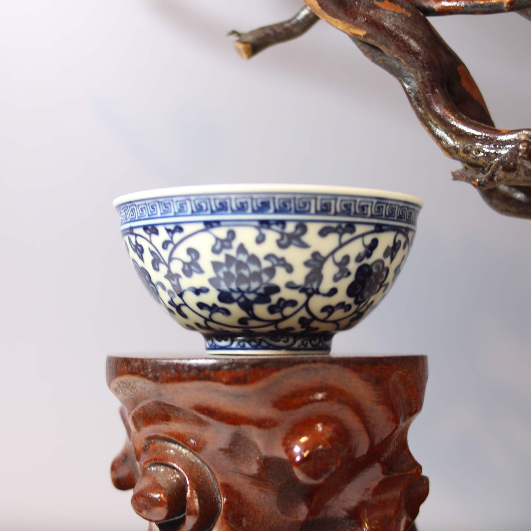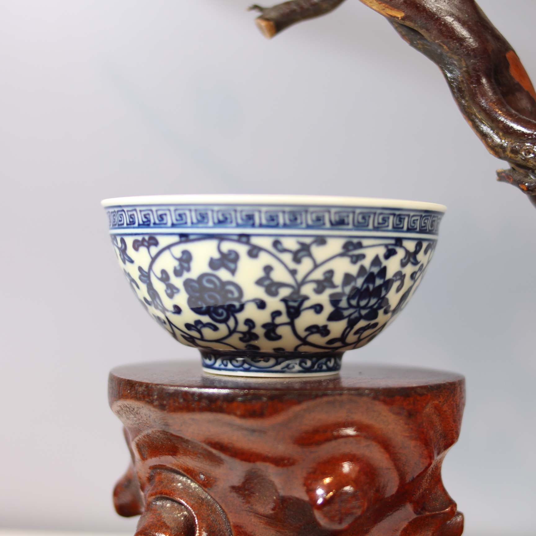 这是一只青花缠枝莲纹杯,属于传统青花瓷茶具,运用经典青花瓷工艺,以含钴颜料在瓷胎绘制图案,施透明釉后高温烧制,蓝白配色经典且历久弥新 。