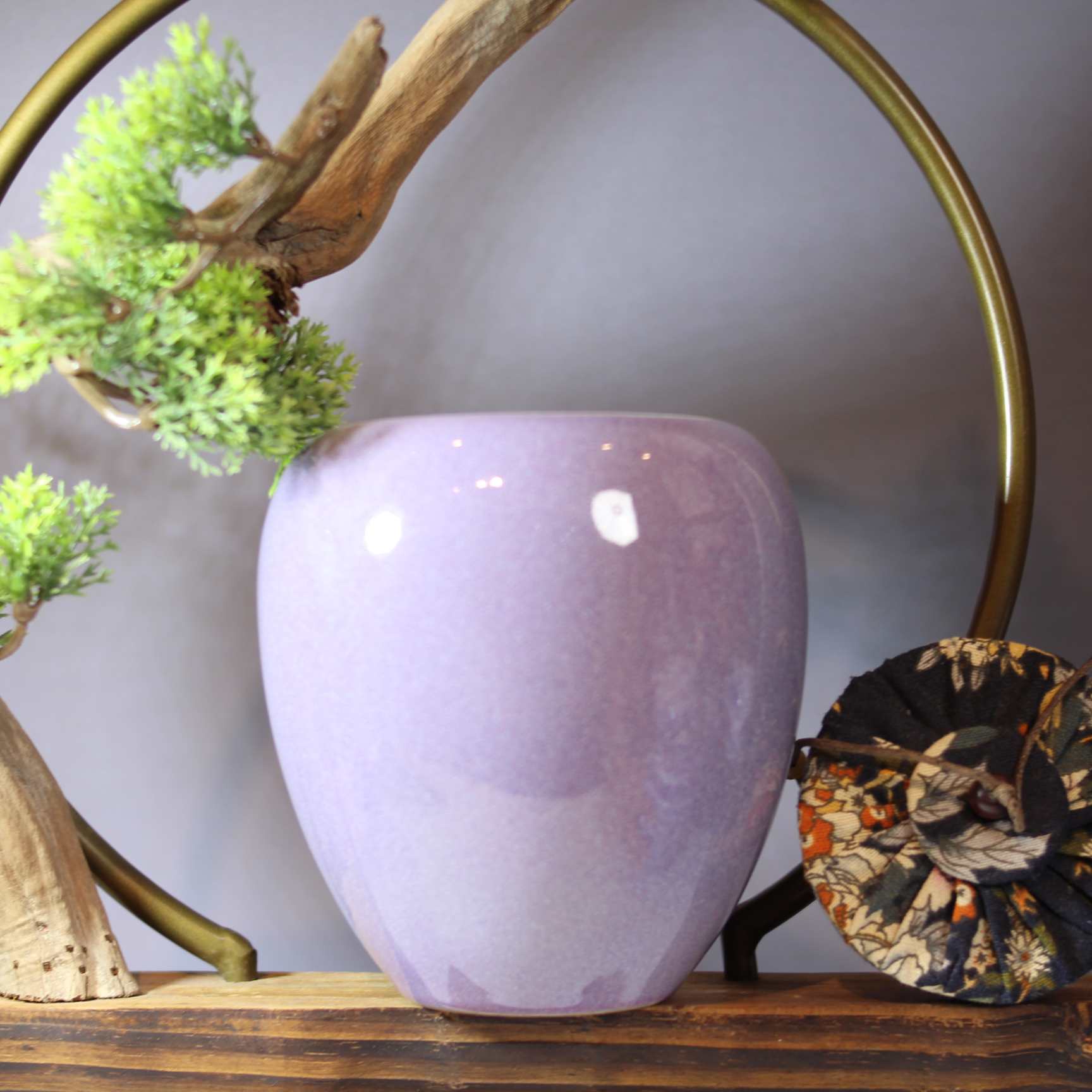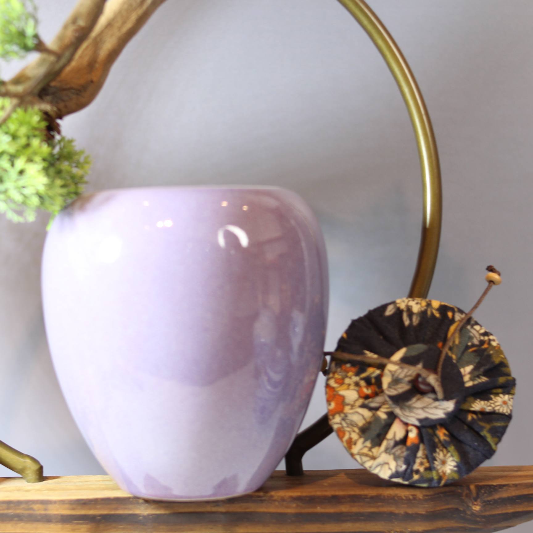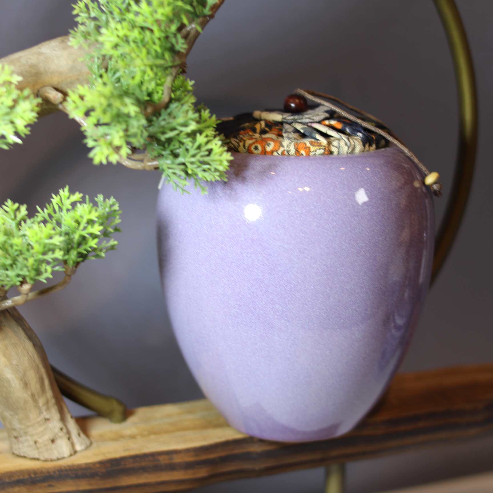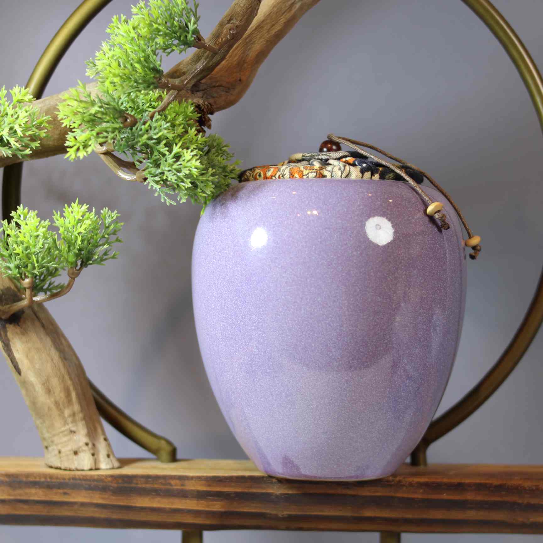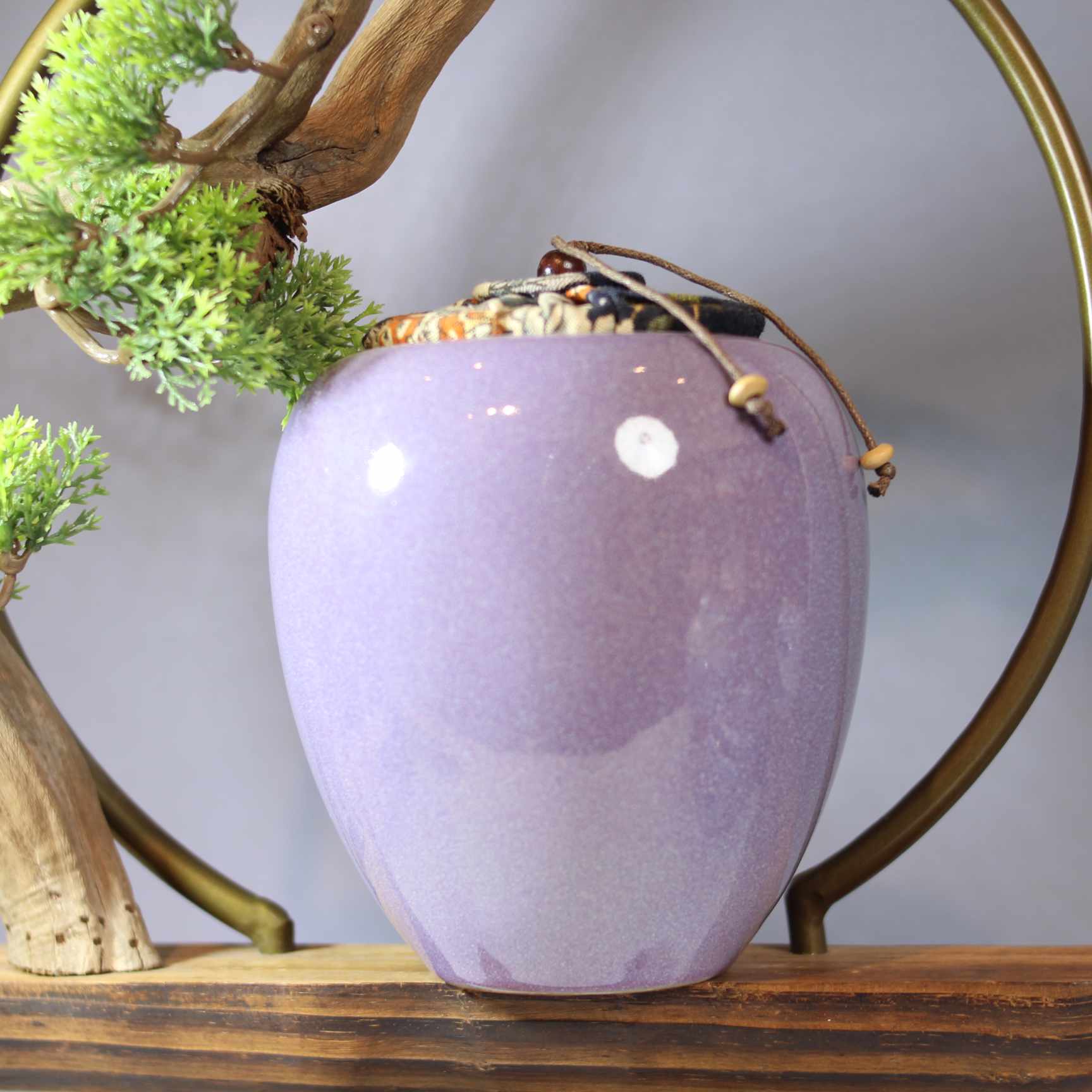 这是一款造型别致的茶叶罐,整体呈圆润的类似果实的造型,罐体为优雅的淡紫色,给人柔和、典雅的感觉。罐口处配有带装饰的布质封口,还带有类似绳结的小部件,增添了几分古朴的韵味 。旁边搭配的小型绿植,更衬托出它的清新自然。