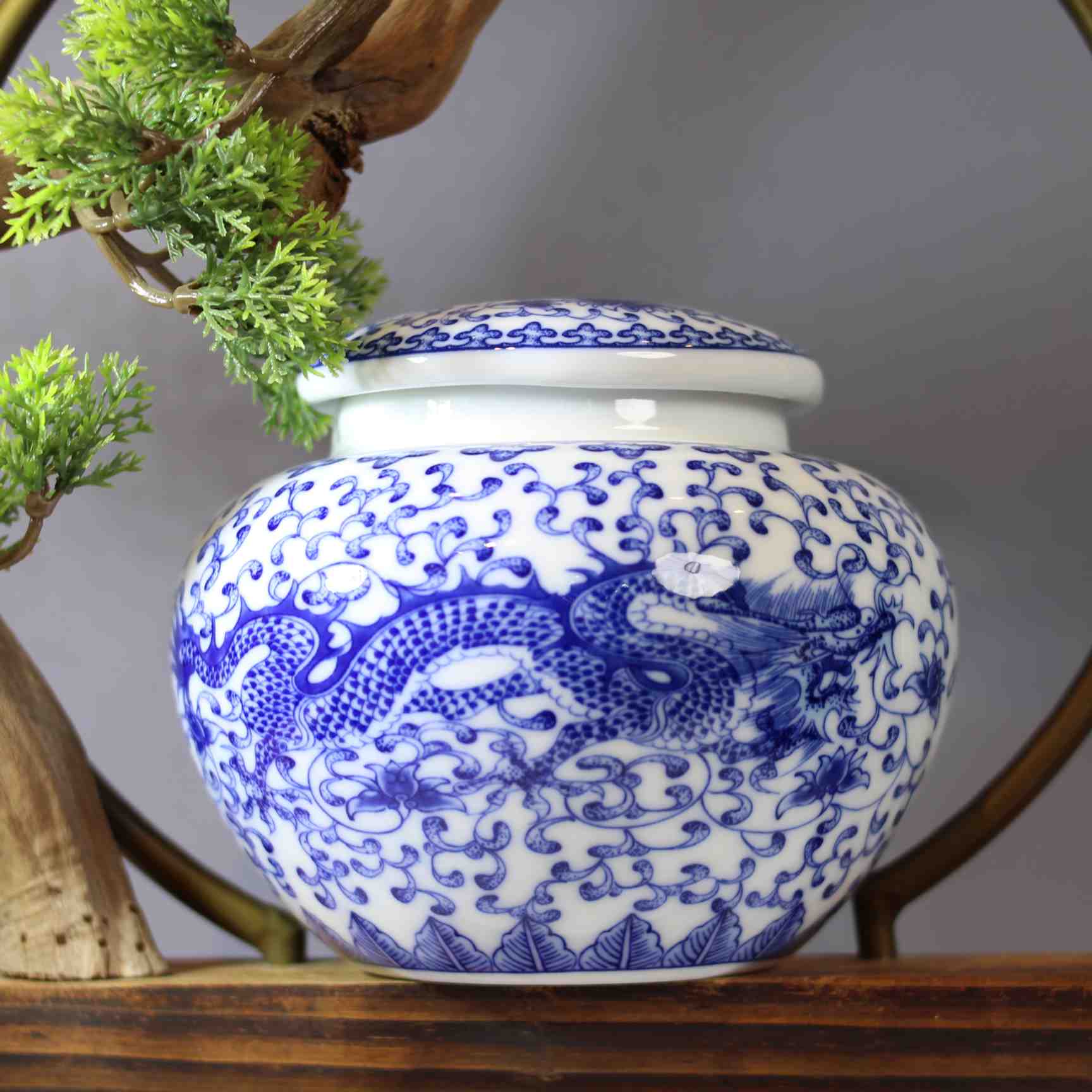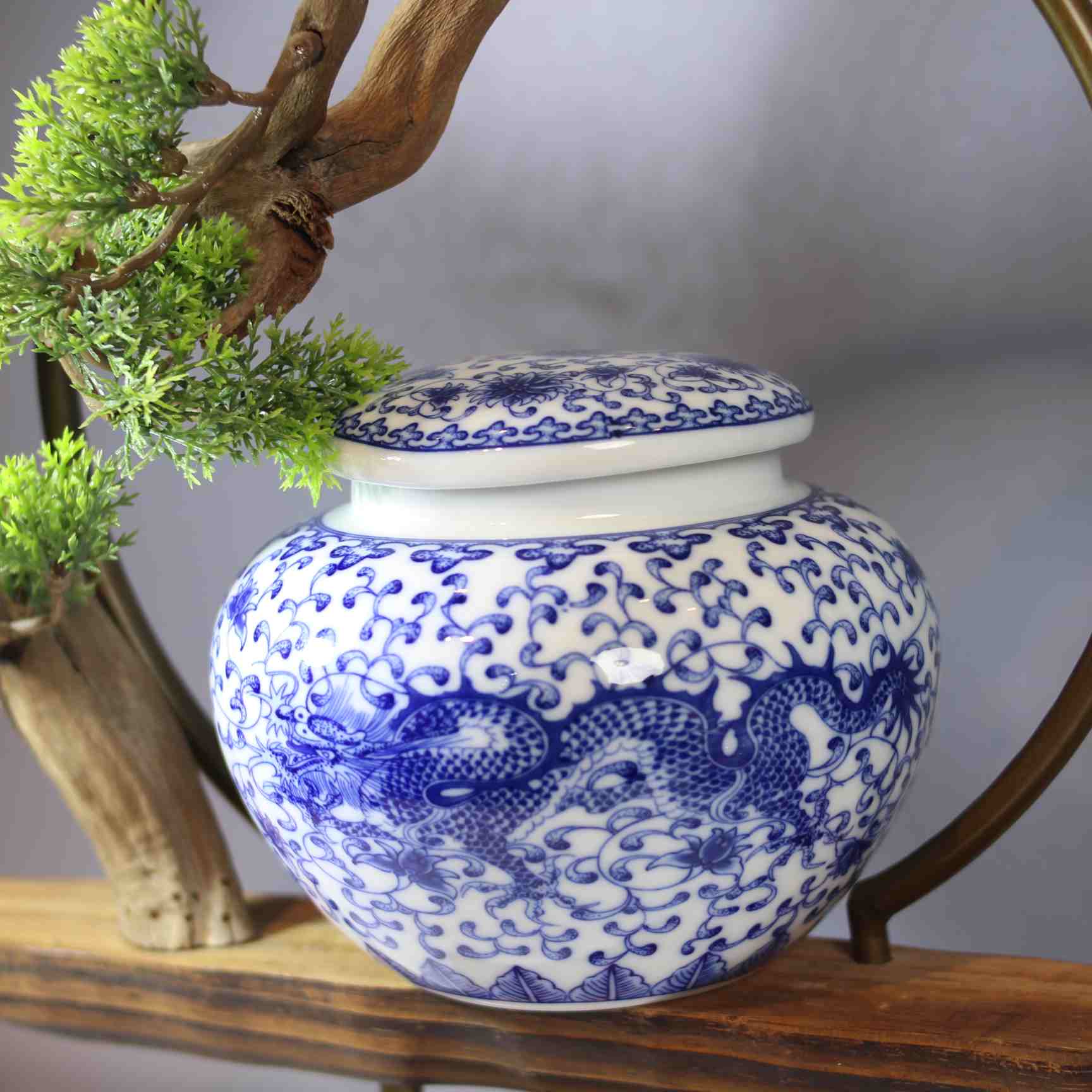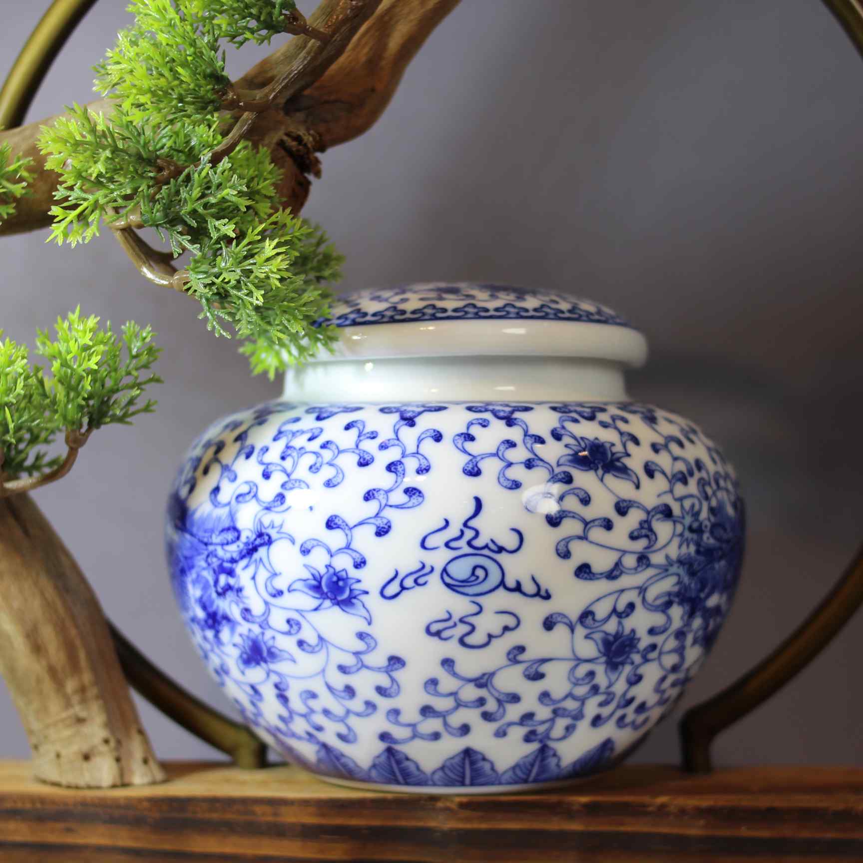 陶瓷材质,罐身绘有经典的青花瓷图案,以蓝白两色为主色调,图案展现了山水和建筑的景致,具有浓郁的中式风格。罐口配有金属材质的盖子,有助于密封,可较好地保存茶叶。其造型圆润,放置在带有盆景装饰的木质架子上,整体给人一种古朴雅致的感觉,既实用又具有一定的装饰性 ,产自景德镇。