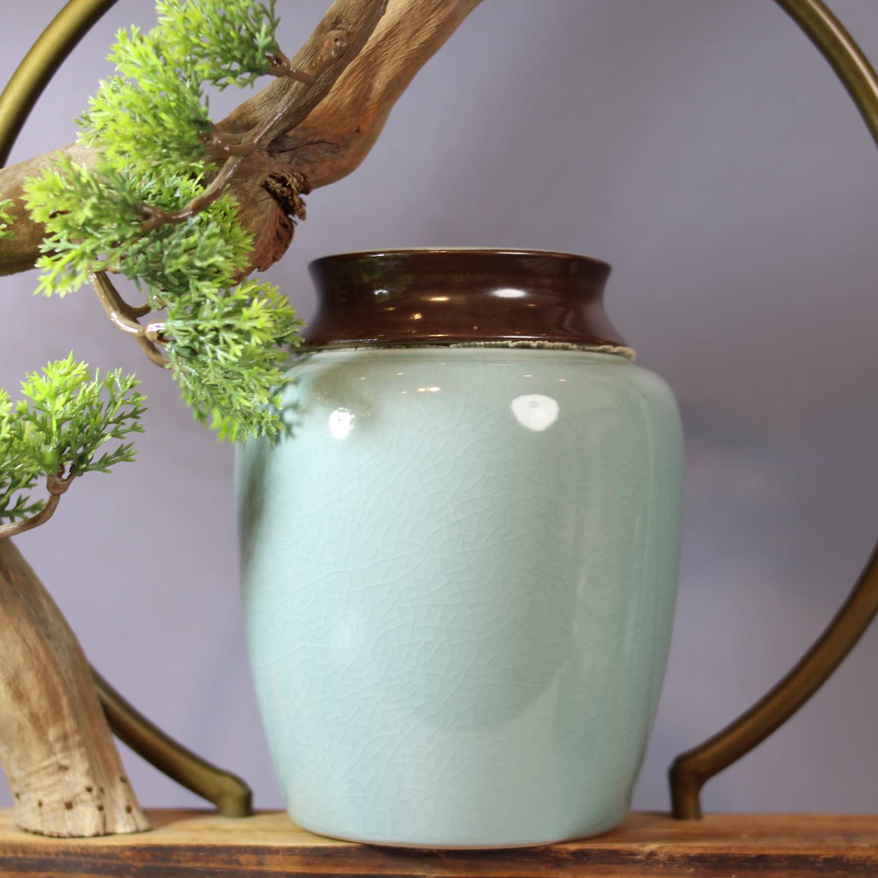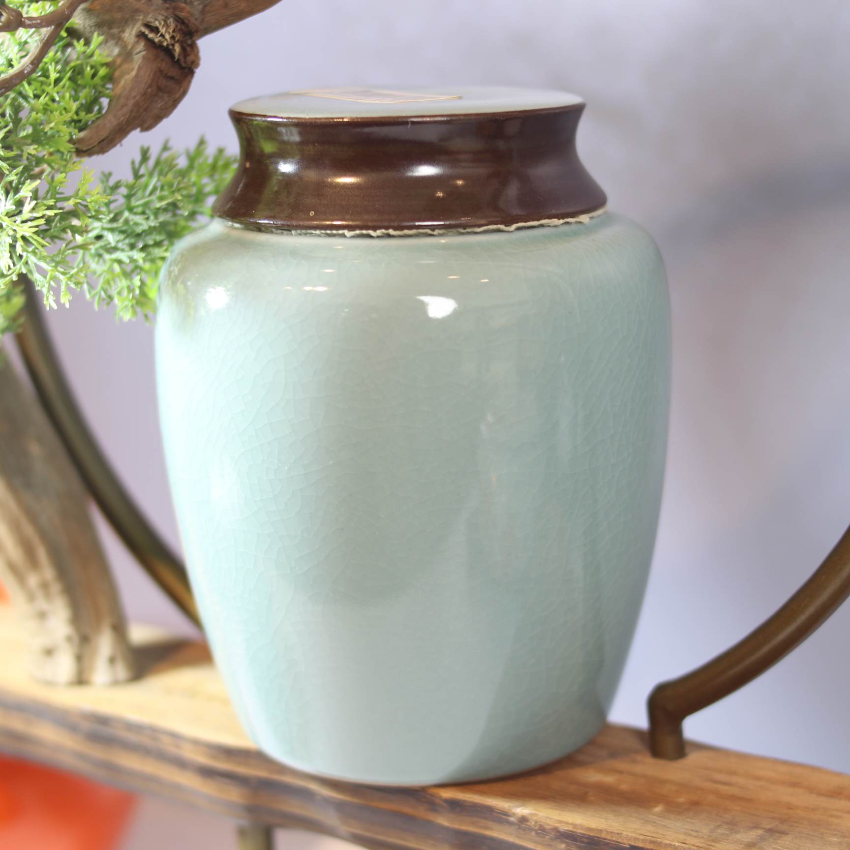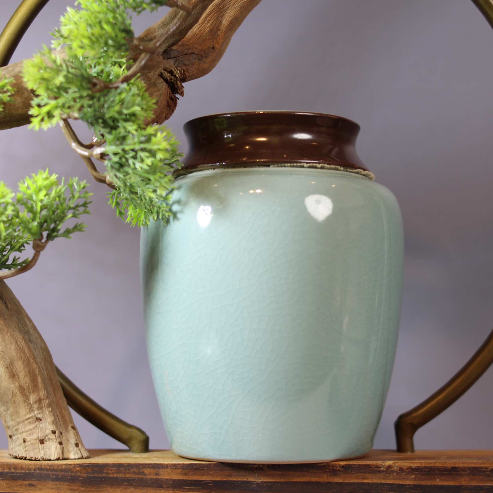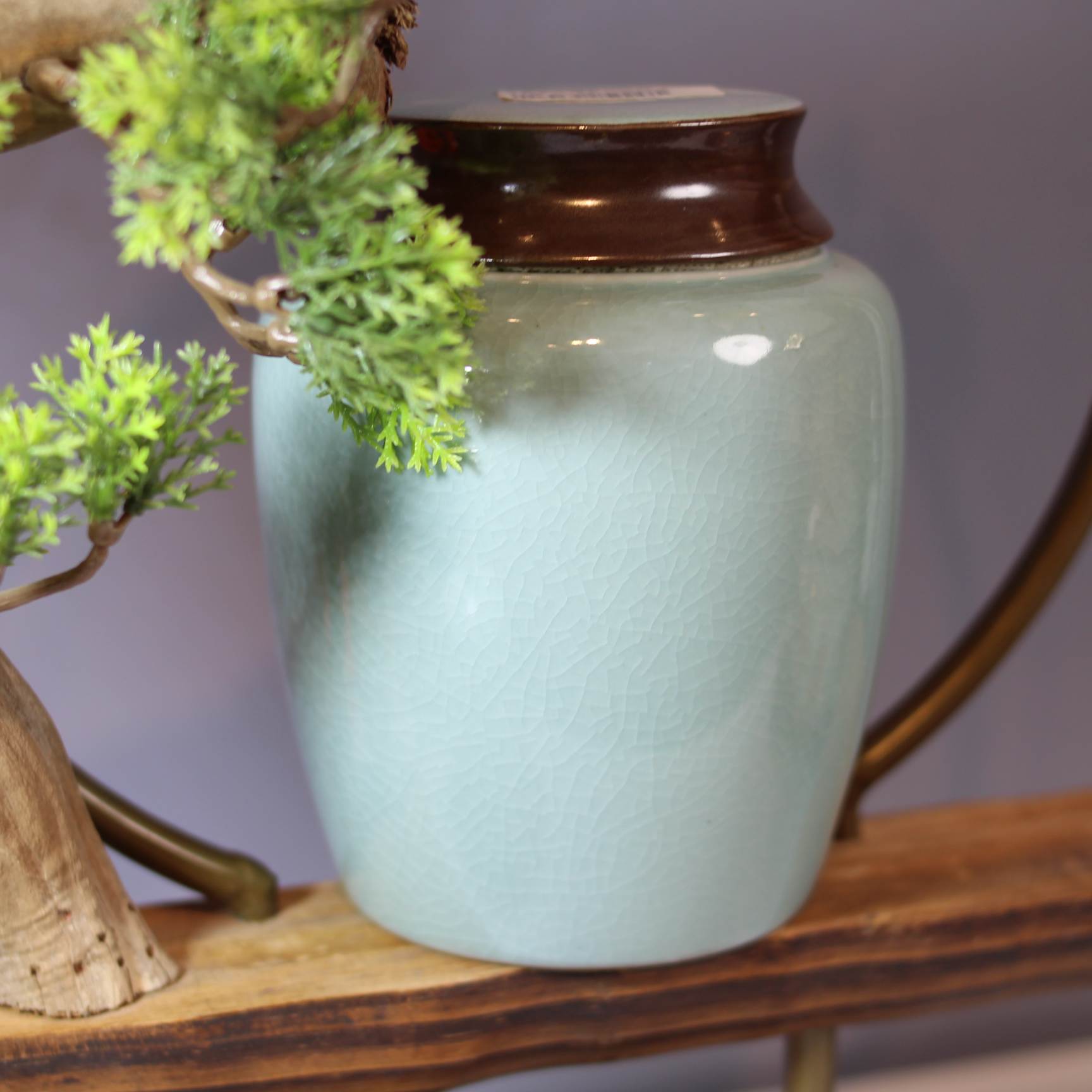 陶瓷茶叶罐。罐体颜色为淡青色,表面呈现出独特的开片纹理,这是类似哥窑瓷器的特征,增添了古朴雅致的韵味。罐口部分为深棕色,与淡青色的罐身形成色彩对比,显得别具一格 。