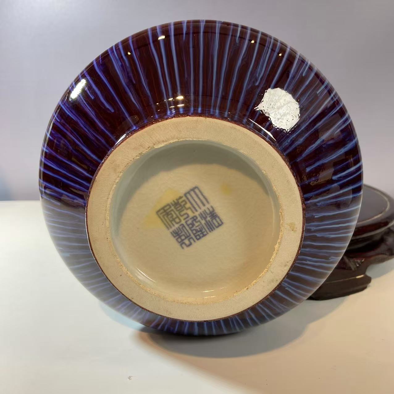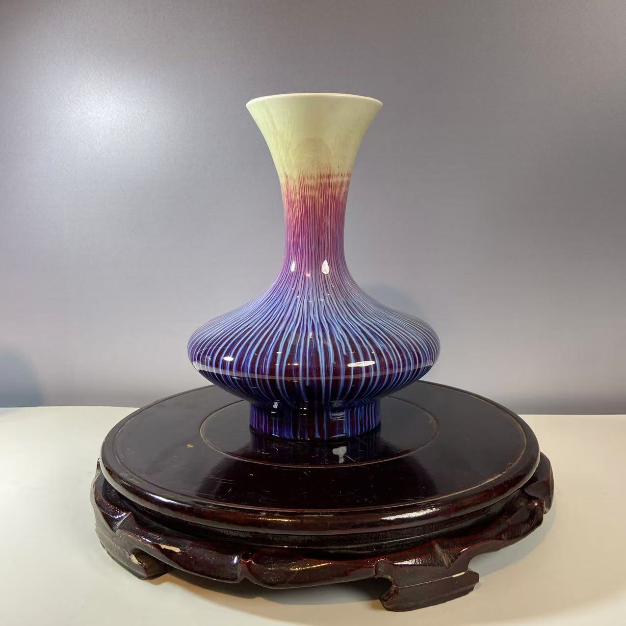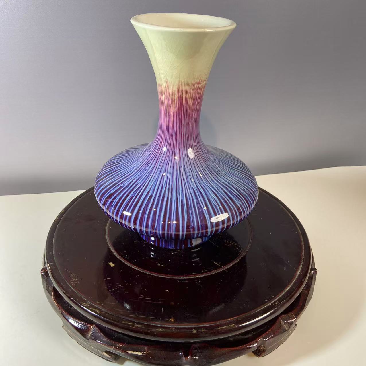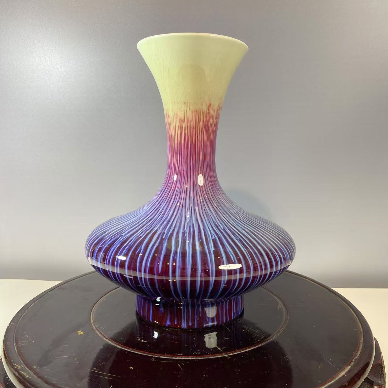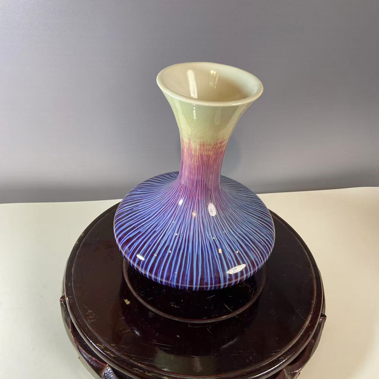 这种色彩斑斓且富有层次感的效果,是通过窑变工艺烧制而成。窑变是在瓷器烧制过程中,由于窑内温度、气氛等因素的变化,使釉面产生意想不到的色彩和纹理变化,每件作品的窑变效果都独一无二,增加了花瓶的艺术性和收藏价值。