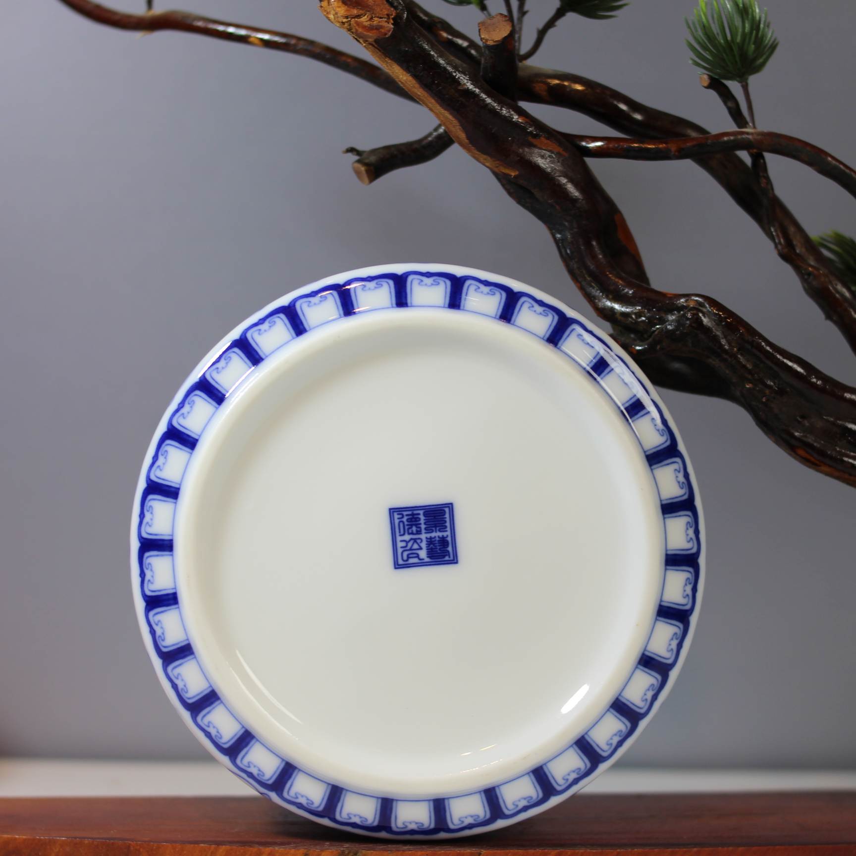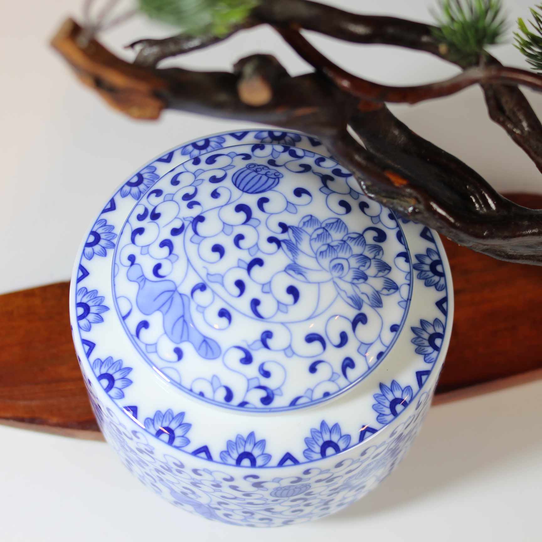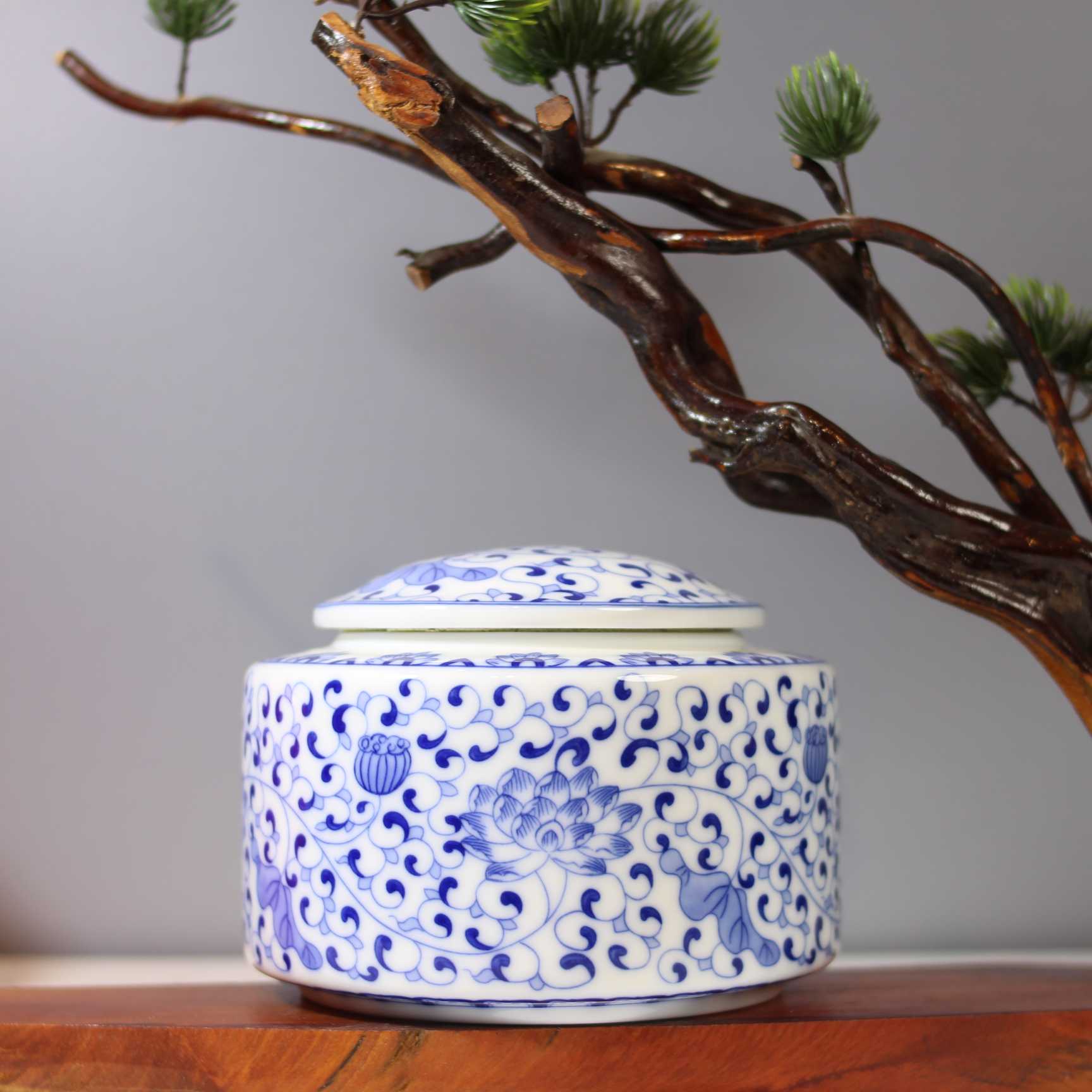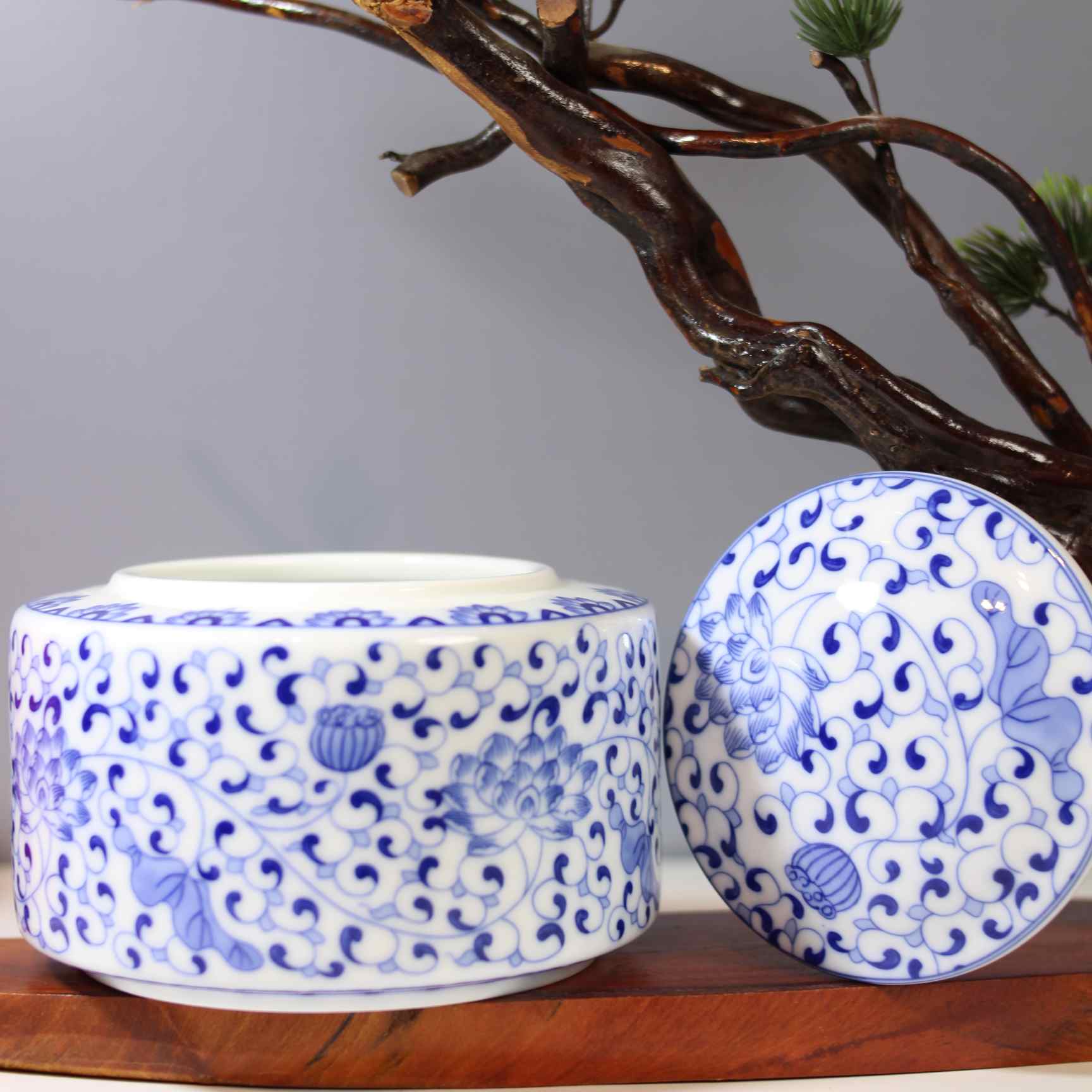 这个茶叶罐是青花瓷材质的。罐体整体以白色为底色,上面绘有蓝色的缠枝莲纹等传统中式花纹,花纹线条流畅,图案精美雅致,富有古典韵味。造型上是扁身带盖的样式,这种设计既美观又实用,方便存储茶叶,密封性较好,能够帮助茶叶防潮、防异味,更好地保存茶叶的品质 。搭配旁边古朴的树枝与翠绿的植物,营造出一种雅致的中式氛围。