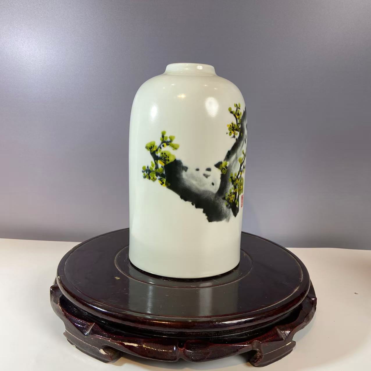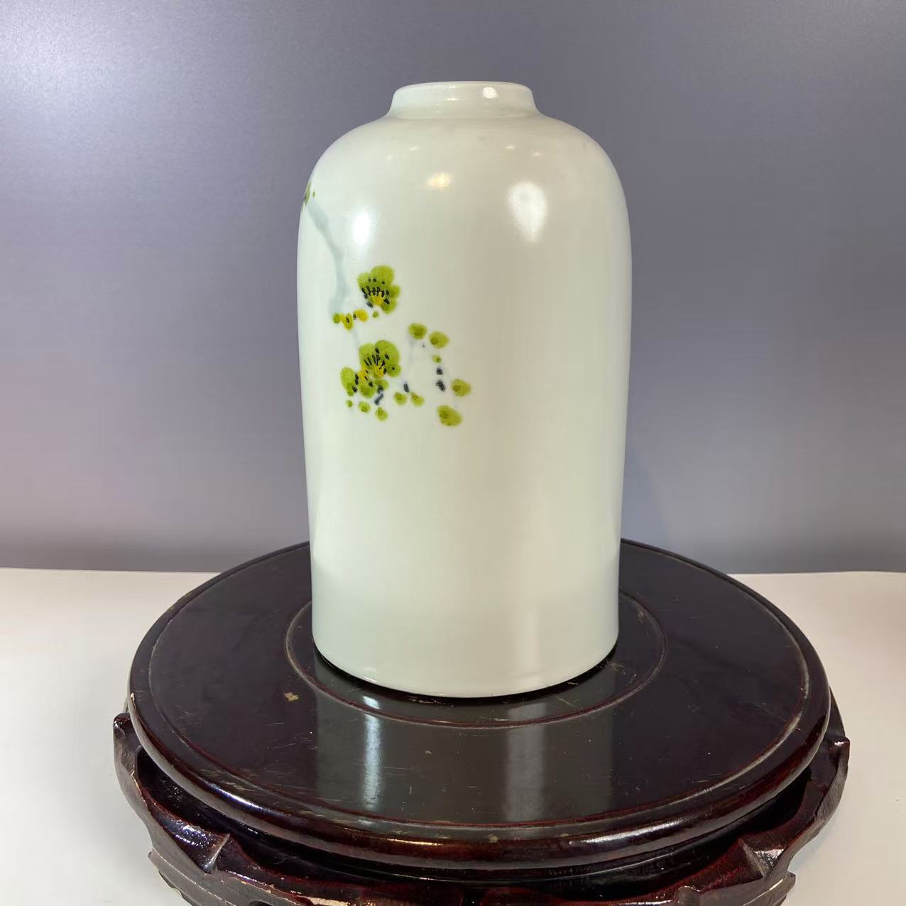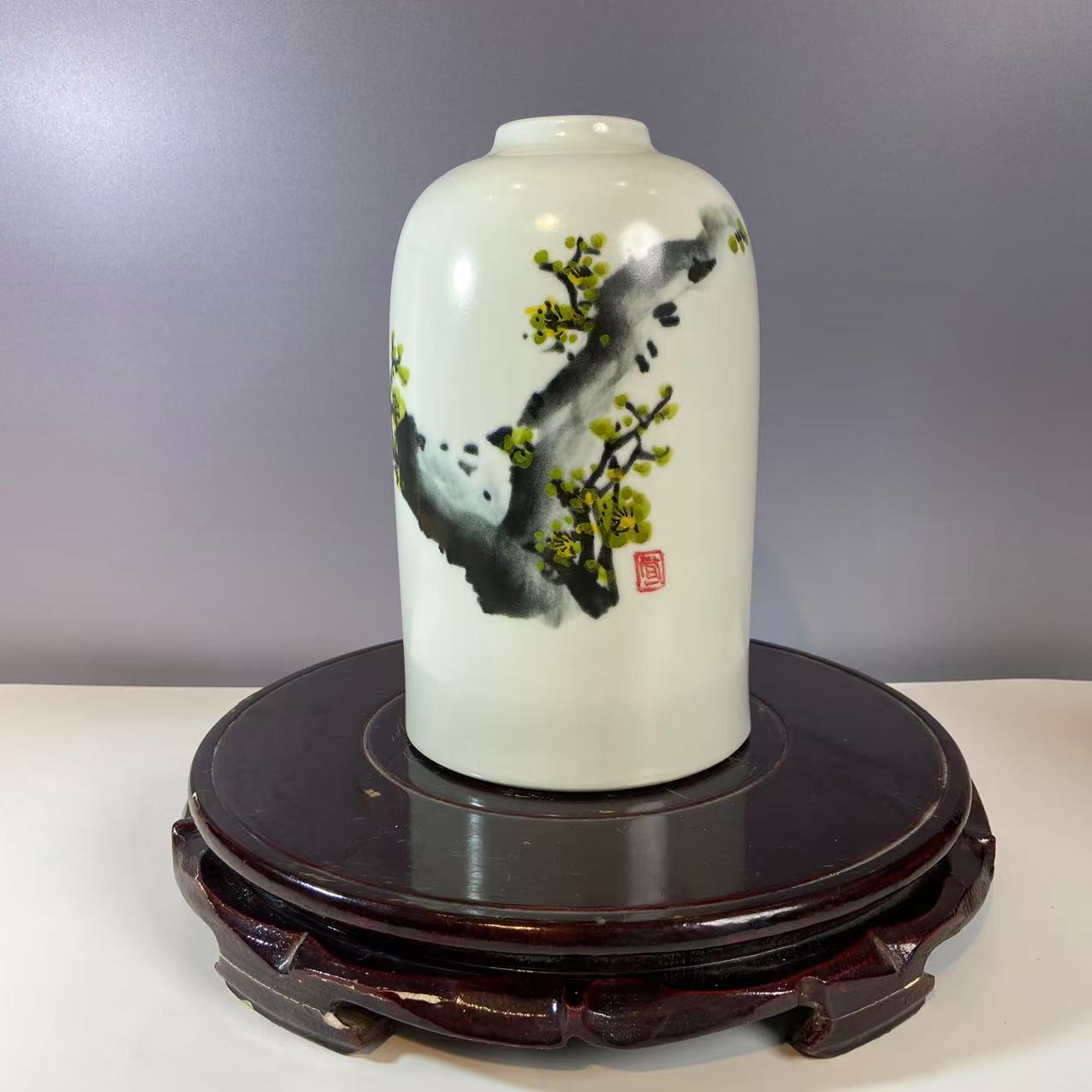 陶瓷花瓶,瓶身为白色,瓶身上绘有以墨色勾勒的树枝, 枝头点缀着黄绿色的花朵,营造出清新雅致的氛围。花瓶底部配有一个深色木质底座,古朴的底座与素雅的瓶身相得益彰,整体给人一种禅意、古朴的感觉,既可以作为花插使用,也适合摆放在餐桌、书房等作为装饰品。