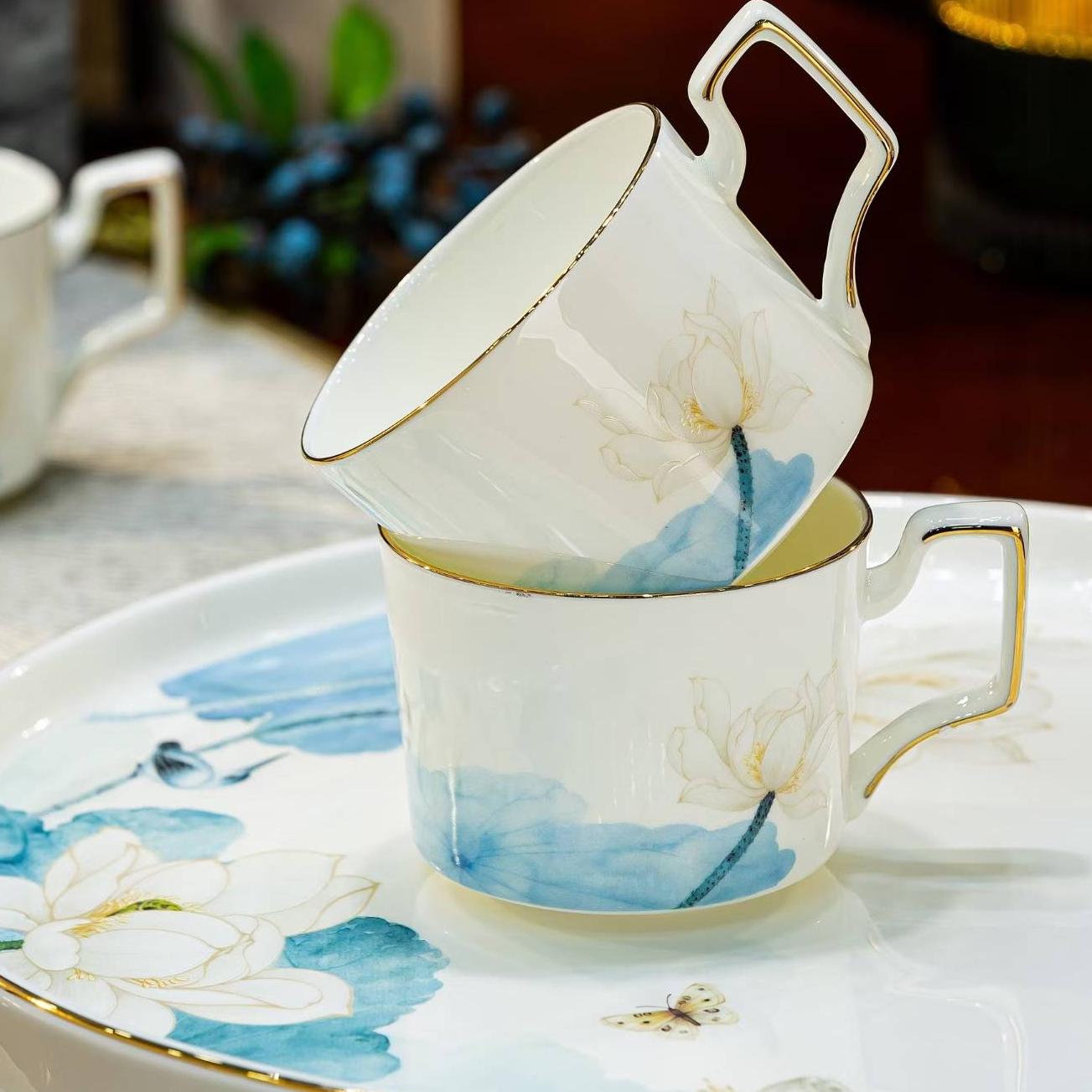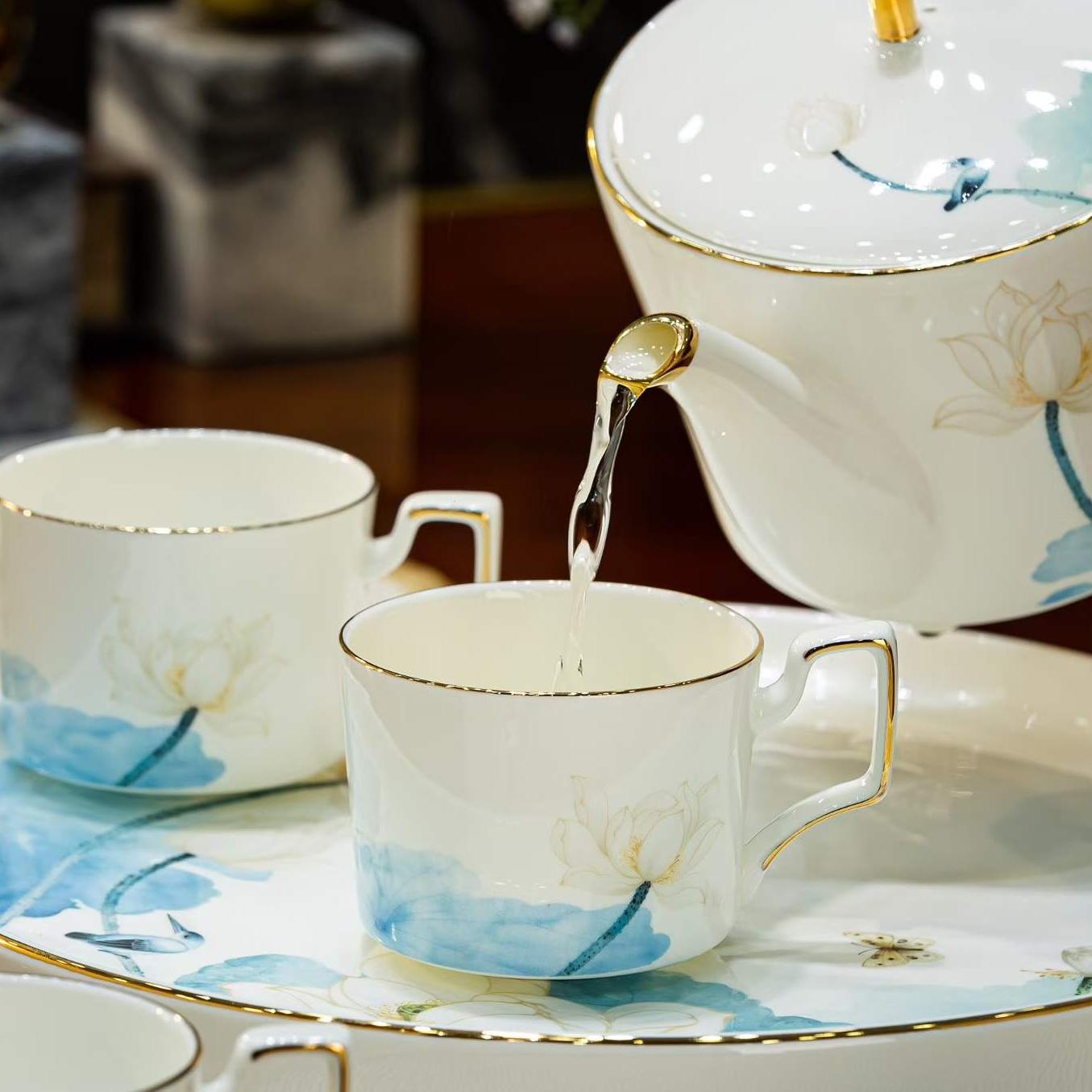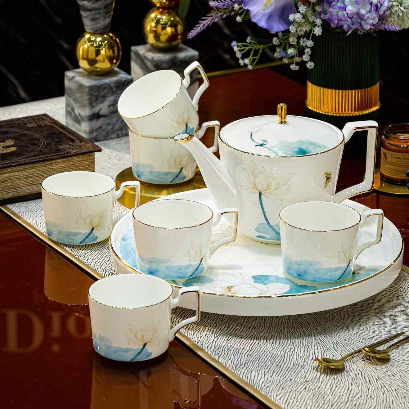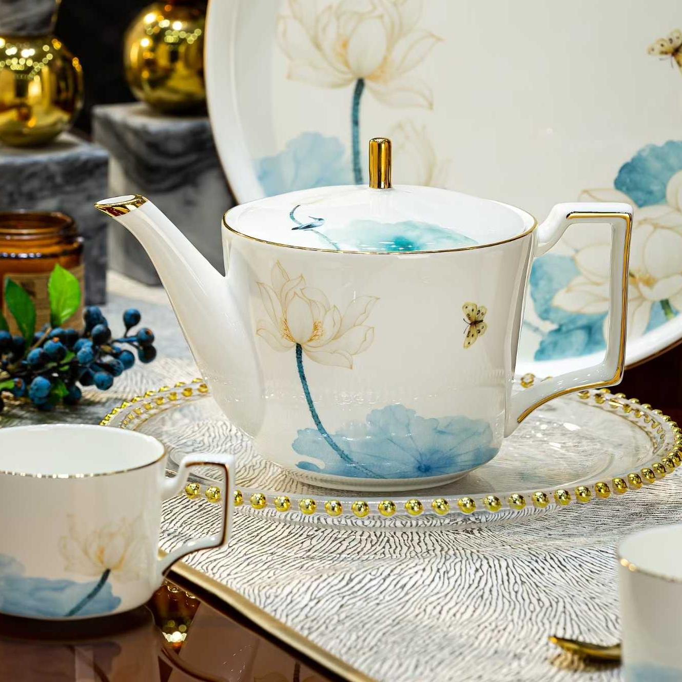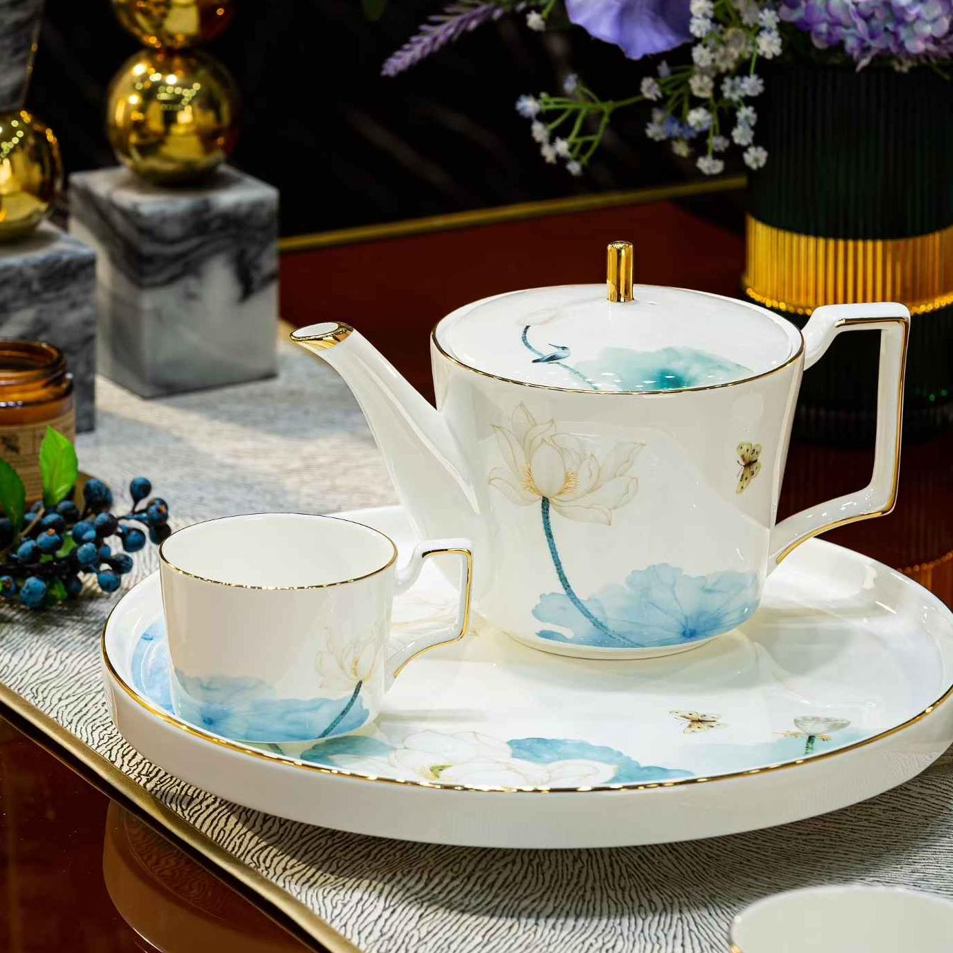 景德镇陶瓷材质。包含一把茶壶和多个茶杯,还配有一个圆形托盘。餐具主体为白色,上面绘有蓝白相间的莲花图案,边缘饰以金色描边,整体呈现出优雅的新中式风格