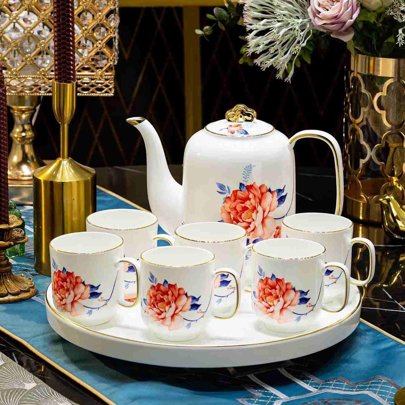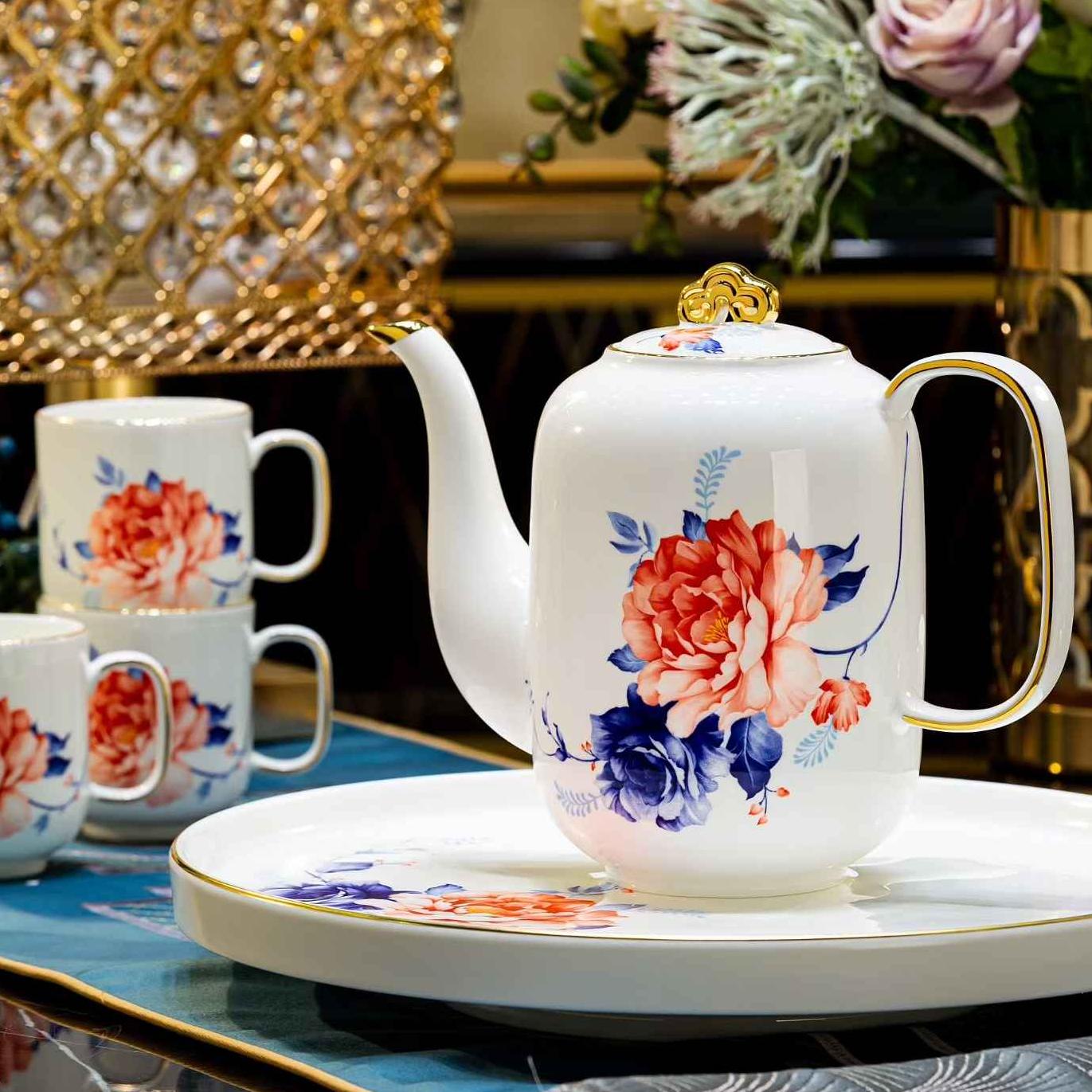 主体色调为纯净的白色,上面装饰着色彩艳丽的花卉图案,主要有粉色、红色的花朵搭配深蓝色的枝叶,花朵形态逼真,栩栩如生。茶壶的壶盖上有精致的金色装饰,部分杯口边缘可能还有细微的金色描边,增添了奢华感。