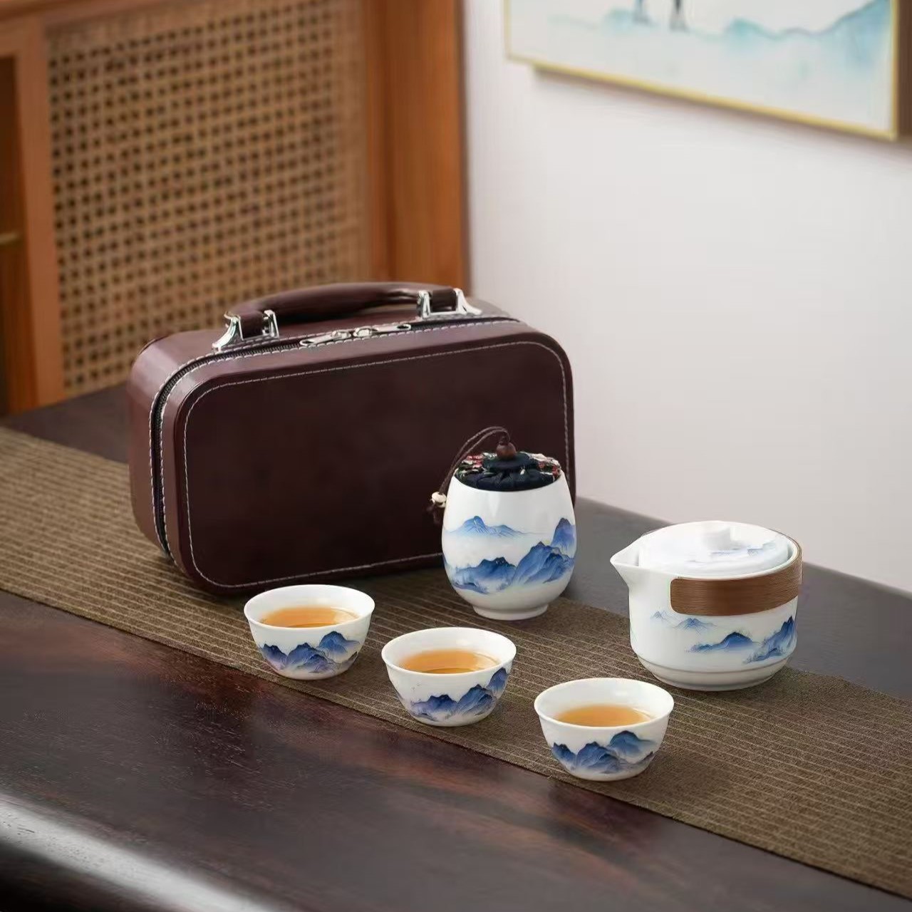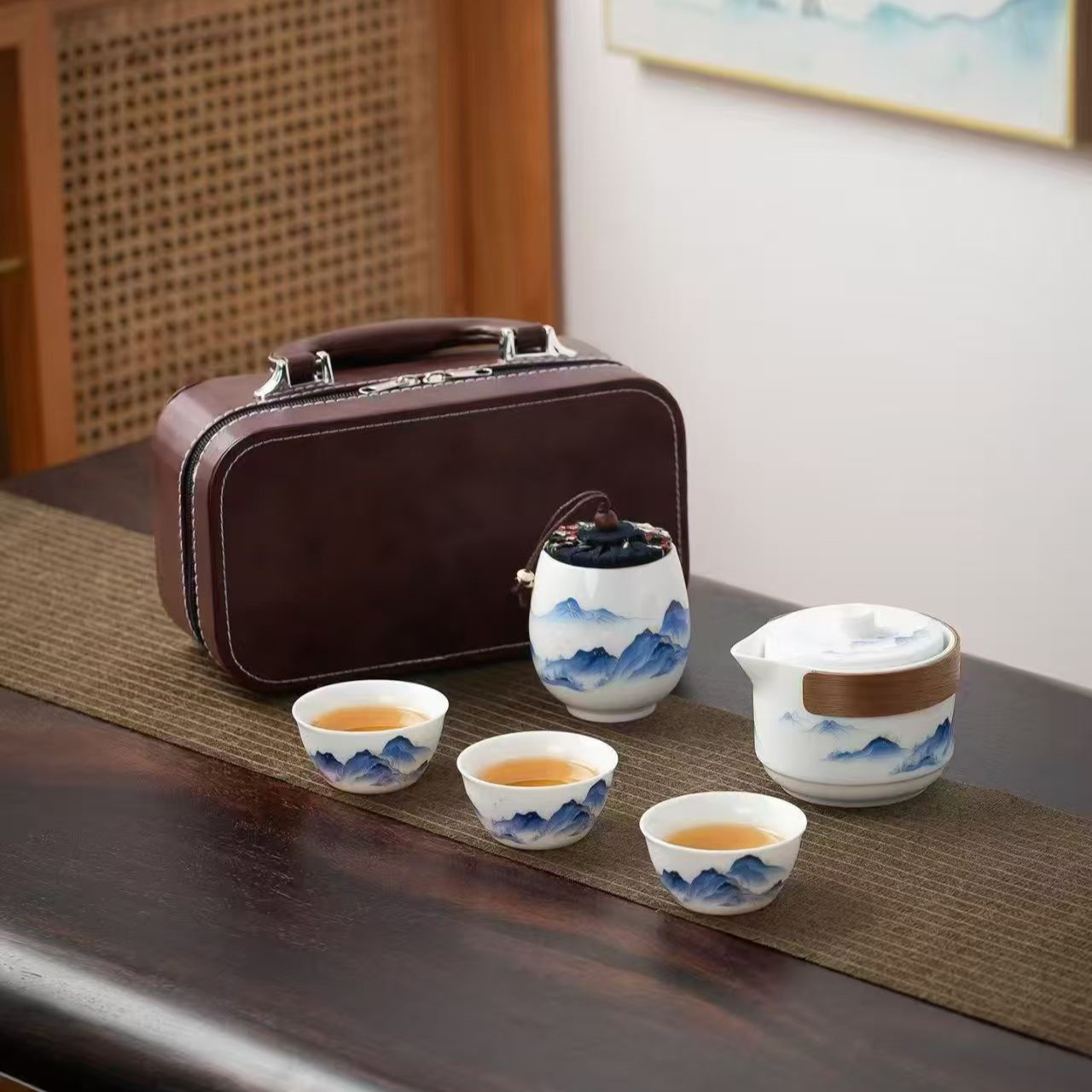 这个旅行茶具套装整体呈现新中式风格,以“水墨山水”为核心设计语言。套装包含1个容量280ml的陶瓷茶壶(高11cm),壶身采用青白瓷胎体,手绘靛蓝色层叠山峦图案,搭配竹制防烫壶盖;4个容量60ml的铃铛杯(高4.5cm),杯底同样饰有渐变山水纹,内壁施透明釉;1个带滤网的陶瓷茶叶罐(高10cm),罐口配真皮挂绳;以及1个深棕色疯马皮收纳箱(长25cm×宽18cm×高12cm),箱内有EVA定制凹槽固定茶具,提手处配黄铜五金件。整体釉面呈现哑光质感,山水图案采用分水皴法绘制,层次分明,收纳后总重量约1.2kg,适合户外携带与中式茶席场景。