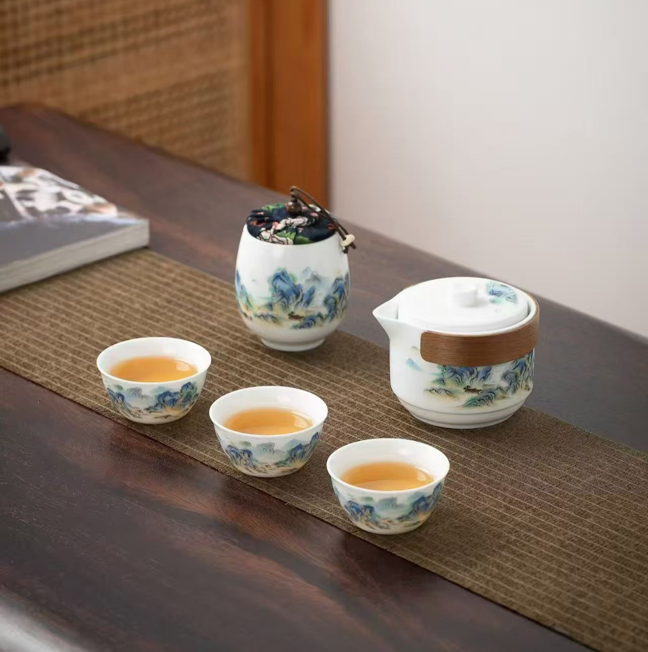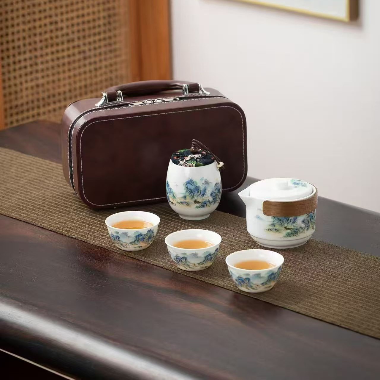 这个旅行茶具套装延续了新中式水墨山水设计语言,在原有基础上增加了更多细节巧思。整套包含1个容量300ml的陶瓷盖碗(高9.5cm),碗身采用釉下五彩工艺绘制青绿山水,外侧嵌套可拆卸竹制隔热圈;4个容量65ml的仰钟杯(高5cm),杯壁呈现渐变山水纹,杯底暗藏“山水:阴刻印章;1个带布艺防尘盖的陶瓷茶叶罐(高11cm),罐身绘有写意云纹;配套深棕色疯马皮收纳箱内部升级为绒布内衬,箱体侧面增设便携提手。釉面采用无光白瓷质地,山水图案通过分水晕染技法呈现云雾层次感,适合商务差旅与户外茶事活动。