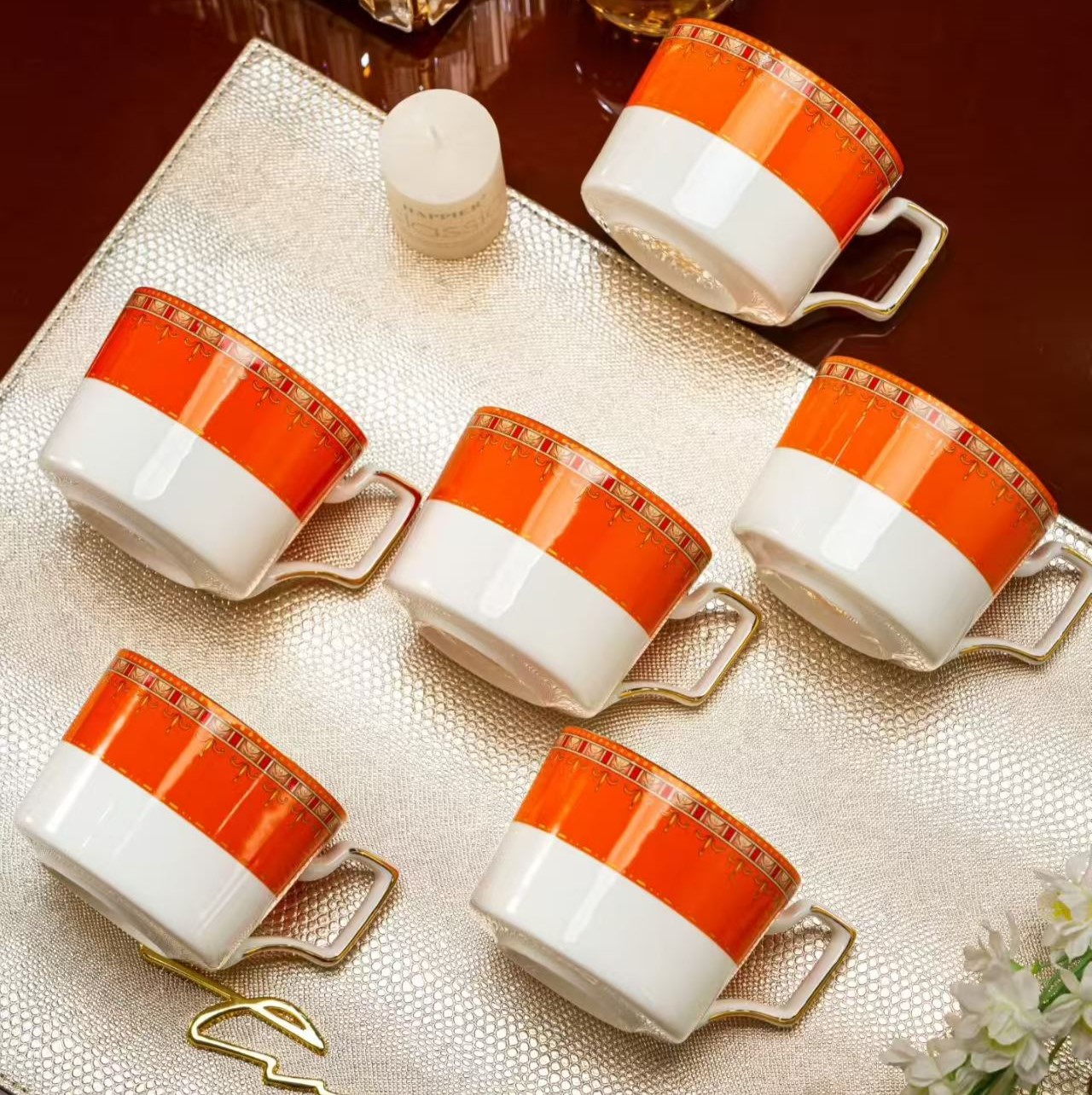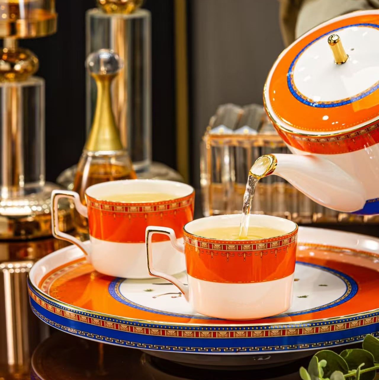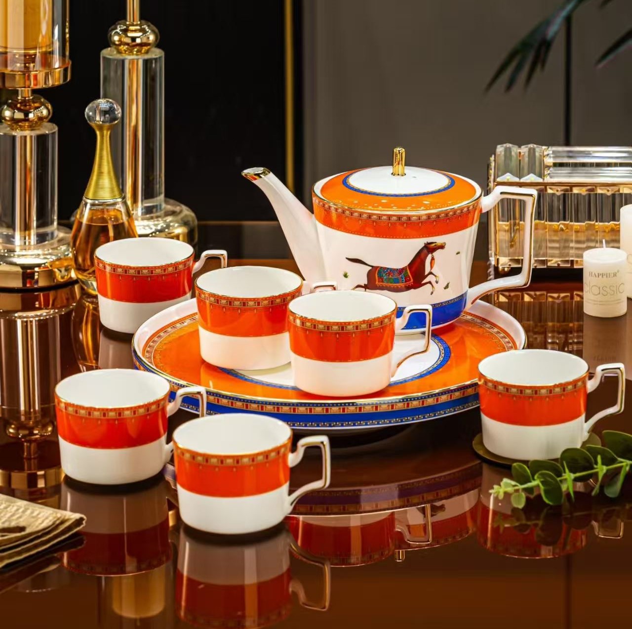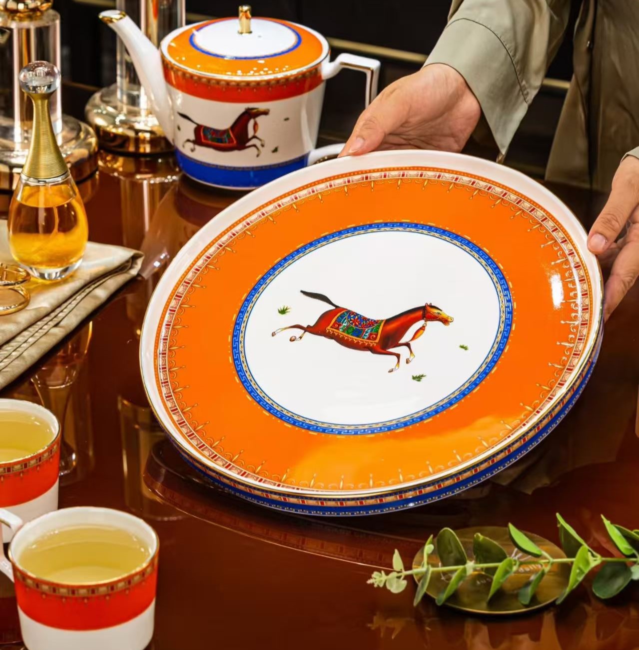 这套茶具展现了典型的爱马仕视觉美学,融合法式奢华与东方茶道元素。整套包含1个陶瓷茶壶,壶身主体为象牙白瓷,上部环绕爱马仕标志性橙色珐琅釉带,边缘饰有蓝色描金回纹边框,杯身采用橙白双色拼接设计,杯口与杯底均有金色希腊回纹装饰,手柄为镀金金属材质;2个的圆形托盘,托盘中央绘有爱马仕经典“奔腾骏马”图案,马身装饰几何纹样与花卉元素,外圈以橙色珐琅为底,点缀蓝色与金色的万字纹边框。全系列采用釉上彩与镀金工艺,图案细节由手工绘制,瓷胎选用20%骨粉含量的高级骨瓷,整体呈现出浓郁的品牌辨识度与宫廷式奢华质感。