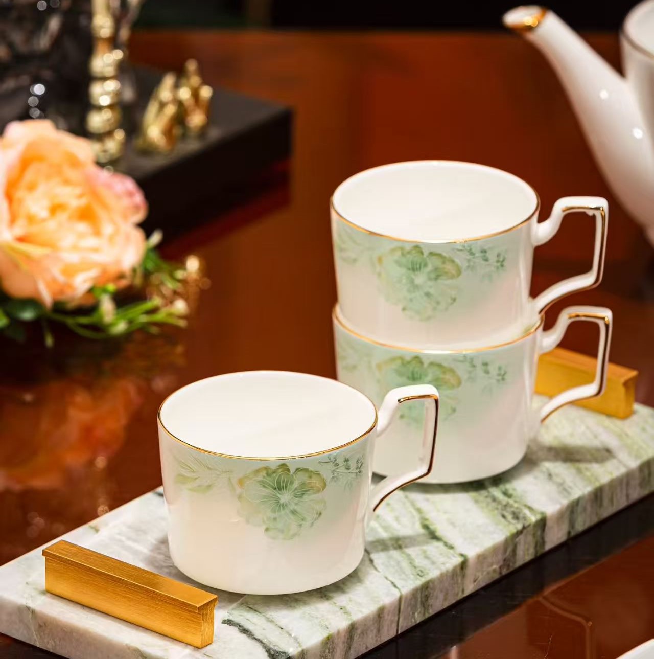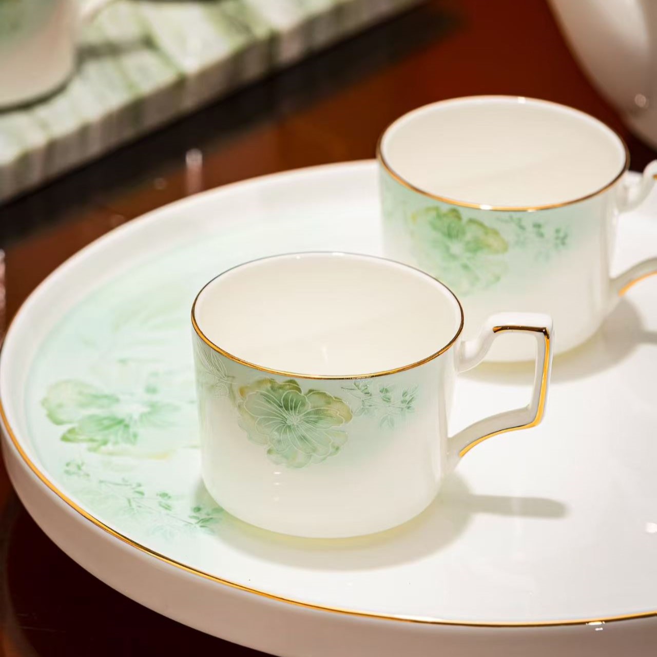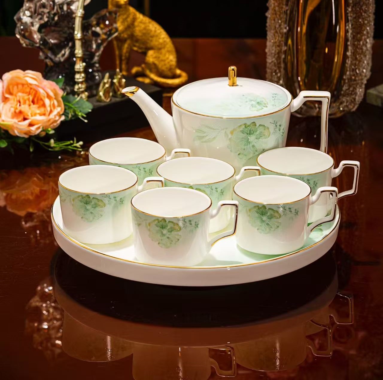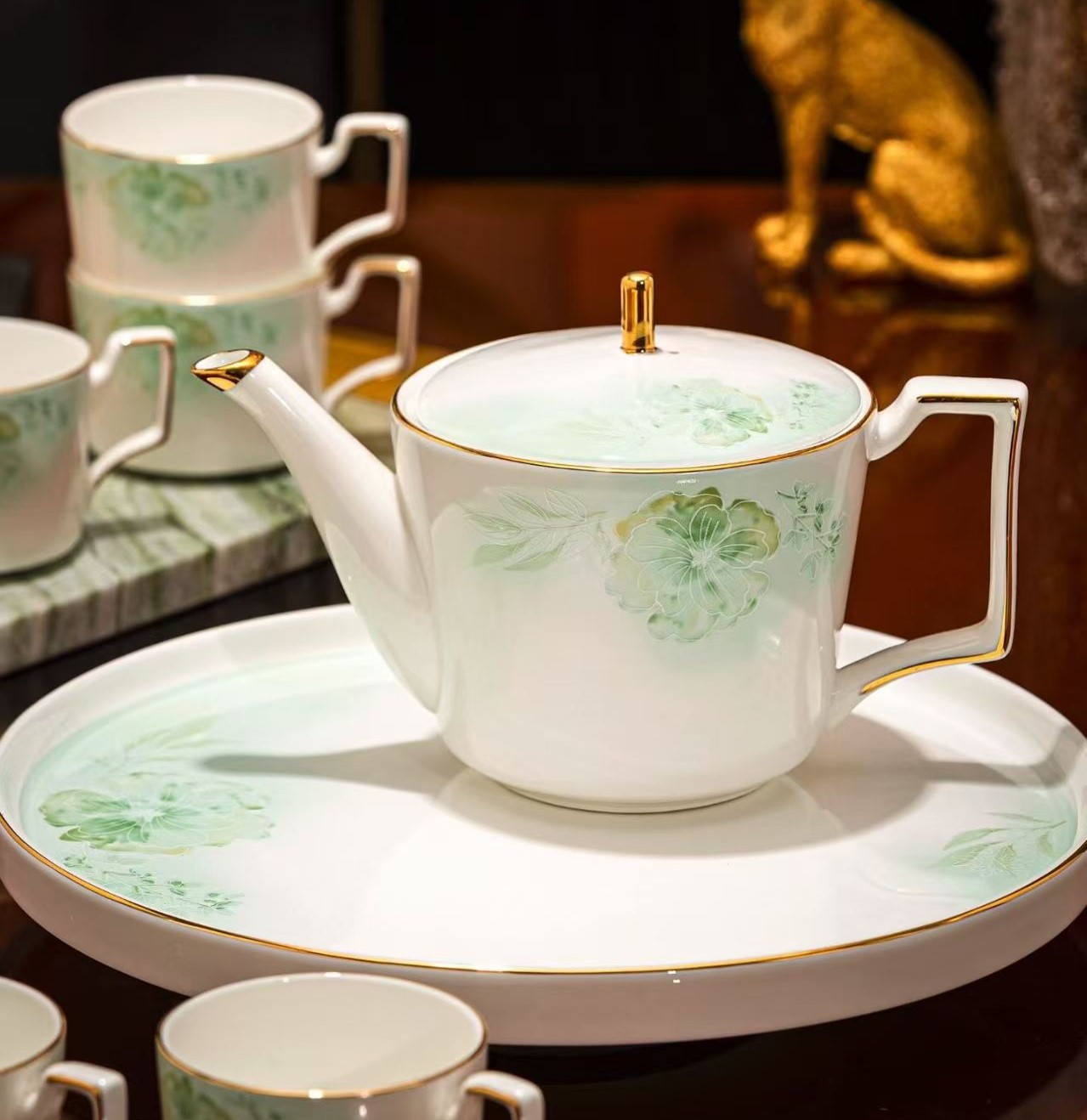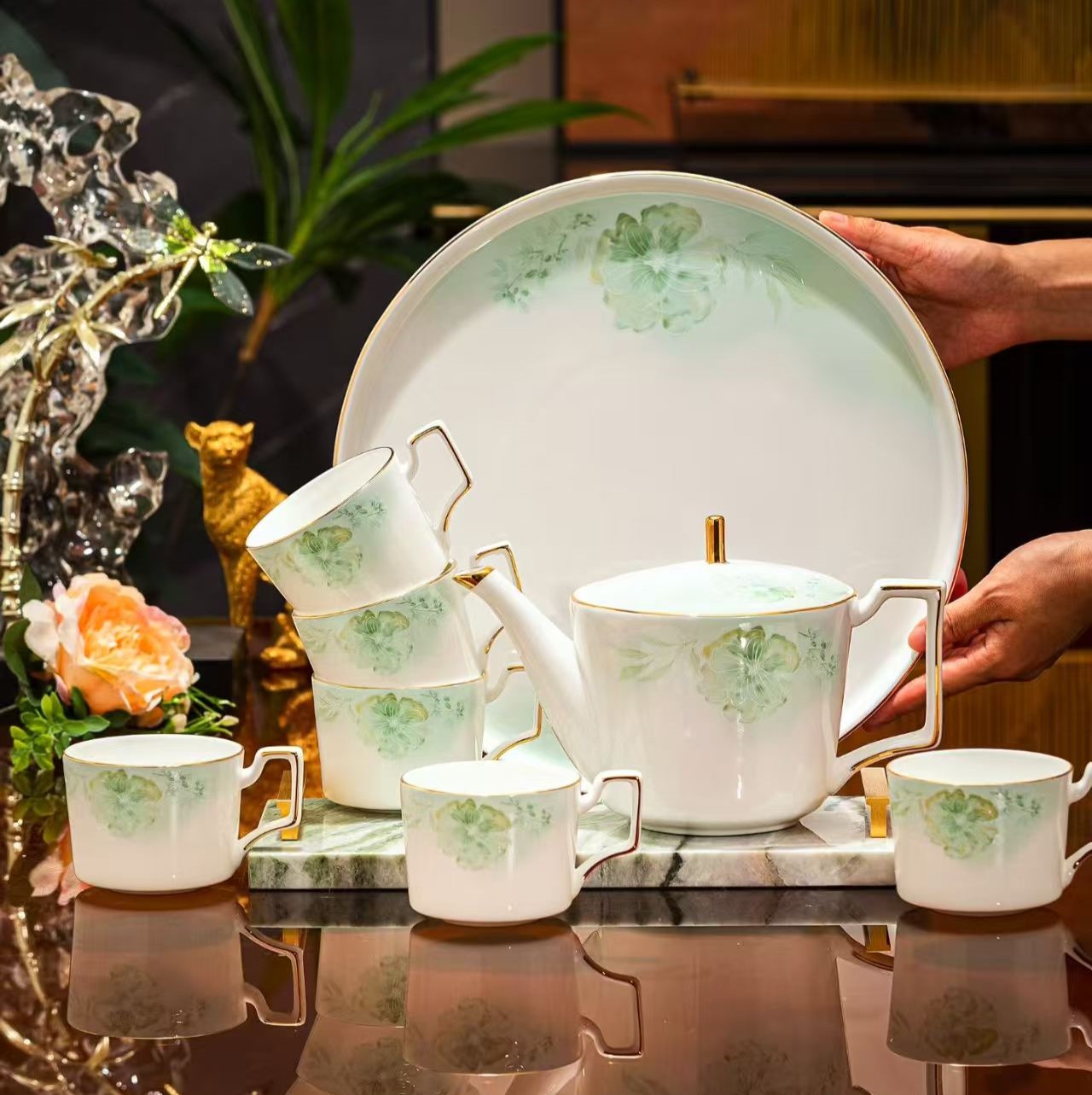 30元3串陶瓷吊坠这套茉莉花开套组茶具极具优雅气质与艺术美感。 材质:采用优质骨瓷为原料,瓷质细腻通透,色泽温润, 拥有良好的保温性与观赏价值。 设计:以清新淡雅的绿色系为主色调,手绘的茉莉花图案栩栩如生, 仿佛能让人闻到茉莉花香。茉莉花及枝叶的细节丰富,呈现出自然生动的姿态。茶具边缘有精致的描金工艺, 金色线条勾勒出轮廓,为整体增添了一丝奢华感,让茶具在简约中透着高贵 。茶壶、茶杯的把手设计贴合人体工程学, 握持舒适。 构成:包含1个茶壶,容量适中,方便日常泡茶;搭配多个茶杯, 满足家庭或小型聚会的需求;还配有托盘, 不仅实用,方便端拿茶具,而且能起到很好的装饰作用,让茶具摆放更加整齐美观 。 适用场景:无论是自己在家中享受悠闲的下午茶时光, 还是招待亲朋好友,这套茉莉花开套组茶具都能营造出温馨、高雅的氛围,是品质生活的体现 。