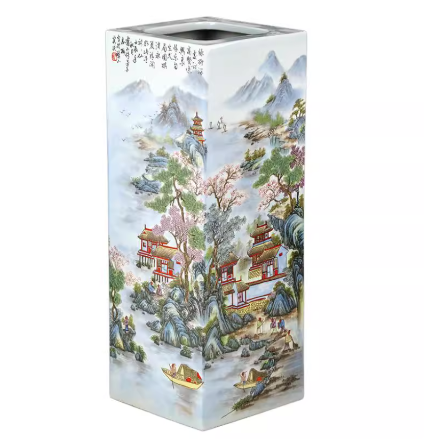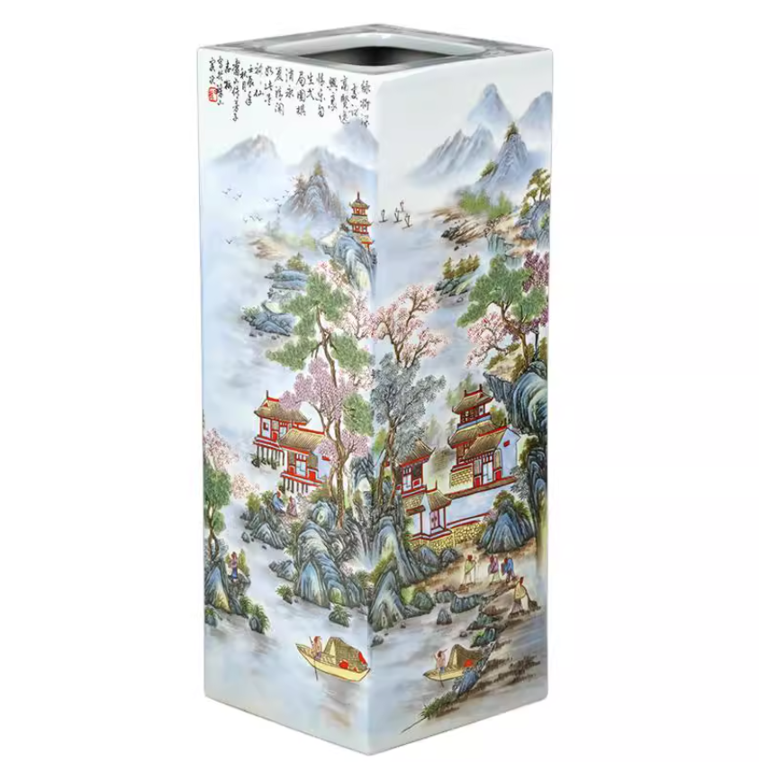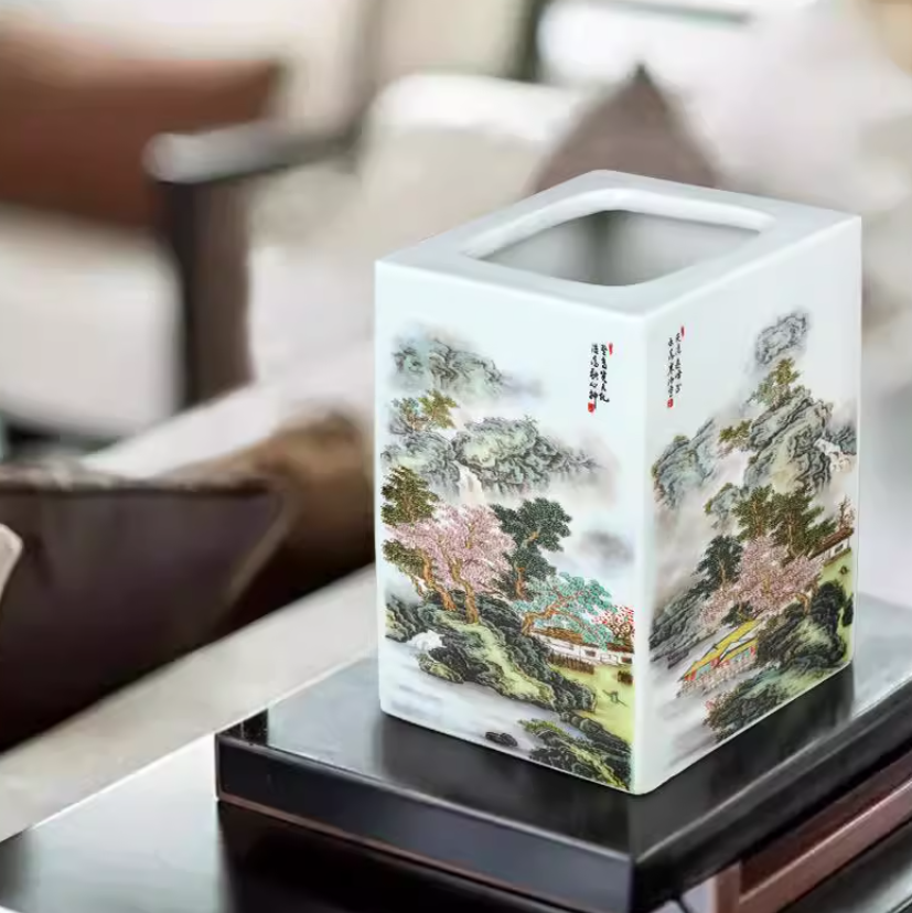 首页 / 艺术陈设瓷 / 陶瓷镶器 / 景德镇陶瓷器粉彩镶器摆件中式简约品家居书房办公室桌面书画笔筒(粉彩山水镶器小号高20cm)