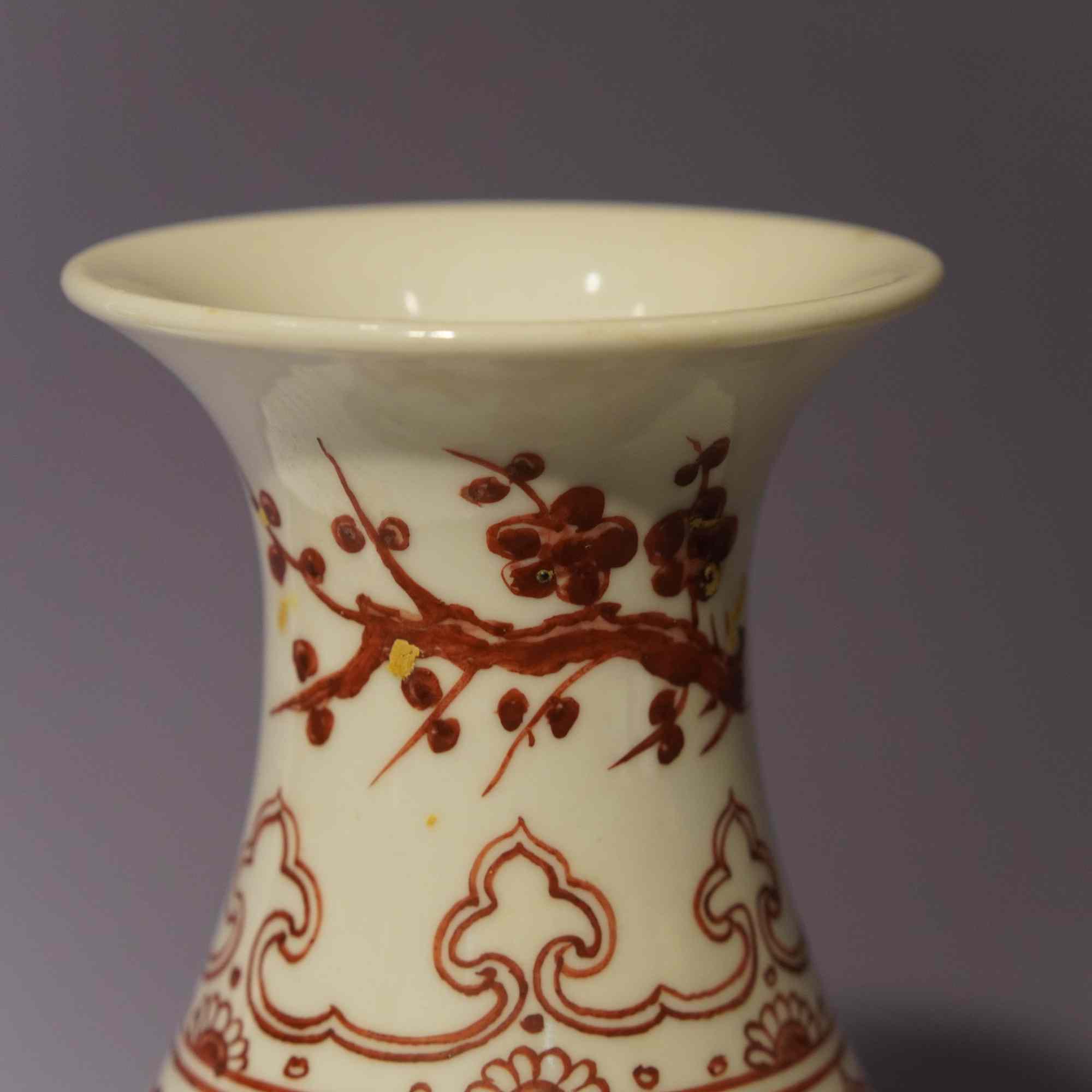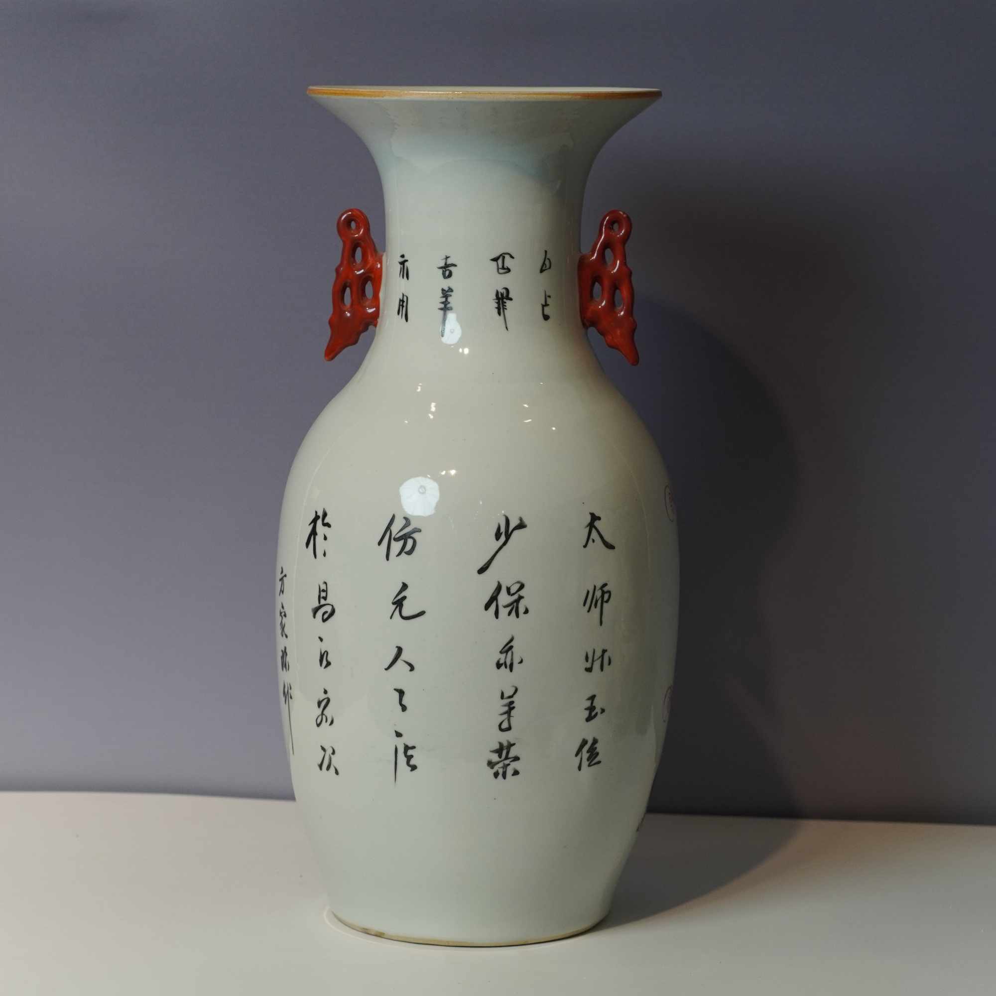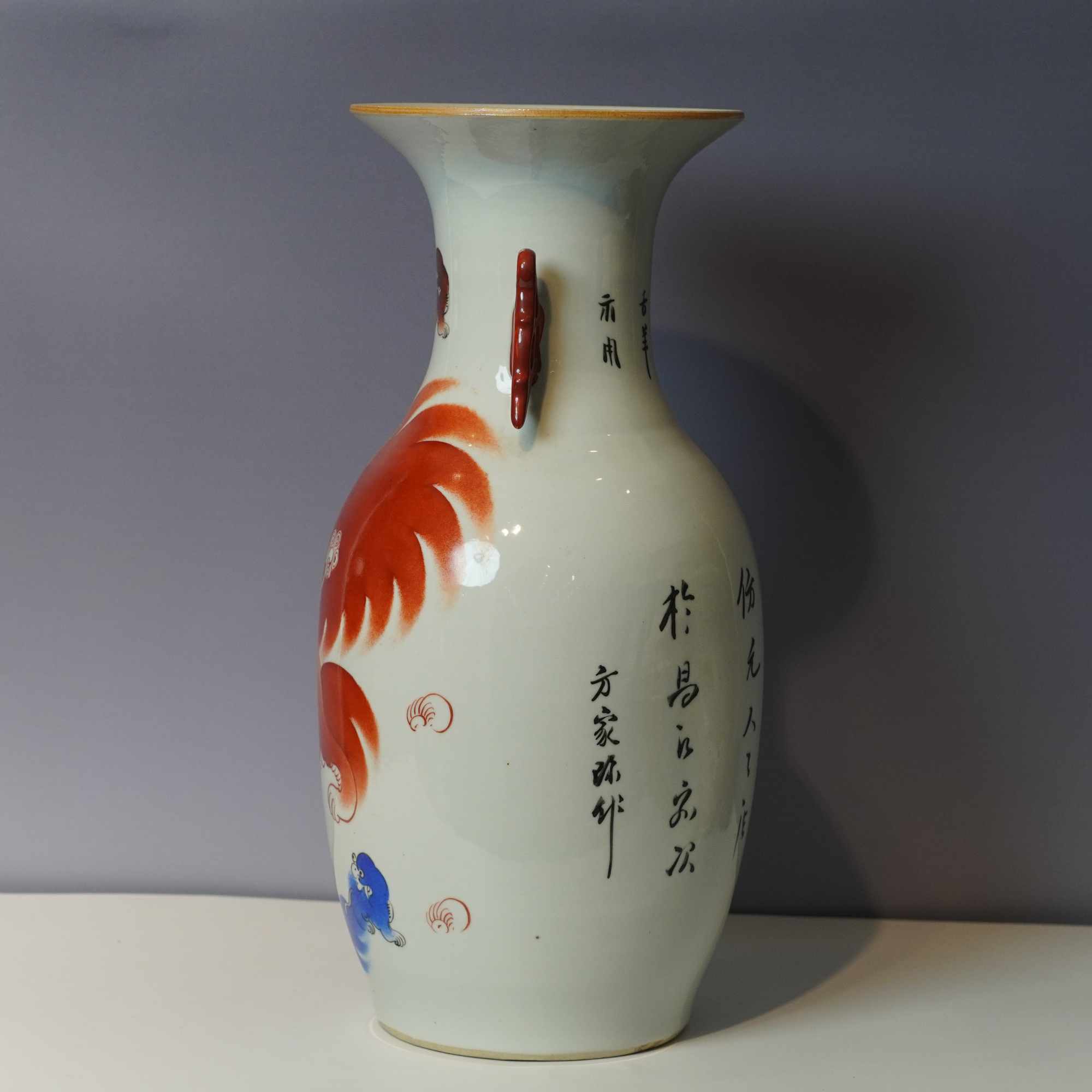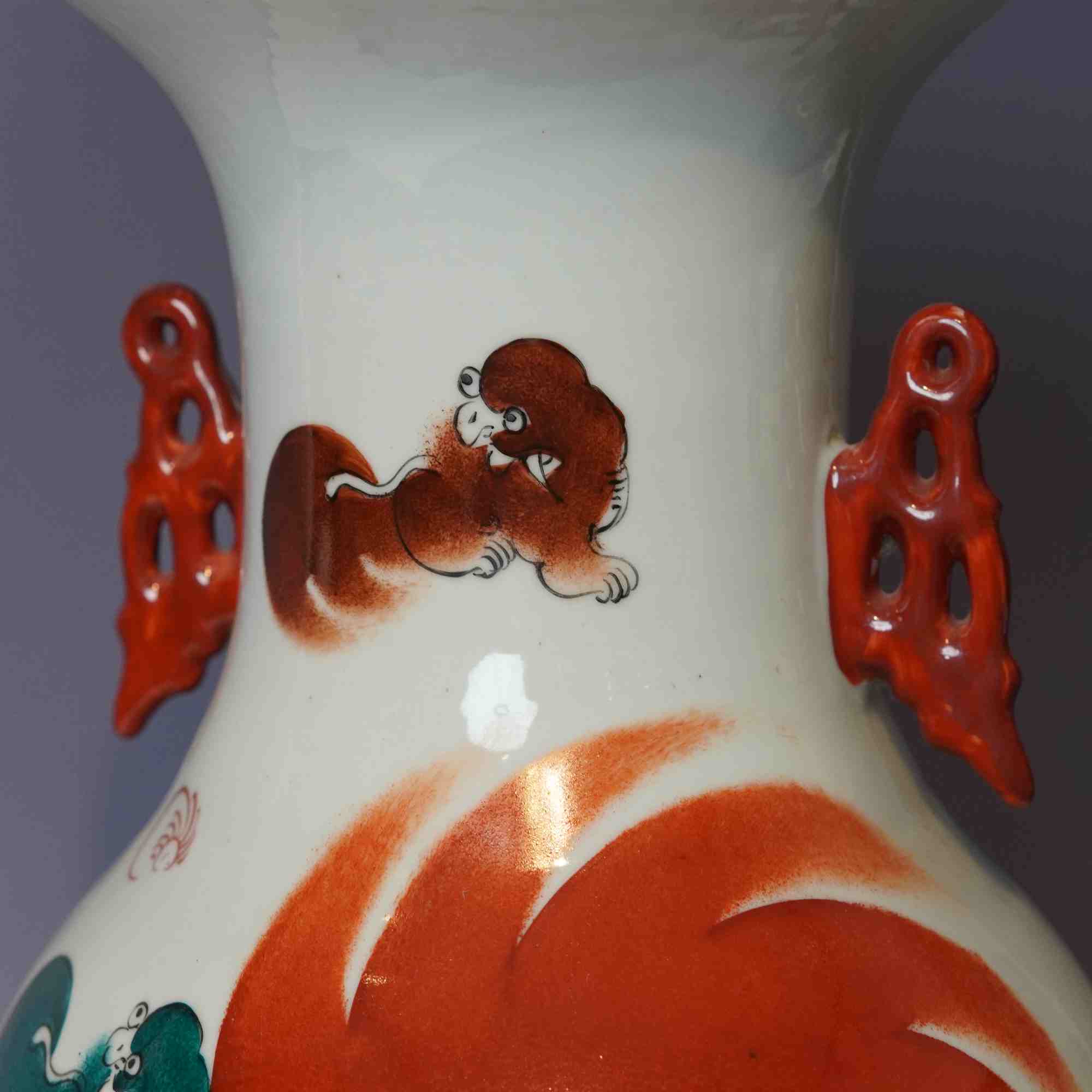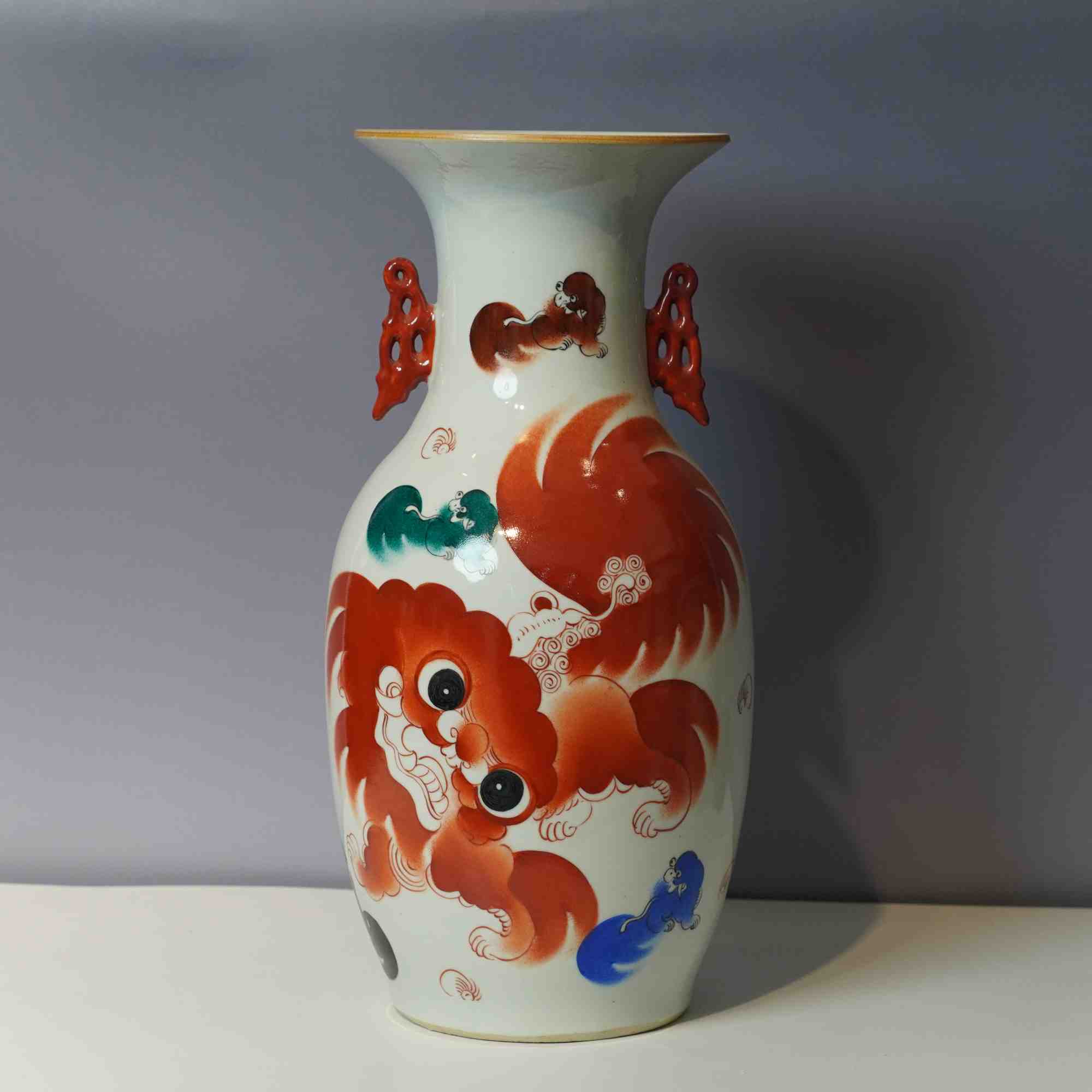 撇口、长颈、鼓腹、圈足,颈部设对称红釉如意形耳。主体以五彩绘 “太狮少狮” 图,红狮形态生动,搭配绿、蓝等彩饰祥云,色彩浓艳明快。“太狮少狮” 谐音 “太师少师”,蕴含官运亨通、子嗣兴旺的吉祥寓意,是清代粉彩、五彩瓷中常见的吉祥题材仿古演绎 。