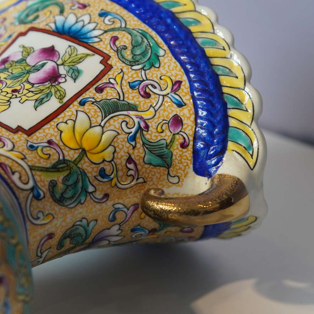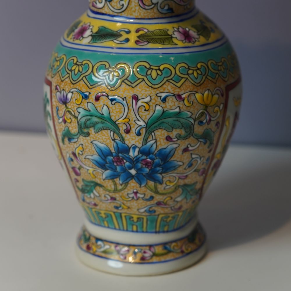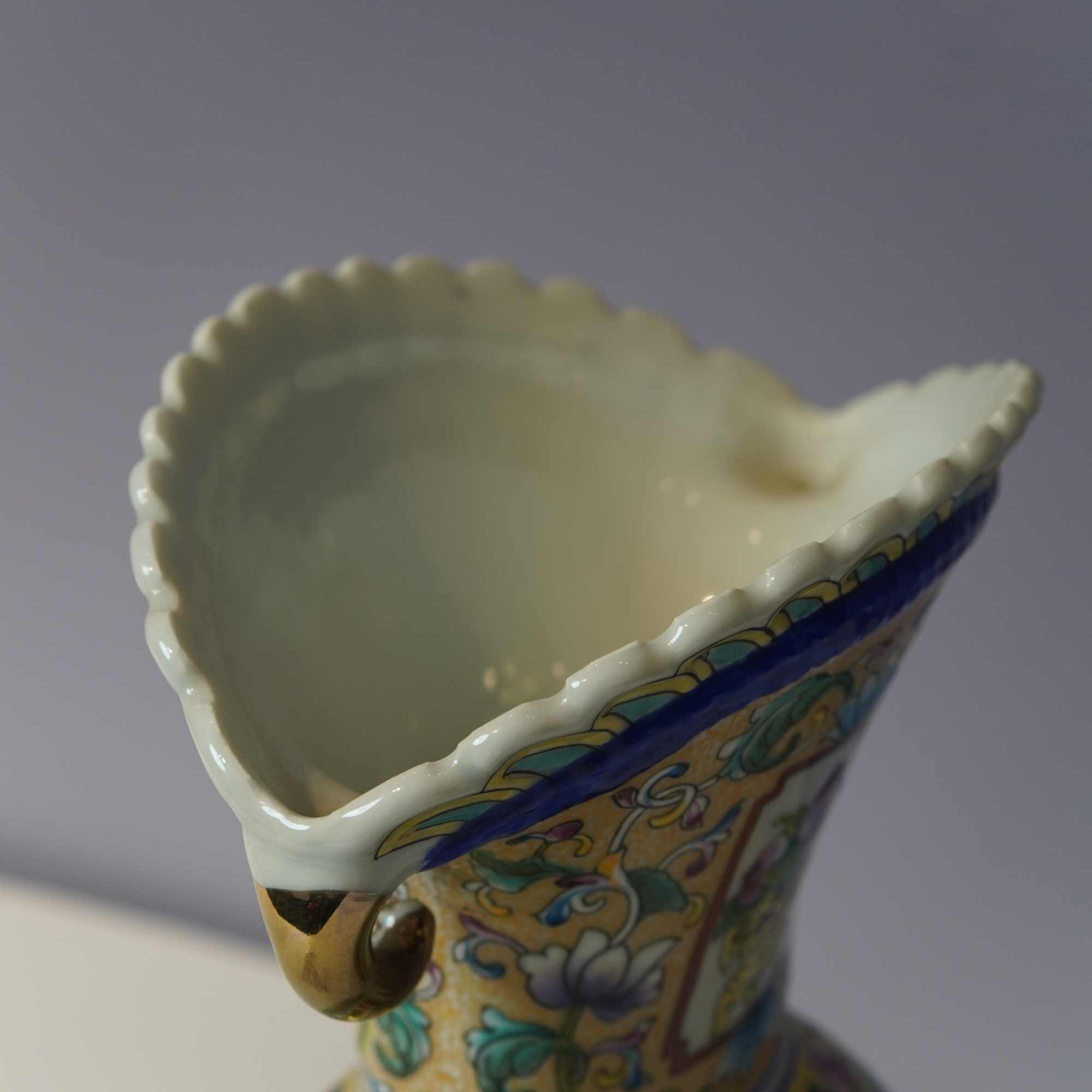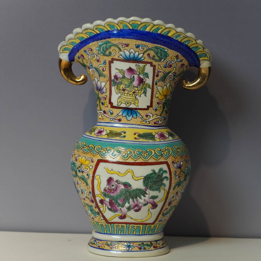 瓶口呈别致的花瓣状,如同绽放的花朵,赋予器物灵动之感;颈部两侧弯曲的金色耳饰,恰似灵动的触角,不仅增加了器物的立体感,更增添了华贵的气质。瓶身线条流畅,从颈部向下逐渐丰腴,至底部又自然收窄,整体轮廓优美,展现出端庄稳重又不失灵动的姿态。