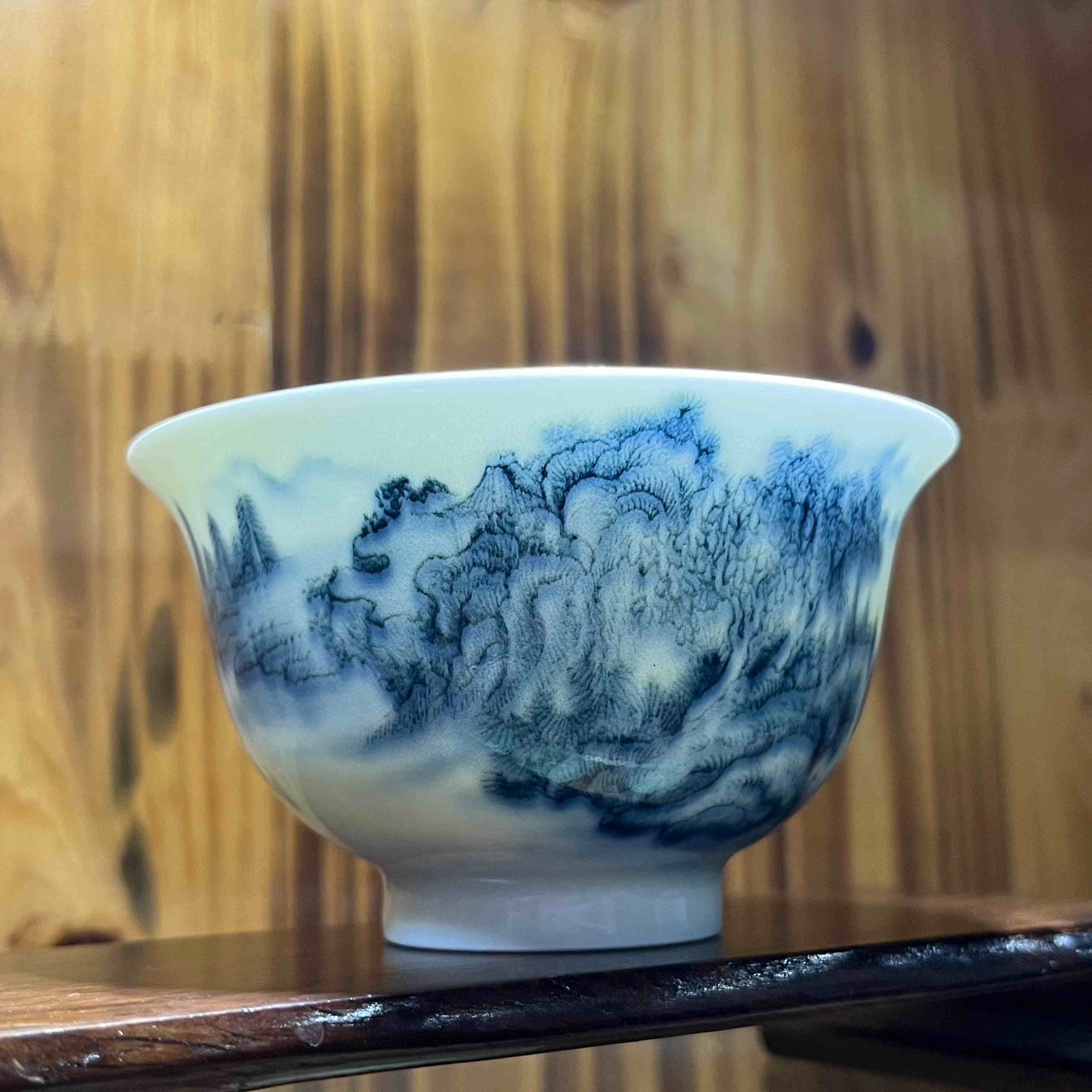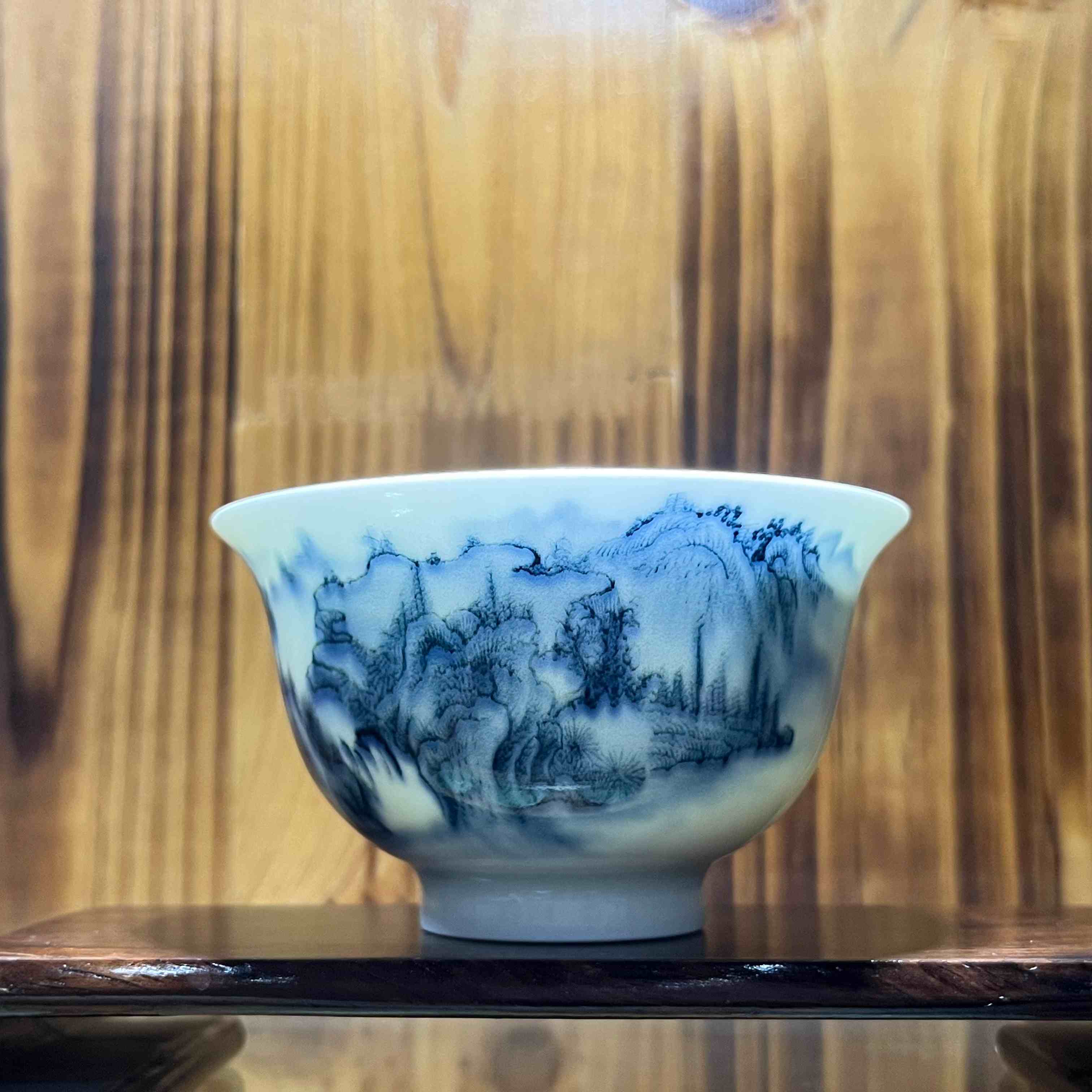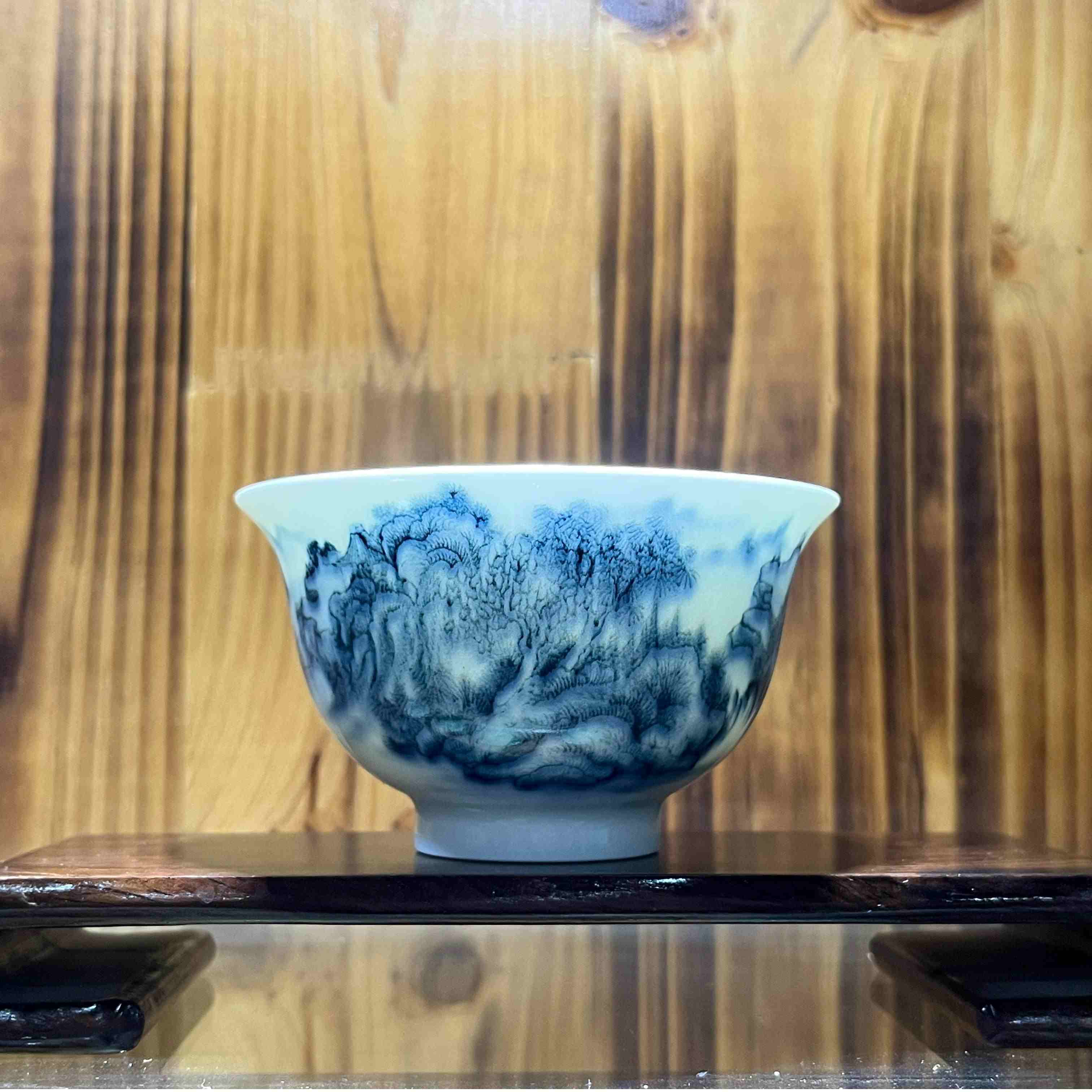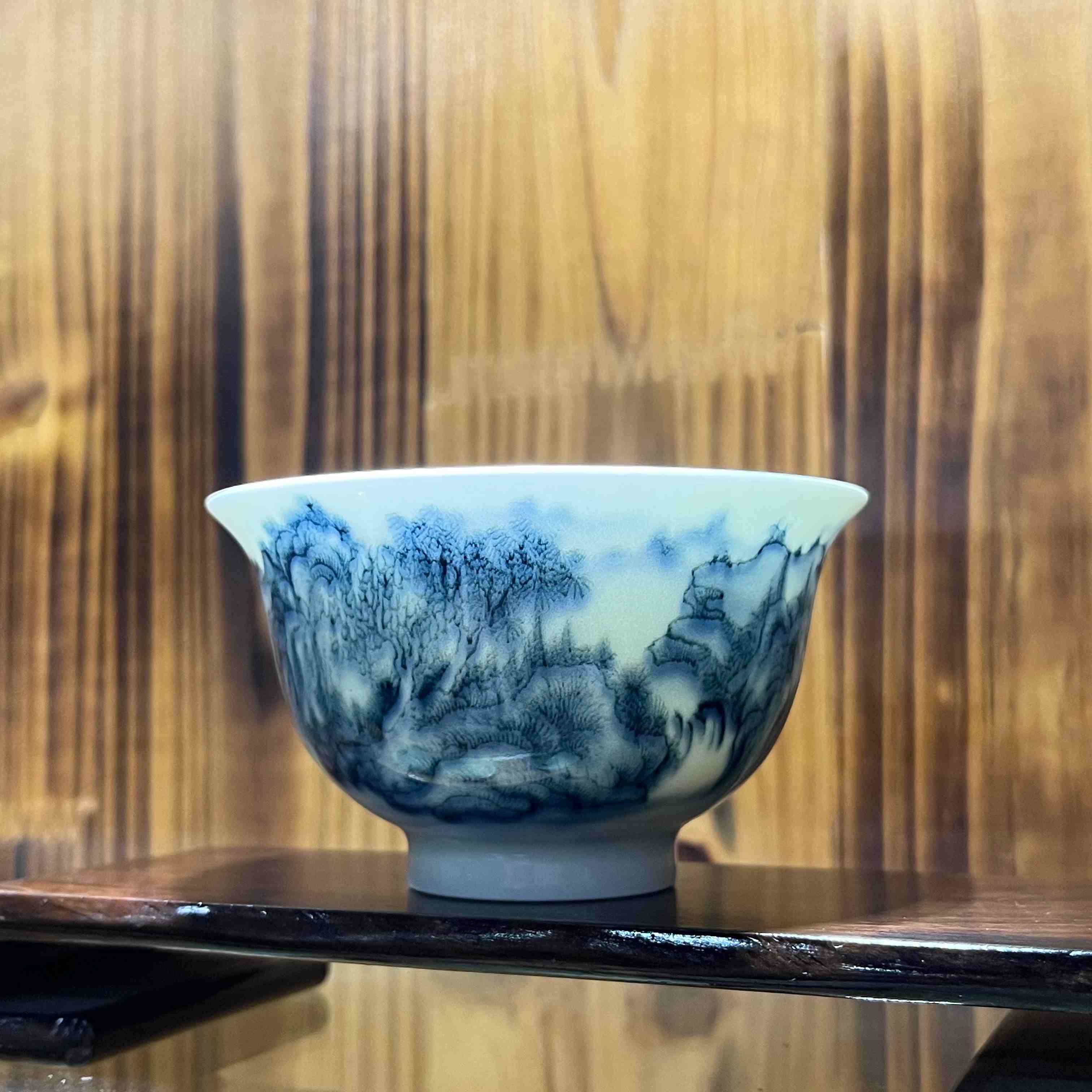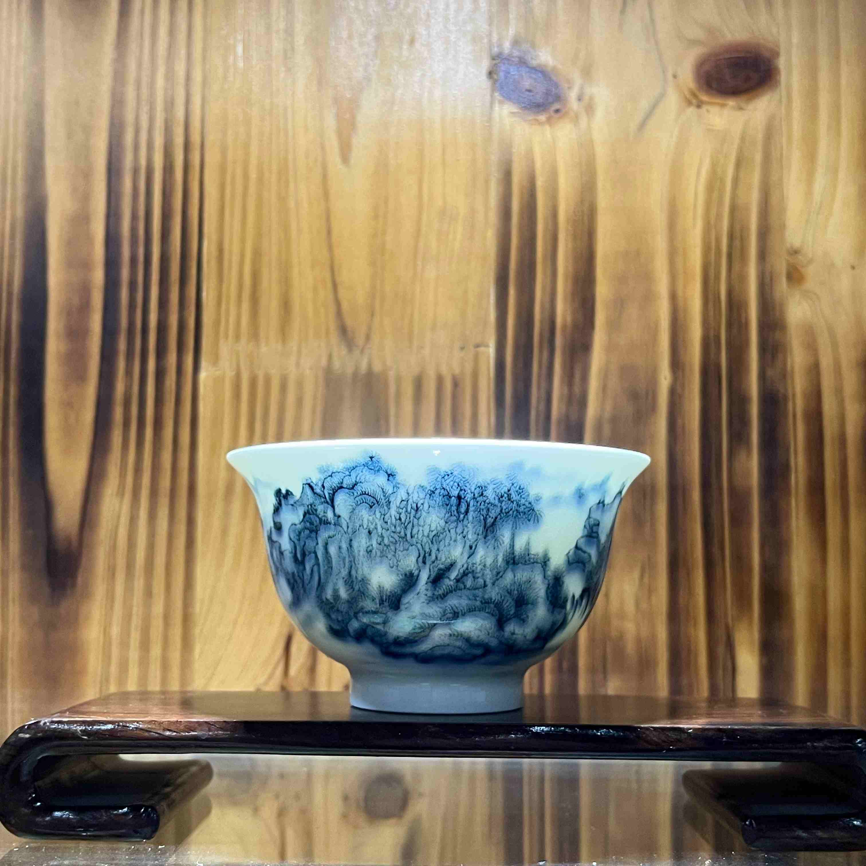 首页 / 茶器 / 主人杯系列 / 手绘山水青花杯 (杯口:8.1cm 高:5.3cm 容量:125ml)