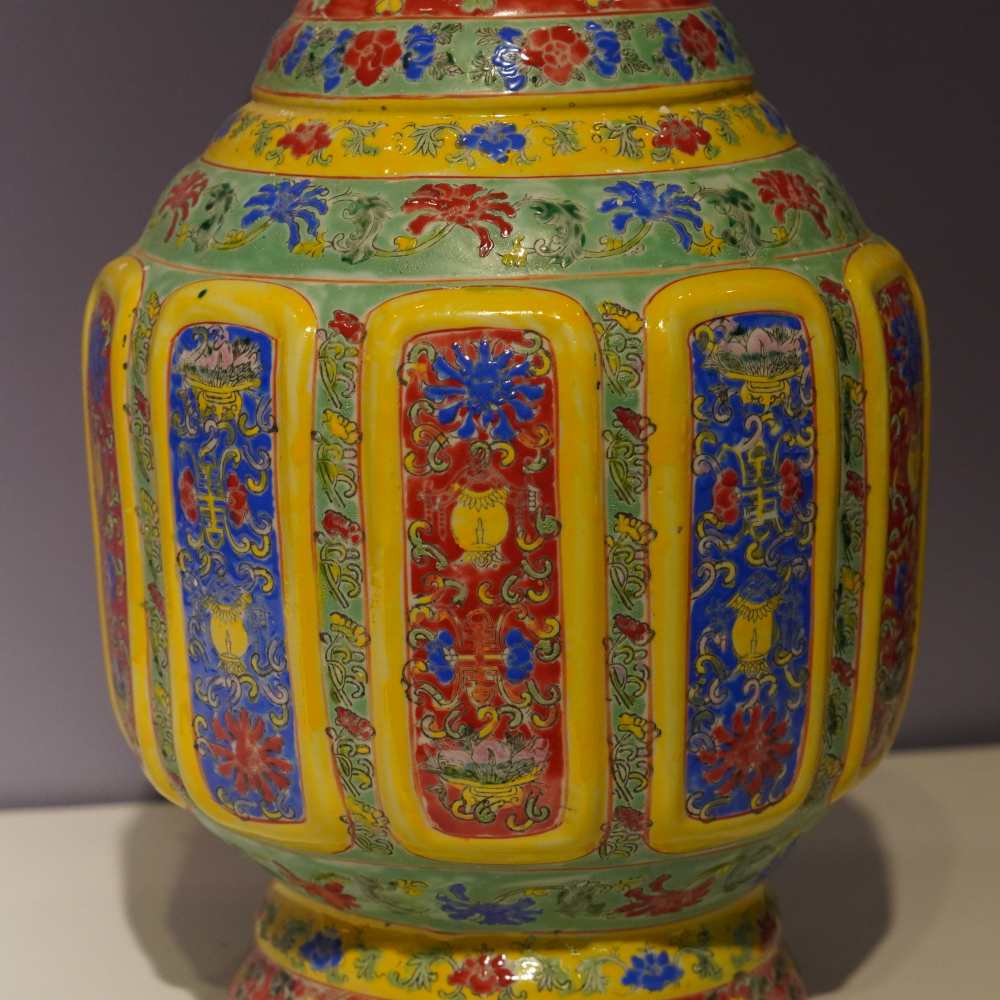 腹部是瓶身装饰的重点区域,被分割成多个竖向的开光,每个开光内都绘制有精美的图案,图案包括花卉、博古等题材,色彩搭配和谐,绘画精细,展现出高超的绘画技艺。开光之间以黄色的边框分隔,进一步突出了开光内的图案