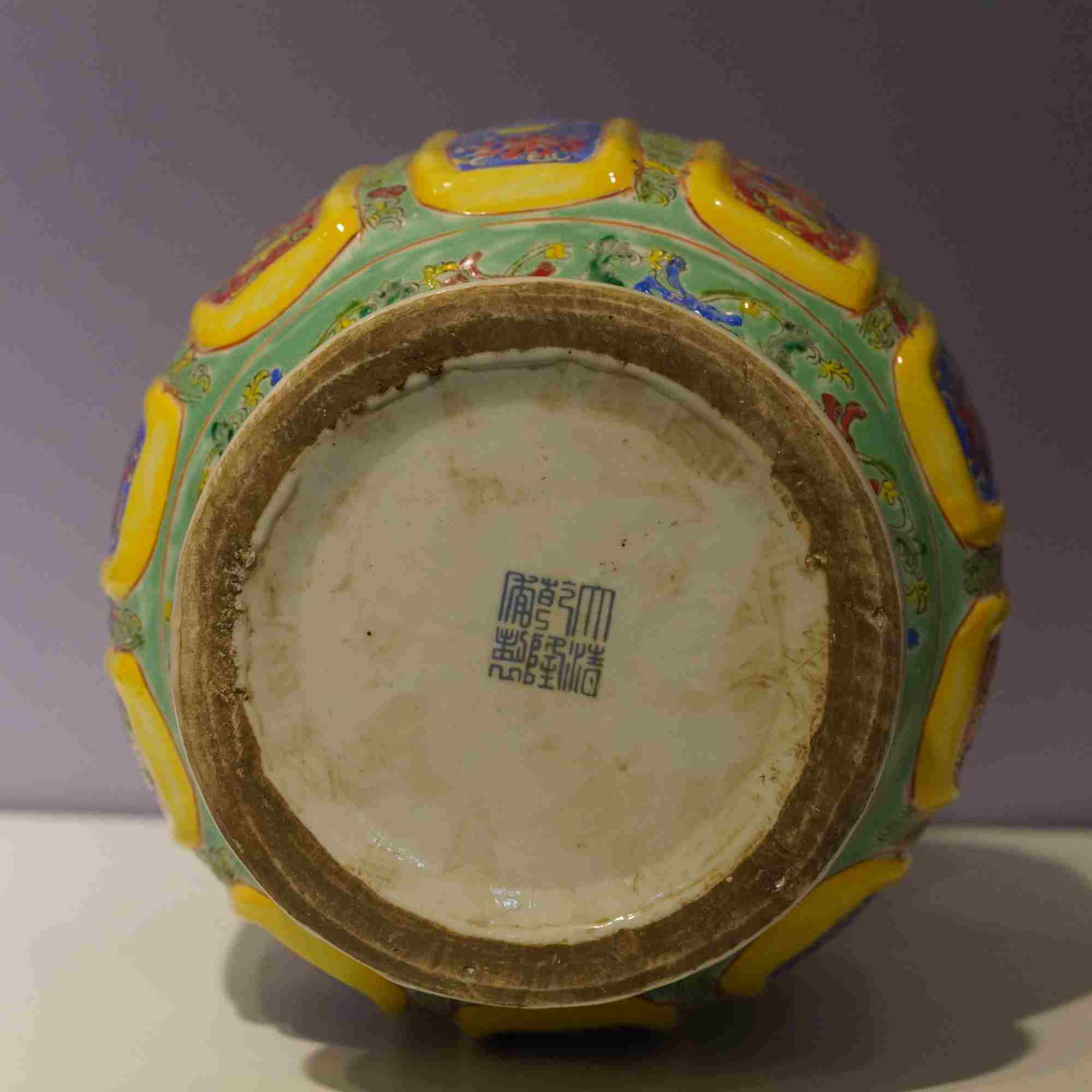 2. 运用了极为繁复且绚丽的珐琅彩工艺。瓶身以绿彩为底色,其上满布各种精美的纹饰。颈部与肩部有多道彩色的装饰带,饰以花卉、卷草等纹样,色彩鲜艳丰富,包括红、黄、蓝、绿等多种色调,相互映衬,对比强烈。