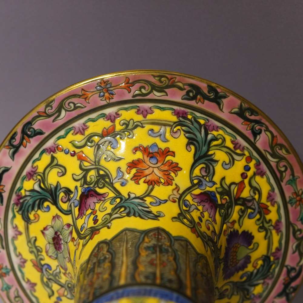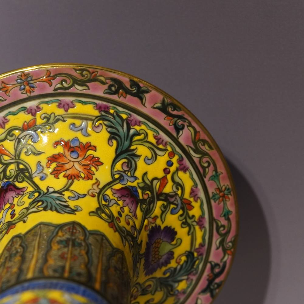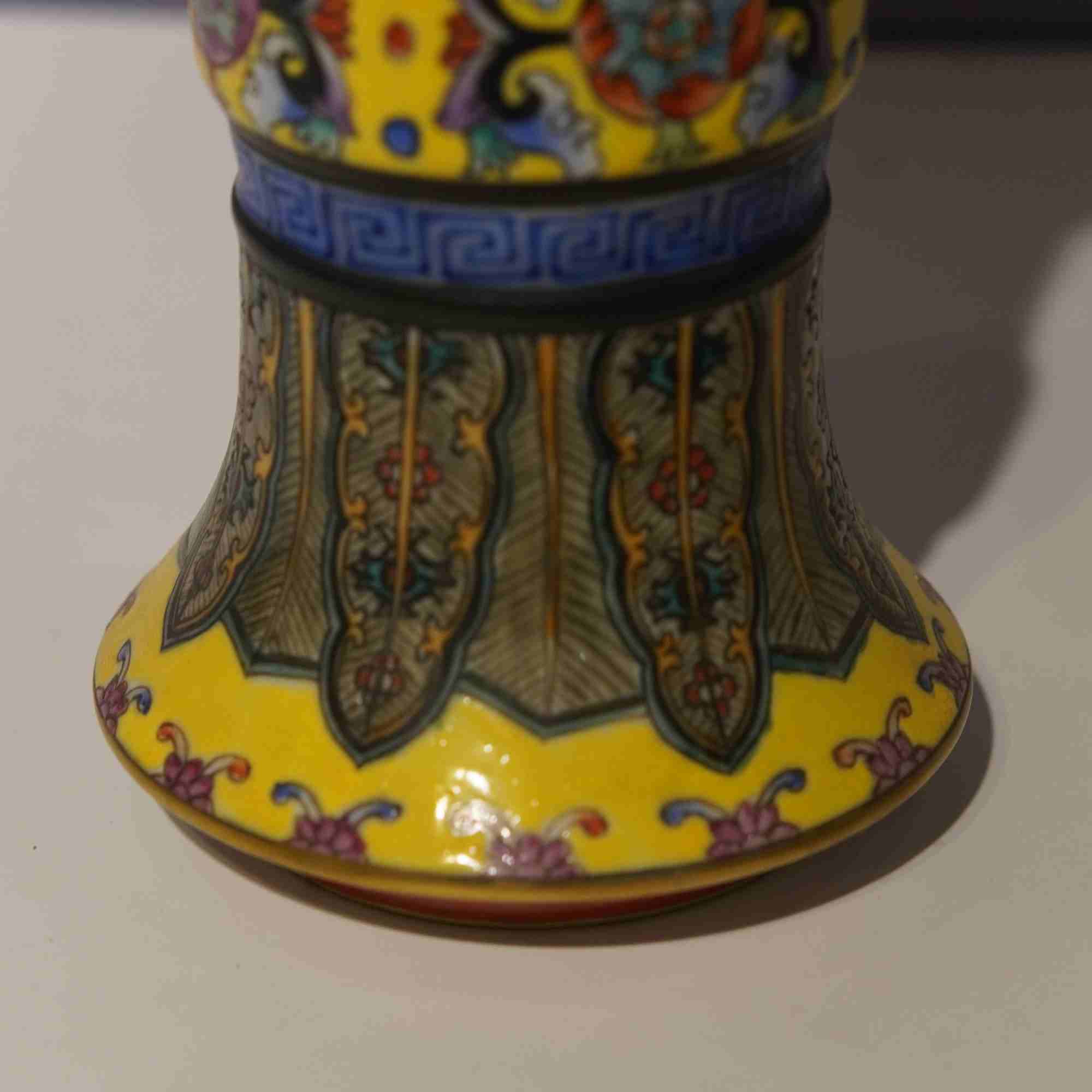 • 采用珐琅彩工艺,以明黄釉为地,色彩浓艳饱满。瓶身满绘缠枝花卉、蕉叶纹、回纹等,颈部与腹部通过色彩分层(黄、蓝、粉等)与纹饰组合,呈现出 “多层开光” 的视觉效果,细节处辅以描金勾勒,华贵精致。