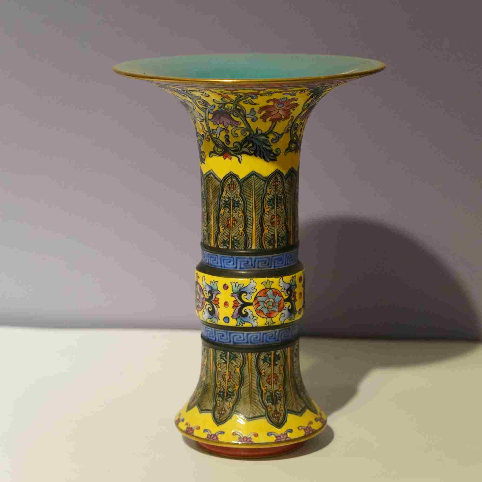 • 黄地珐琅彩描金花觚,以经典花觚造型为基础,复刻清代宫廷珐琅彩瓷的华丽风格,撇口、束腰、鼓腹、撇足,线条规整,尽显古典端庄,契合传统礼器 “花觚” 的制式,兼具装饰性与仪式感。