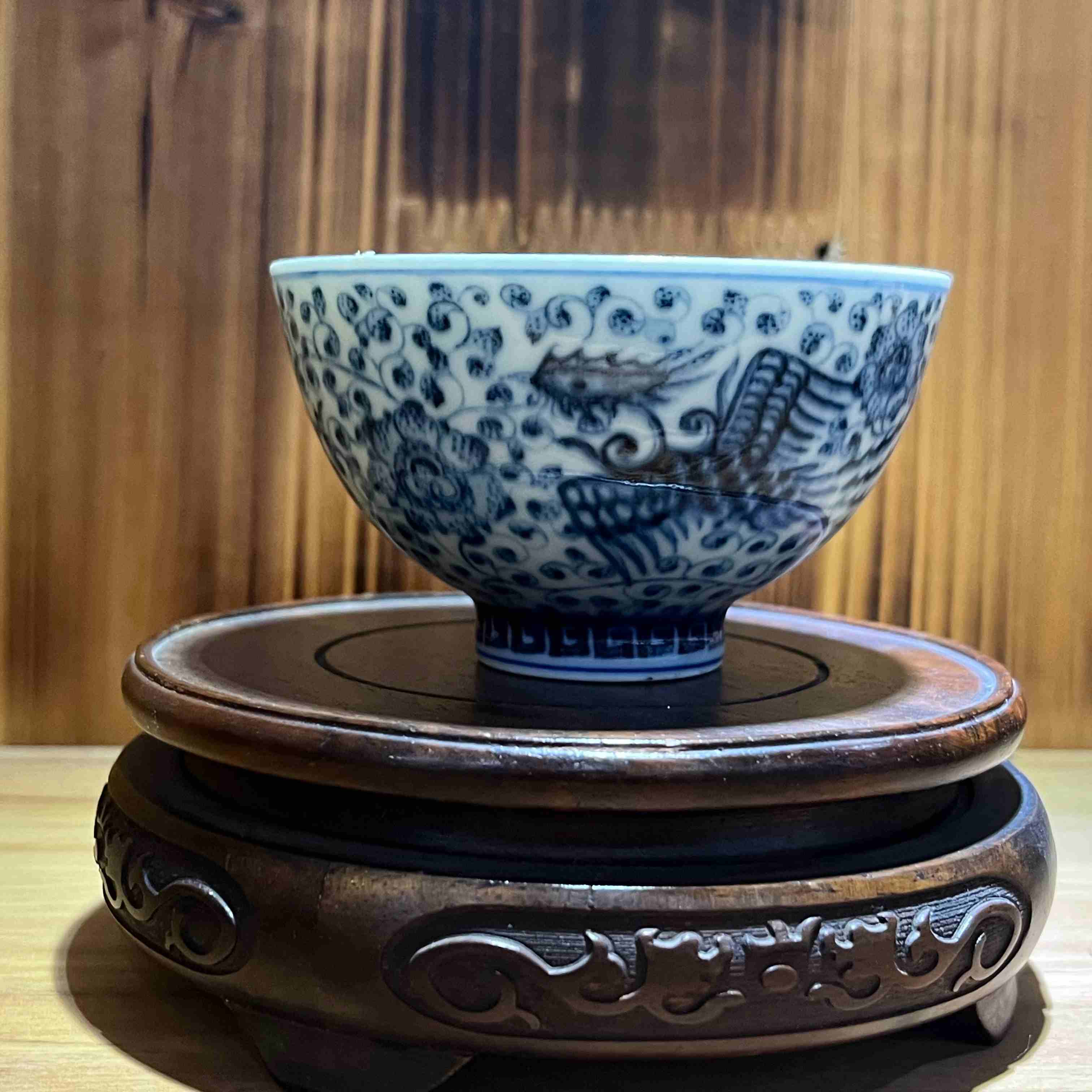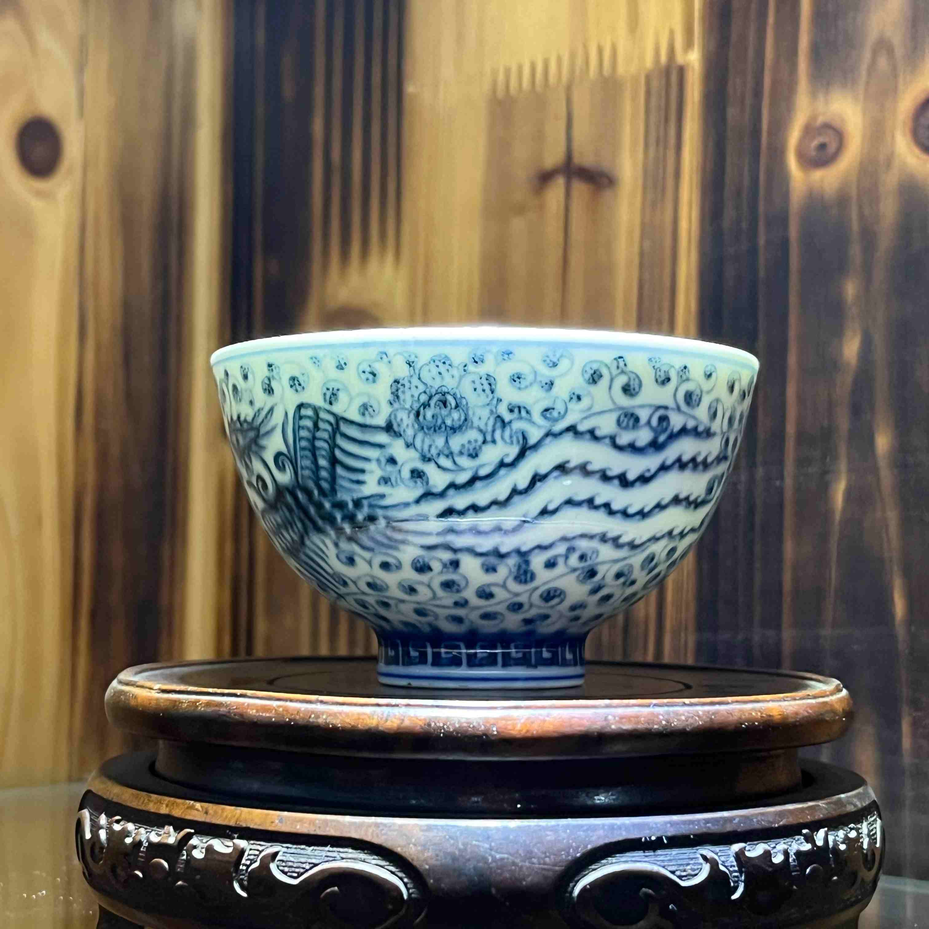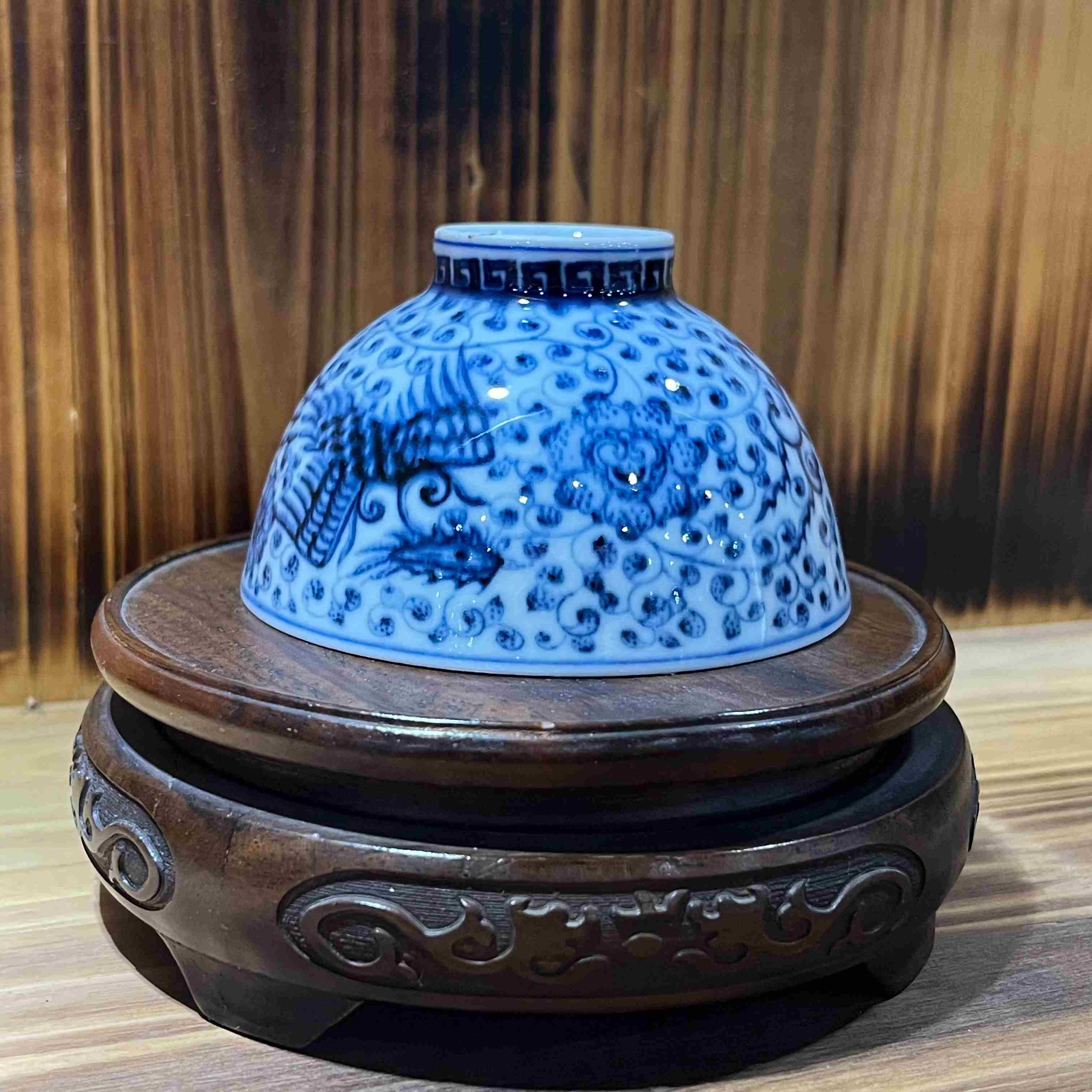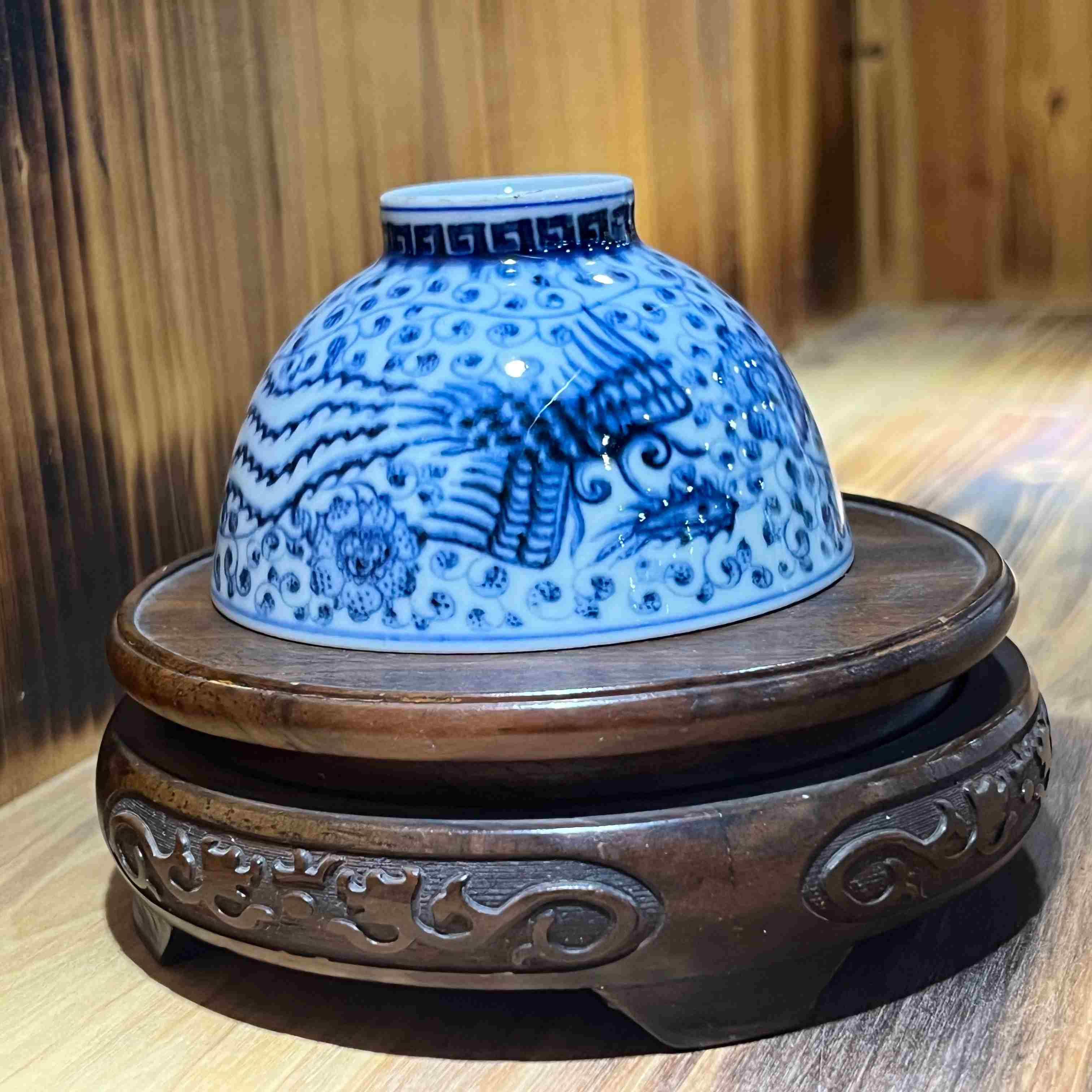蓝白相间青花瓷碗,绘精美纹饰,置于古朴雕花底座,尽显中式典雅。