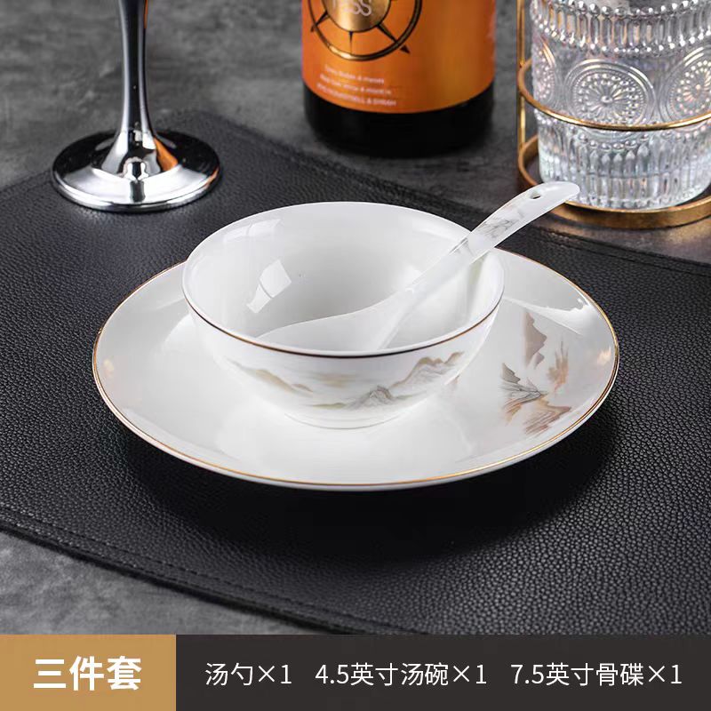高档新中式酒店碗碟杯勺摆台餐具套装饭店餐厅接待山水画摆盘骨瓷(三件套)