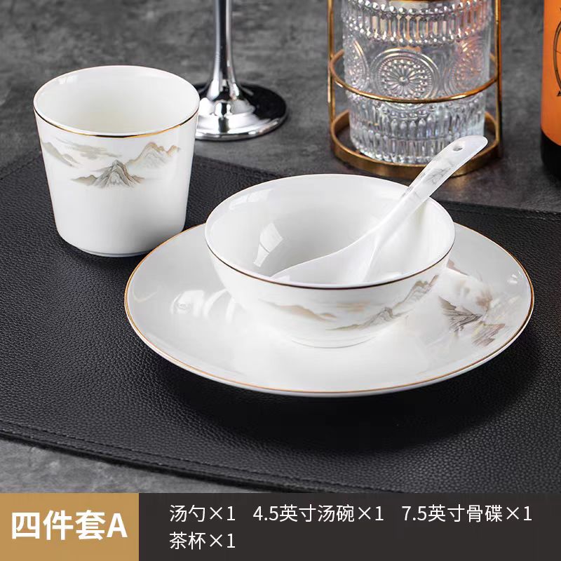 高档新中式酒店碗碟杯勺摆台餐具套装饭店餐厅接待山水画摆盘骨瓷(四件套A)
