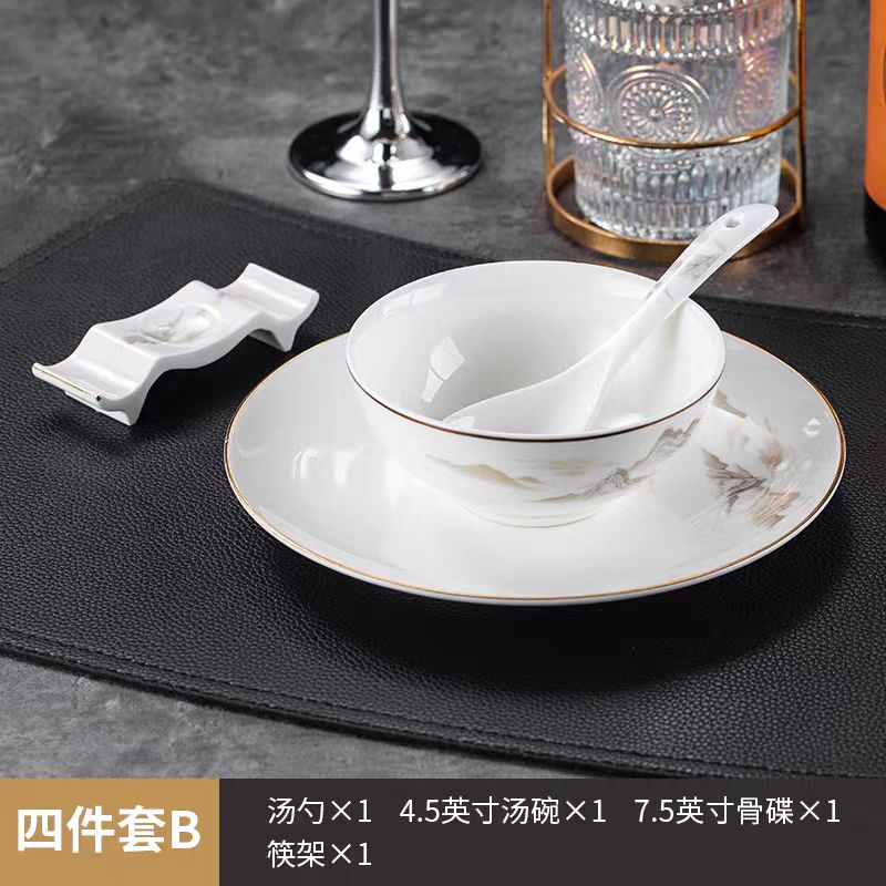 高档新中式酒店碗碟杯勺摆台餐具套装饭店餐厅接待山水画摆盘骨瓷(四件套B)