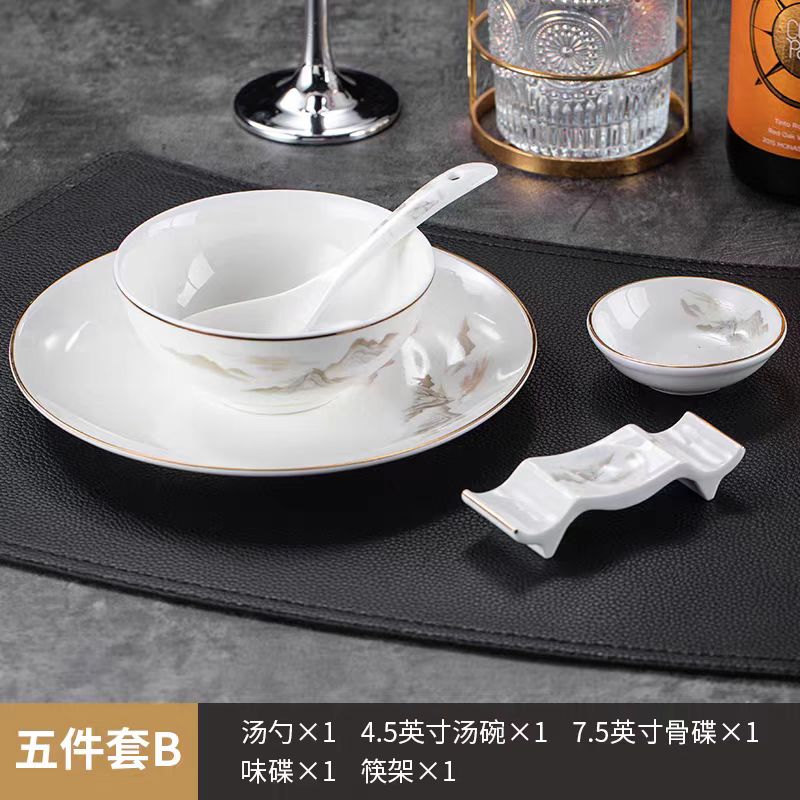 高档新中式酒店碗碟杯勺摆台餐具套装饭店餐厅接待山水画摆盘骨瓷(五件套B)
