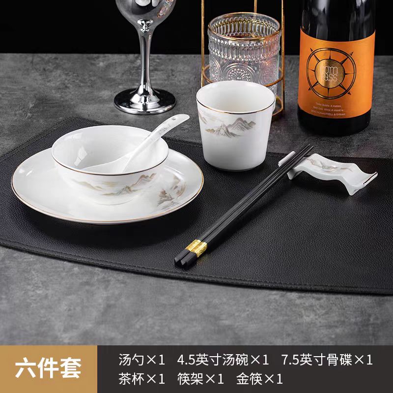 高档新中式酒店碗碟杯勺摆台餐具套装饭店餐厅接待山水画摆盘骨瓷(六件套)