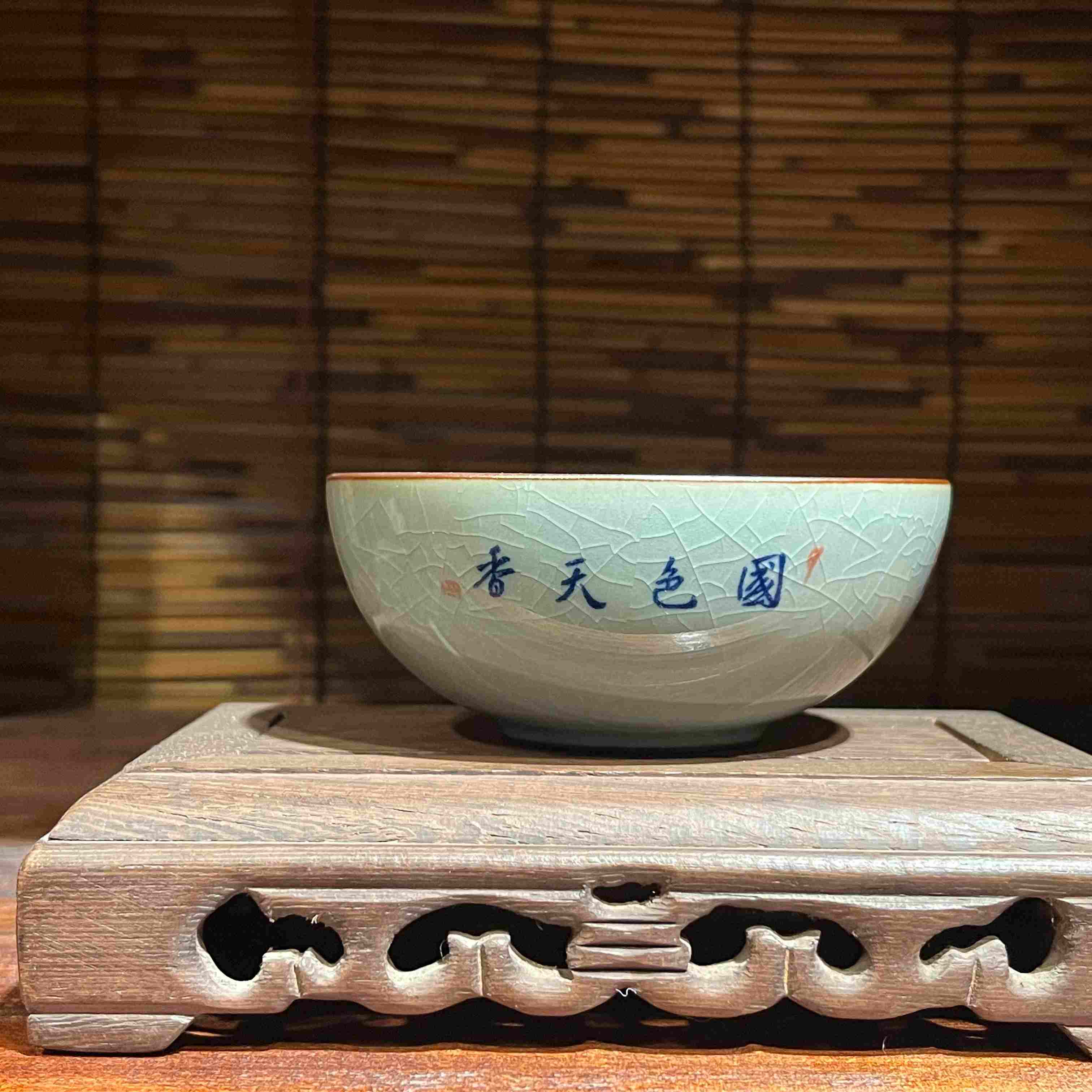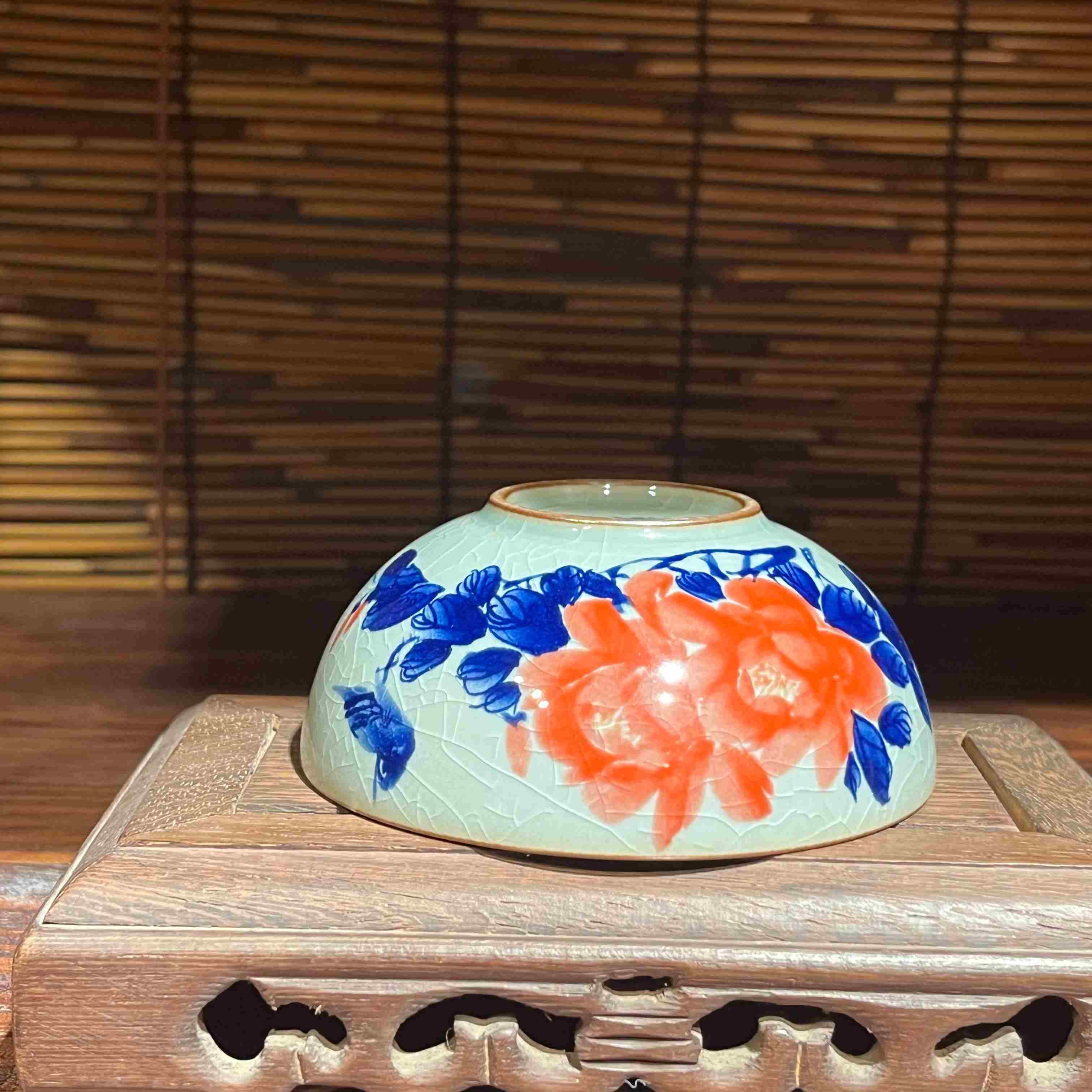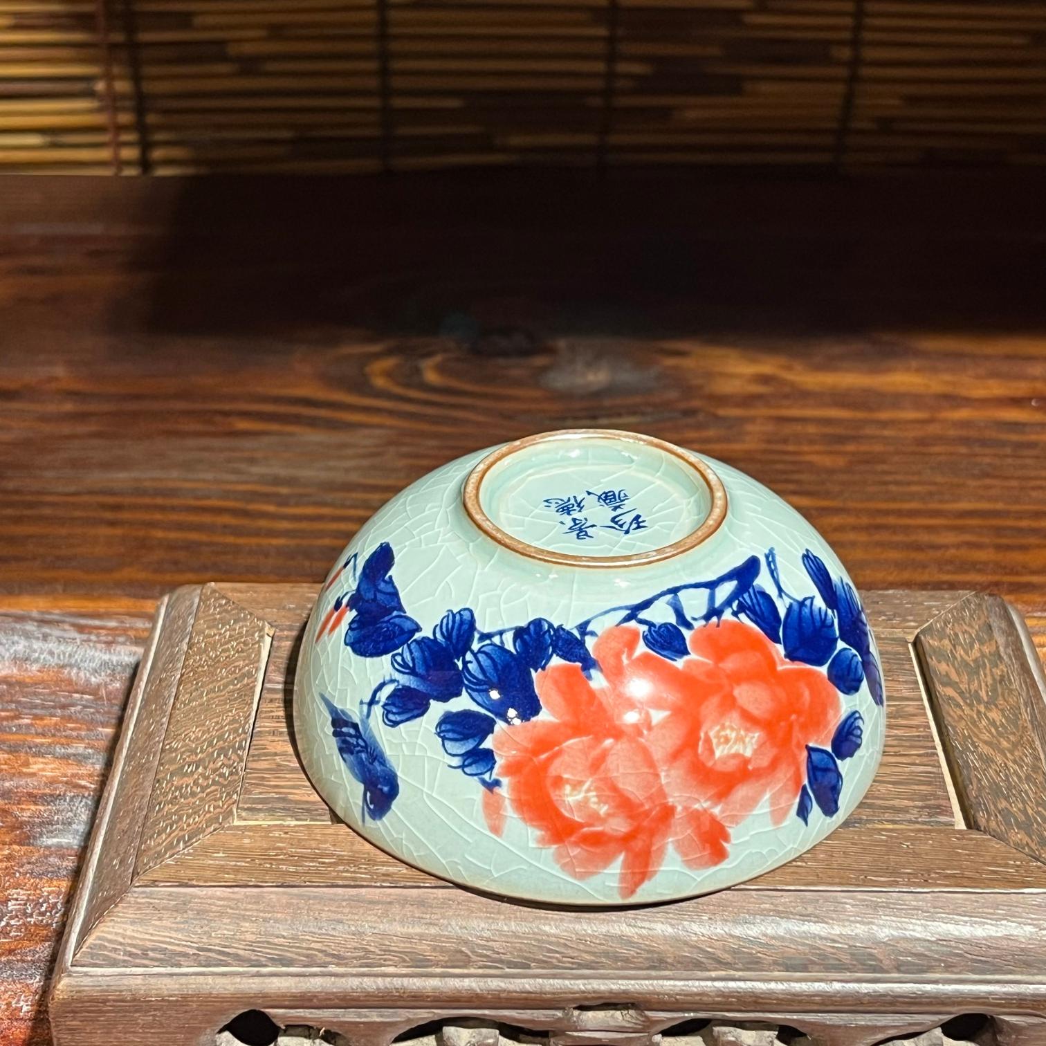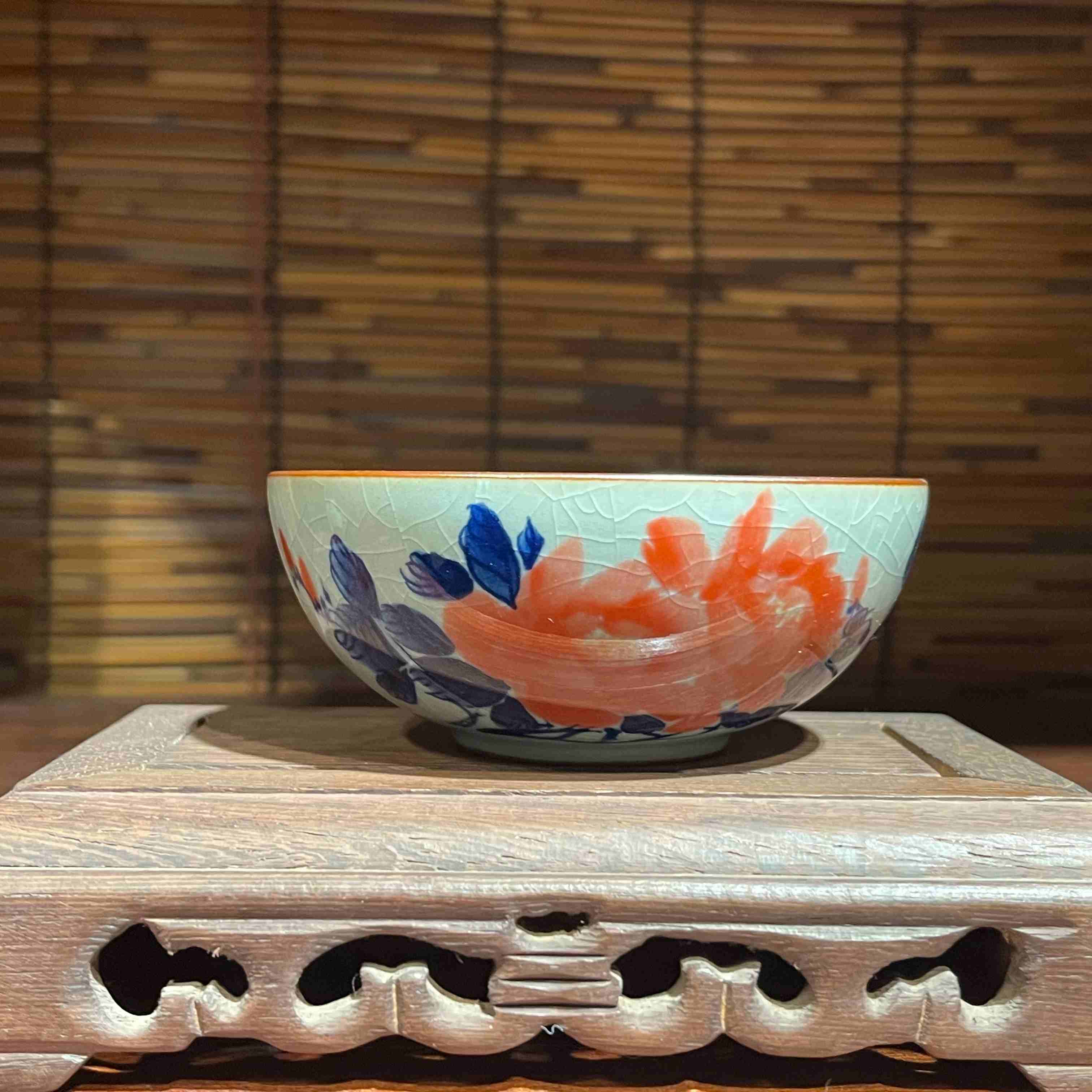 瓷碗表面带有独特的开片纹路,增添了古朴韵味,像是岁月留下的独特印记。 它采用了精湛的彩绘工艺,在瓷质细腻的碗身上绘制图案,质地温润,展现出工匠的高超技艺。
