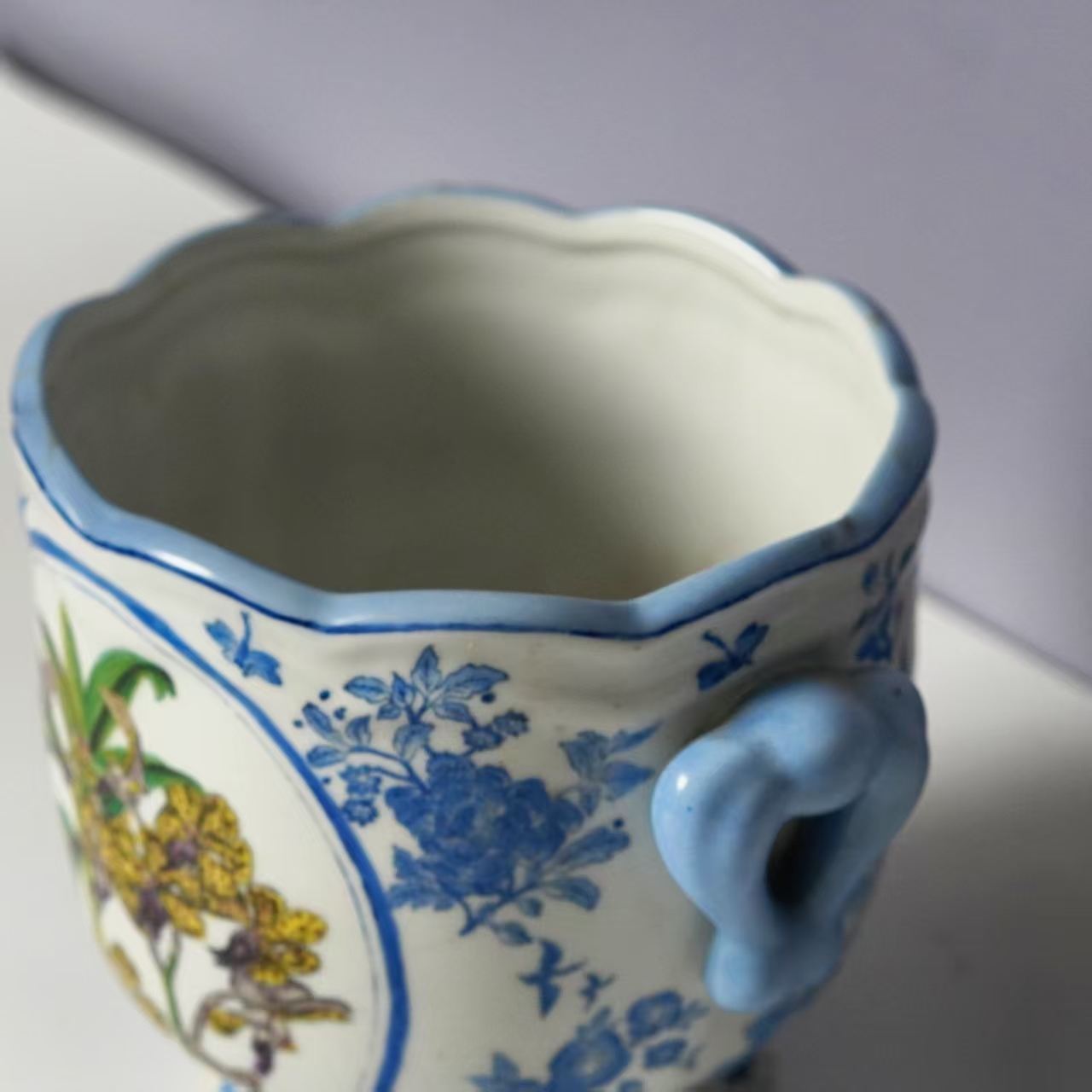 器型:整体为花盆形制,口沿呈波浪形,增加了器物的灵动感与美感 。底部设有圈足,起到稳定支撑的作用,使器物放置时更为平稳。两侧配有浅蓝色的把手,不仅具有实用性,方便提携,还在视觉上增添了器物的协调性和精致感 。