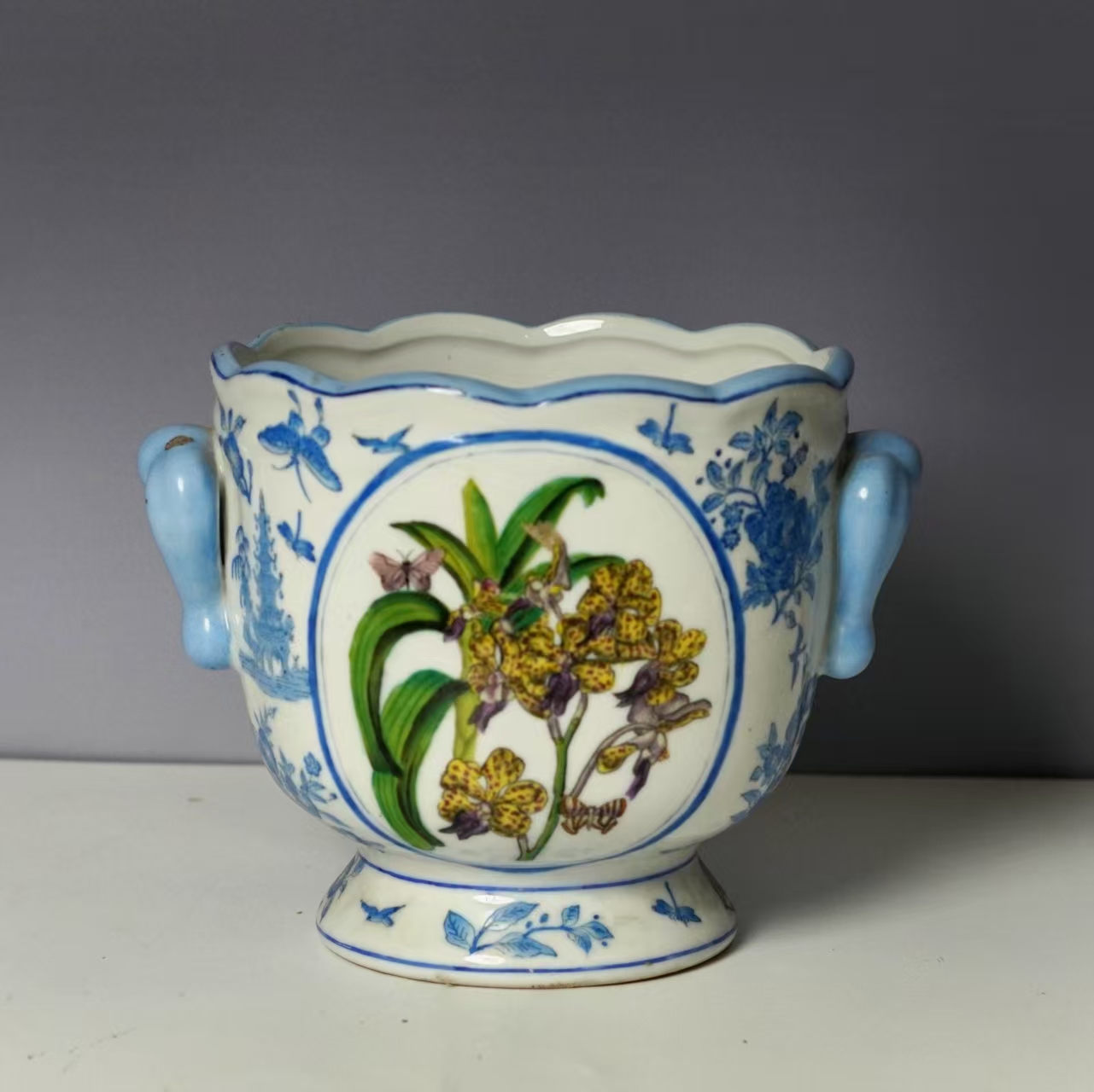 纹饰图案:中心位置绘制了色彩斑斓的兰花,兰花旁还有蝴蝶等昆虫,展现出自然和谐之美。口沿、底部以及主体图案周围,分布着蓝色的花鸟、植物等纹饰,这些纹饰与中心兰花图案相呼应,共同营造出雅致的装饰效果,体现了东西方文化对自然元素的喜爱和艺术表现手法 。