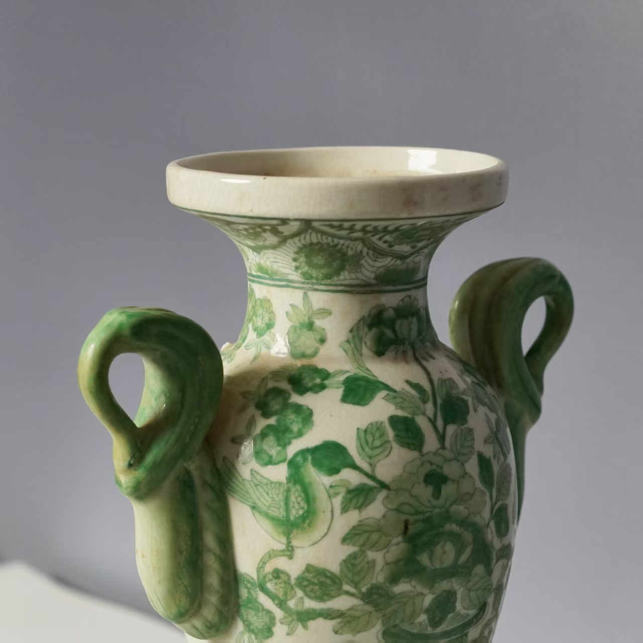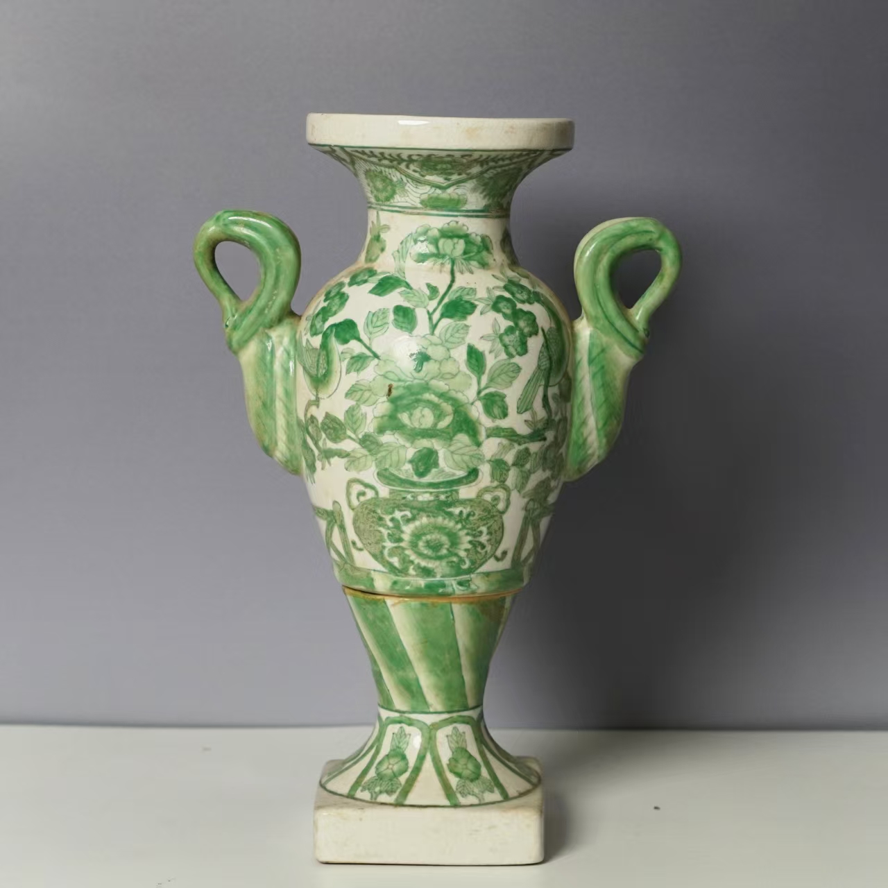 30元3串陶瓷吊坠造型特点 整体形态:该花瓶呈上宽下窄的形态,口沿外撇,颈部略收,腹部较为饱满,往下逐渐收窄至足部。底部为方形足,给人一种稳重端庄的感觉。 双耳设计:两侧设有弯曲的绿色双耳,造型独特,不仅具有装饰性,也在一定程度上增加了花瓶的实用性,方便搬运或把持 。装饰风格