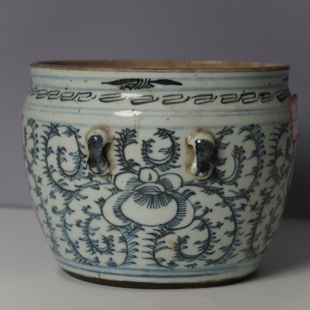 整体形态:这件瓷器整体呈圆筒形,口沿较为平整,罐身饱满,底部微微内收。底部边缘有一些磨损痕迹,显示出一定的使用或岁月痕迹。