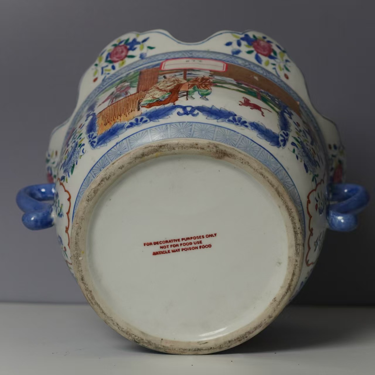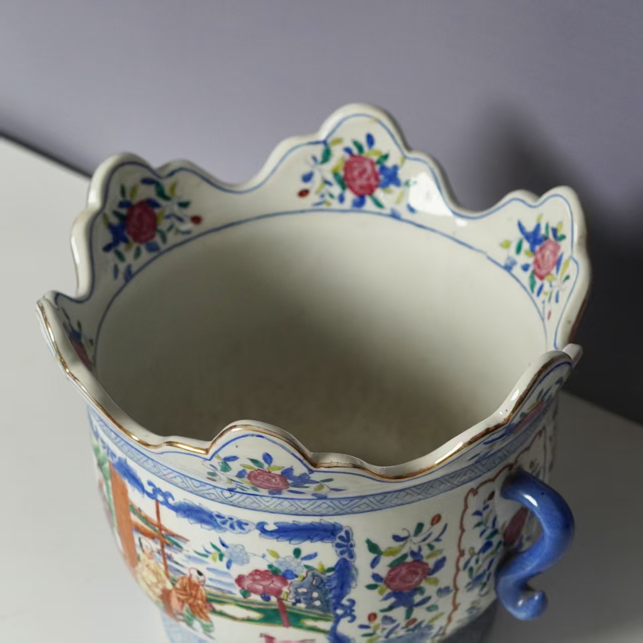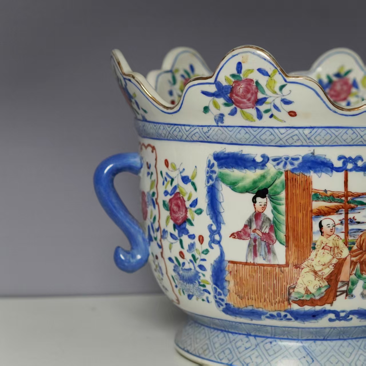 整体形态:呈现出类似花盆的器型,口沿为独特的波浪形(花口 )设计,增加了器物的灵动美感和艺术观赏性。底部设有圈足,起到稳定支撑的作用,使器物放置时更为平稳 。