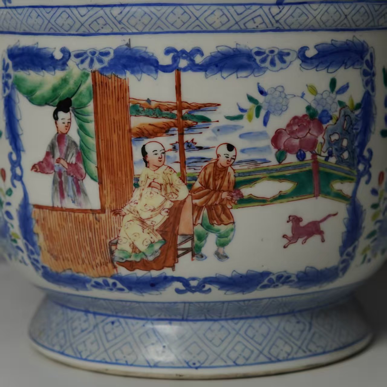 人物故事纹:瓶身主体部分描绘了人物场景,中国传统故事或生活场景,人物服饰、神态、动作等刻画较为细致,周围还搭配有山水、帘幕等元素,丰富了画面内容,传递出浓厚的东方文化气息 。此外,还有蓝色的几何纹、卷草纹等作为辅助纹饰,分布在口沿、底部等位置,起到装饰和界定画面的作用 。