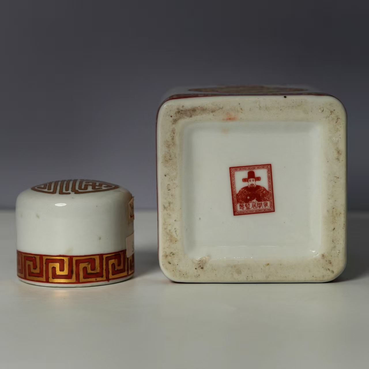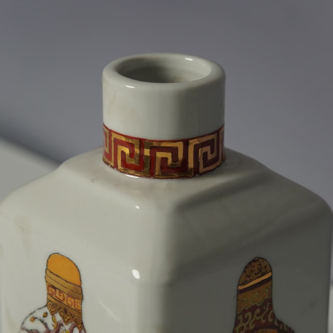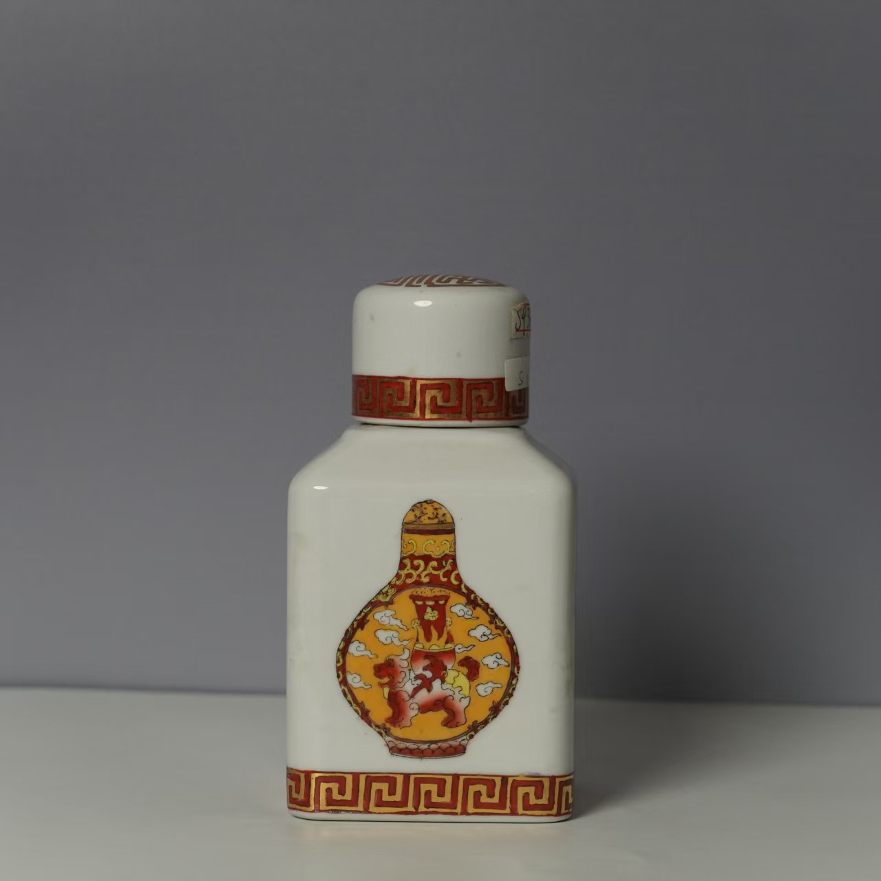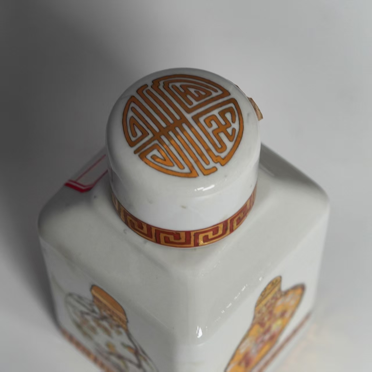 整体形态:该瓷瓶为方形瓶身,线条硬朗规整,给人一种端庄稳重之感。瓶口较小且为圆形,与方形瓶身形成对比,增添了造型上的变化。瓶盖为圆形,与瓶口相适配。