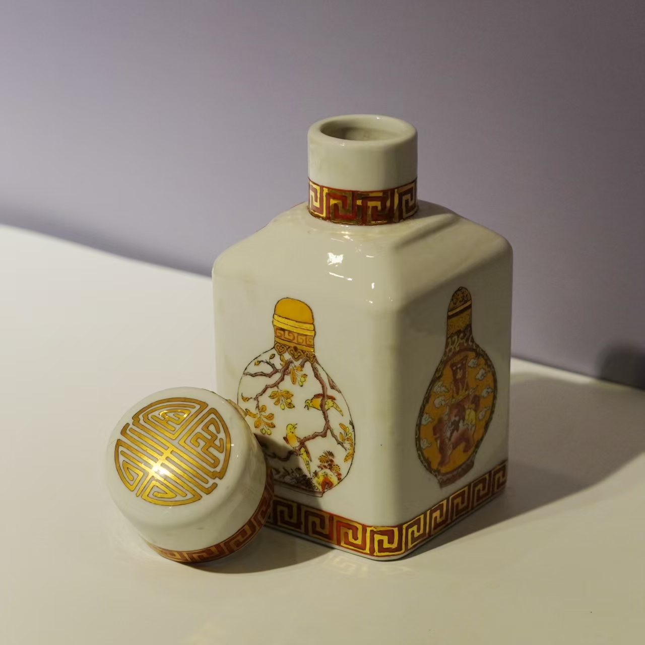 瓶盖:瓶盖上饰有金色的传统吉祥符号,进一步强化了器物的东方文化属性与吉祥寓意。