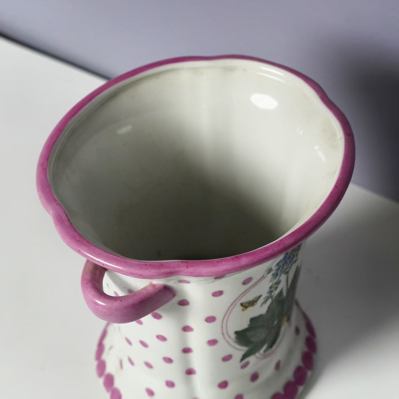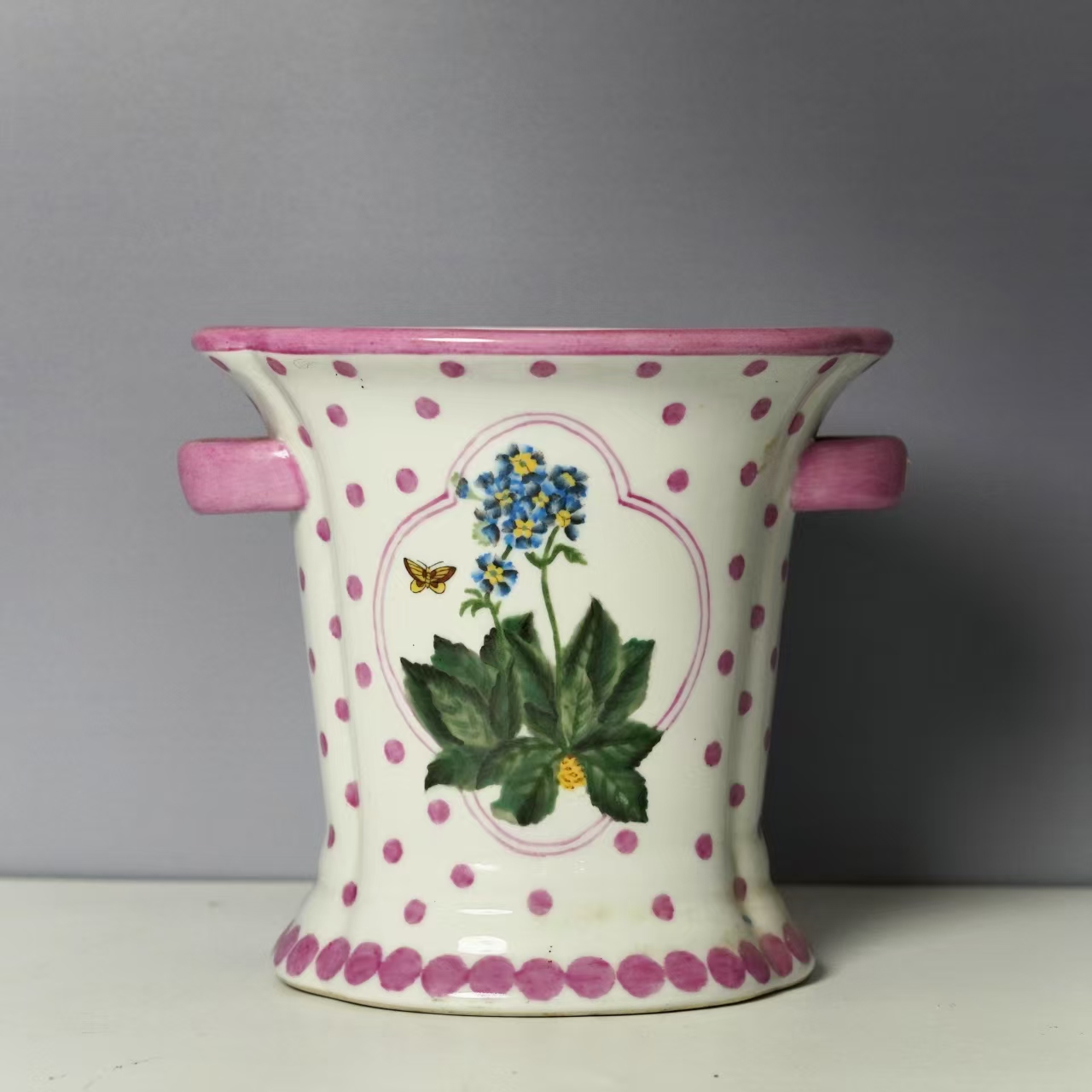 外观特点 色彩与图案:主体颜色为白色,上面点缀着粉色的圆点,显得俏皮可爱。花盆口沿和底部边缘也有粉色装饰。正面绘有写实风格的花卉图案,蓝色和黄色的花朵搭配绿色的叶子,还绘有一只黄色的蝴蝶,增加了画面的生动感。 造型:具有两个粉色的把手,方便搬运,整体造型上宽下窄,有一定的曲线变化,在视觉上较为美观。 用途 这件瓷器可用于种植小型花卉、多肉植物等,也可作为装饰品摆放在室内,为家居环境增添一份雅致和生机。