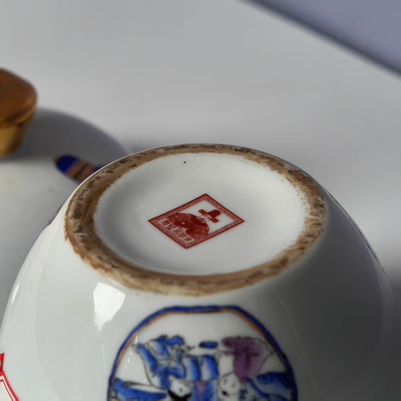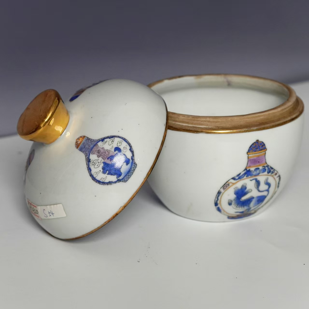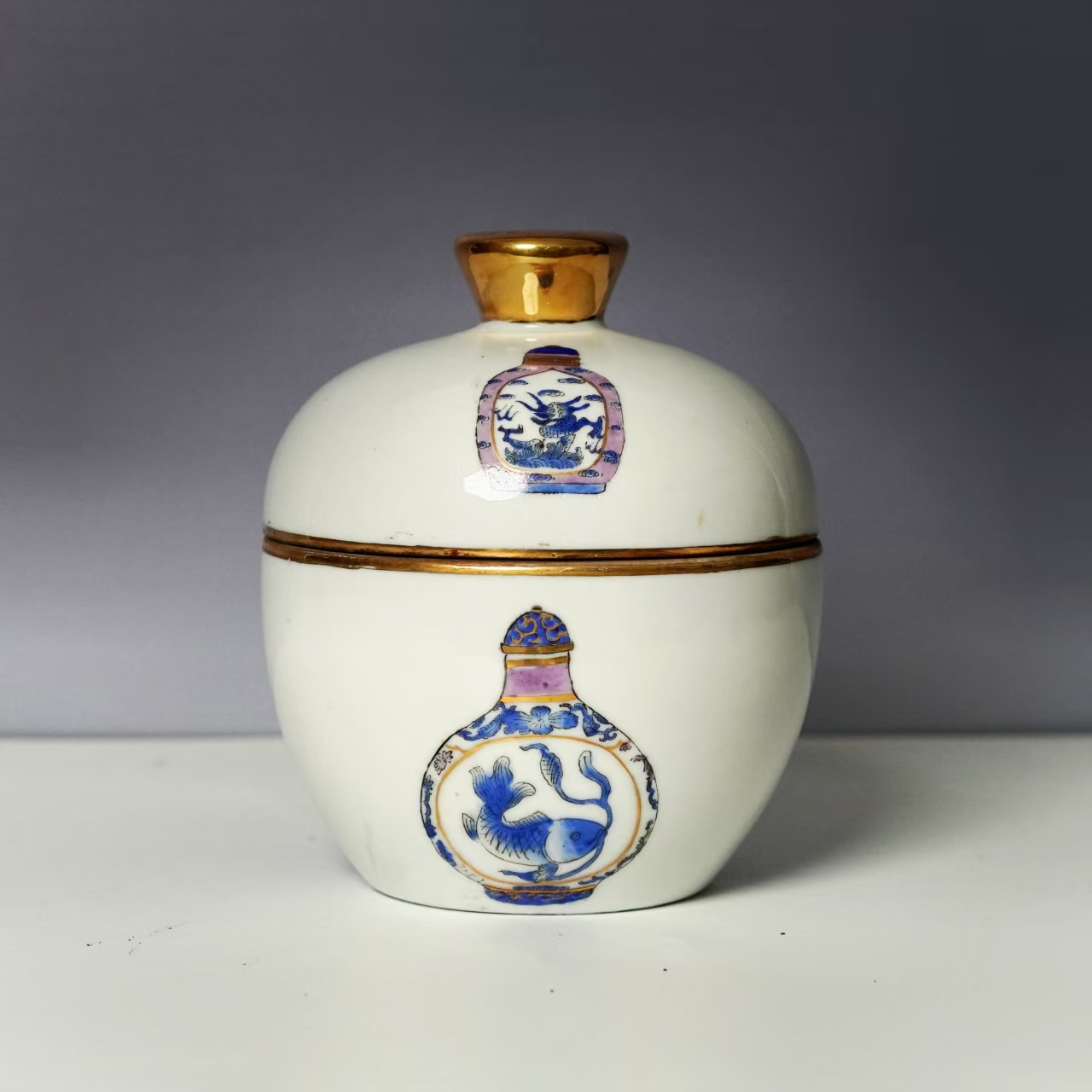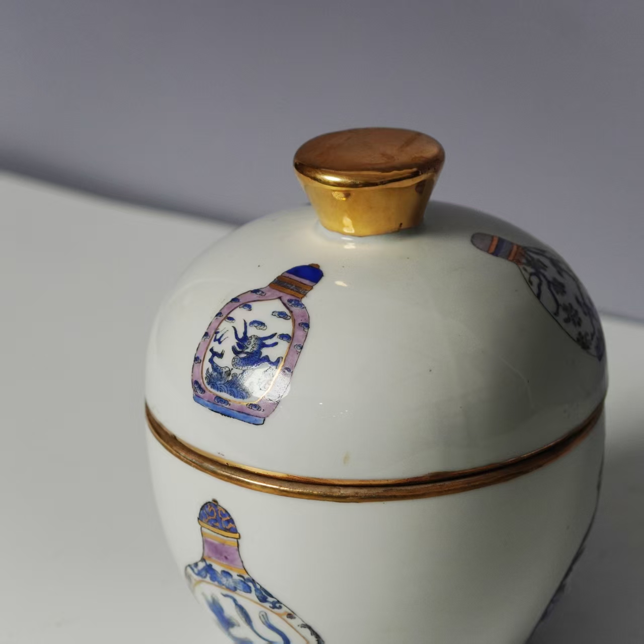 造型:这件海外回流瓷是一件带盖的罐状瓷器。整体造型圆润饱满,罐体呈鼓腹状,线条流畅柔和,给人一种端庄稳重之感。盖子顶端有金色的盖钮,增添了精致感,也方便开启和关闭盖子。