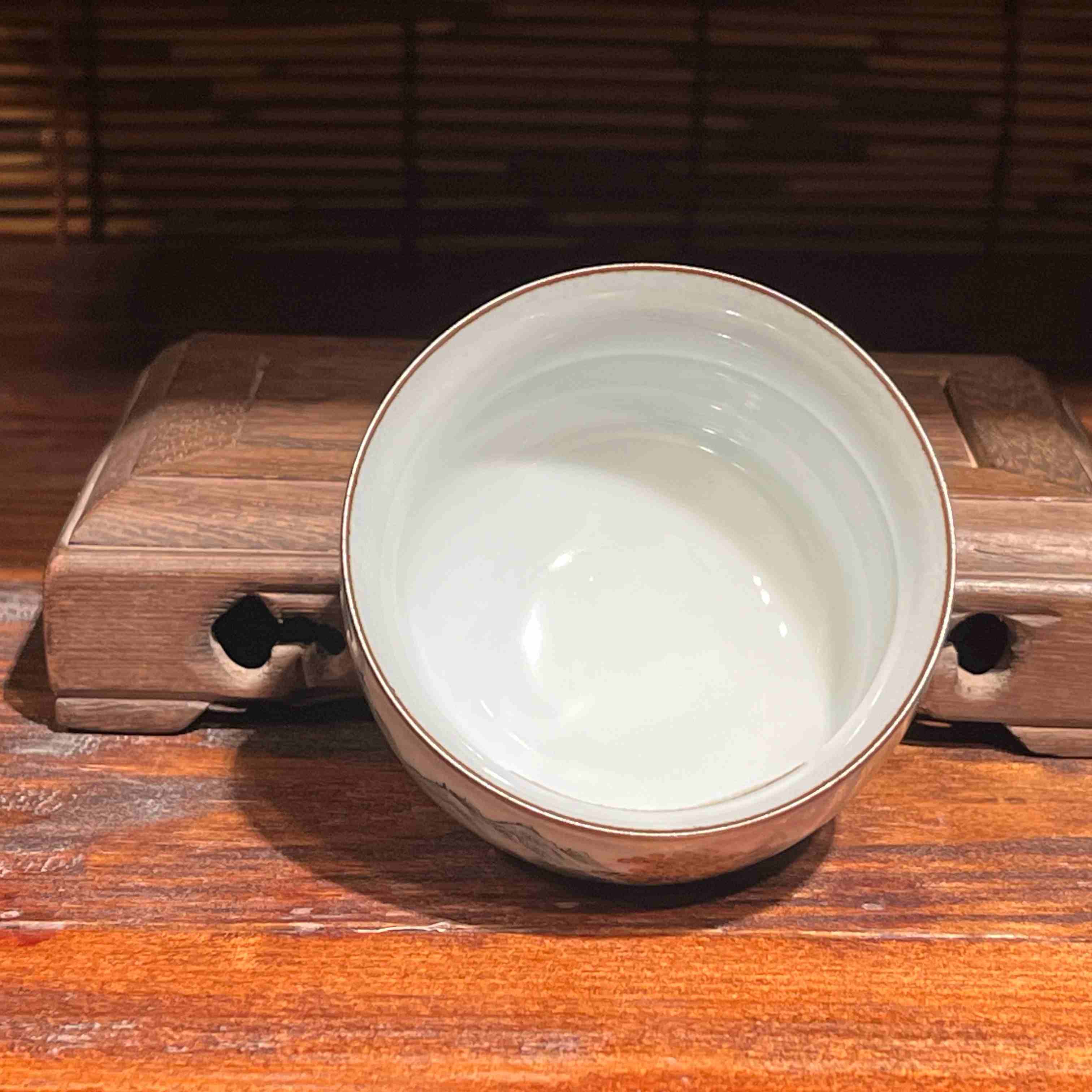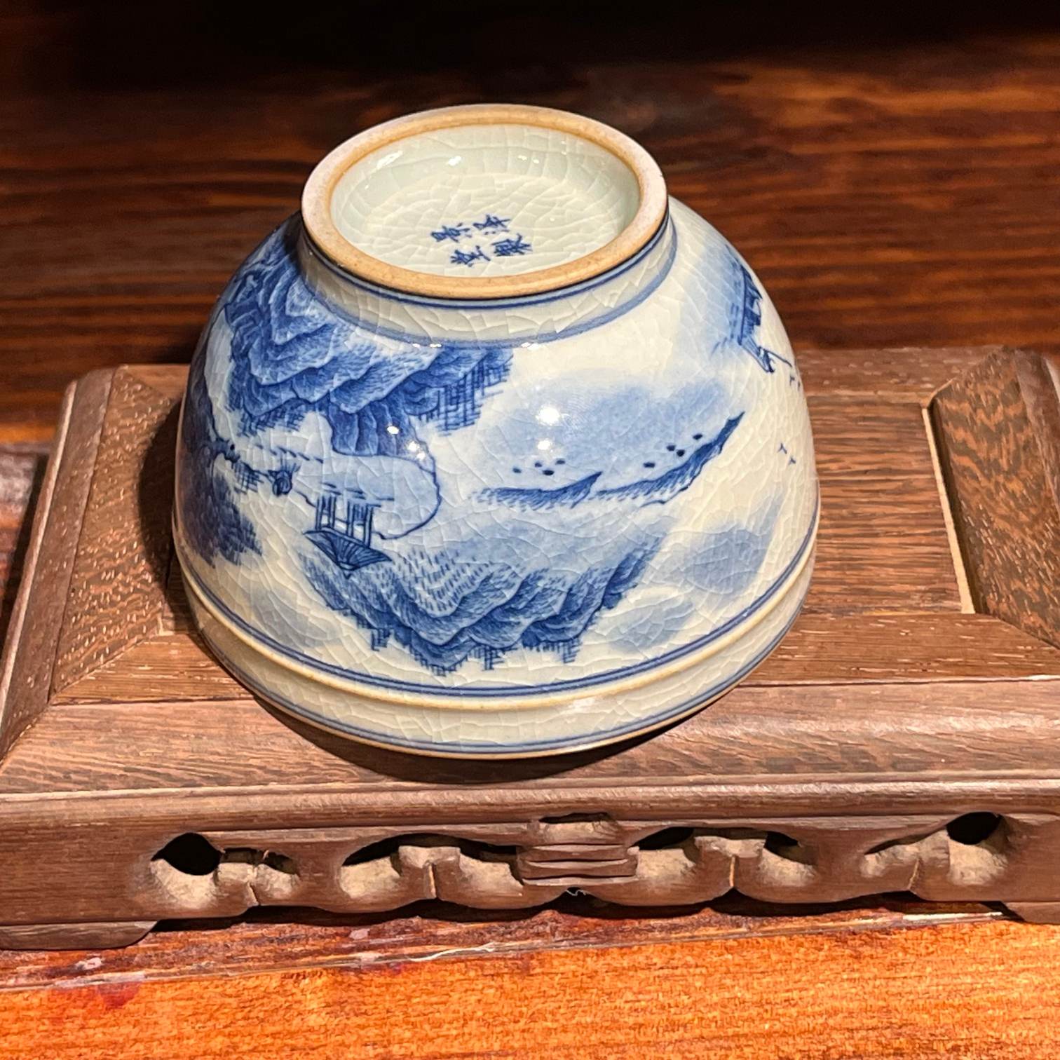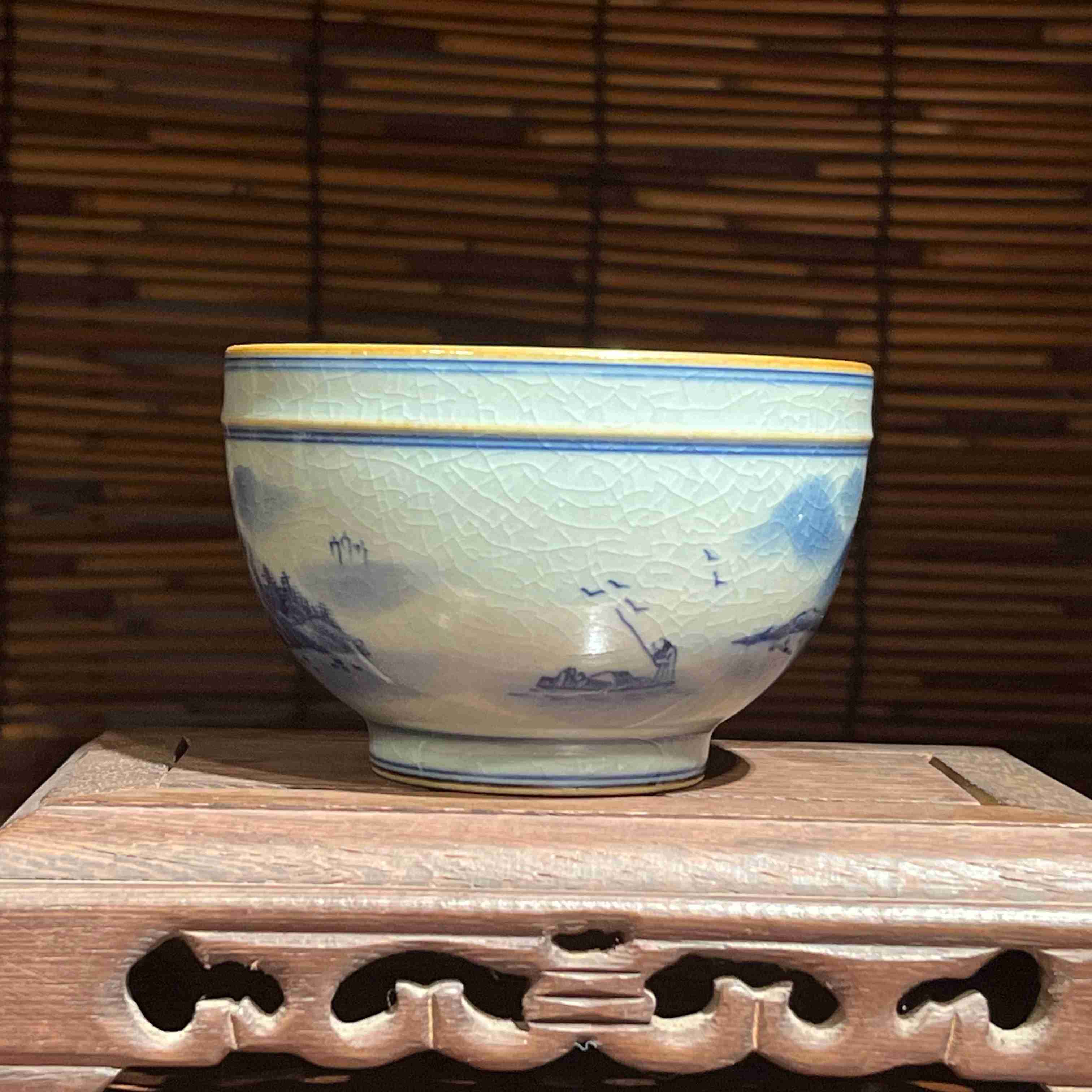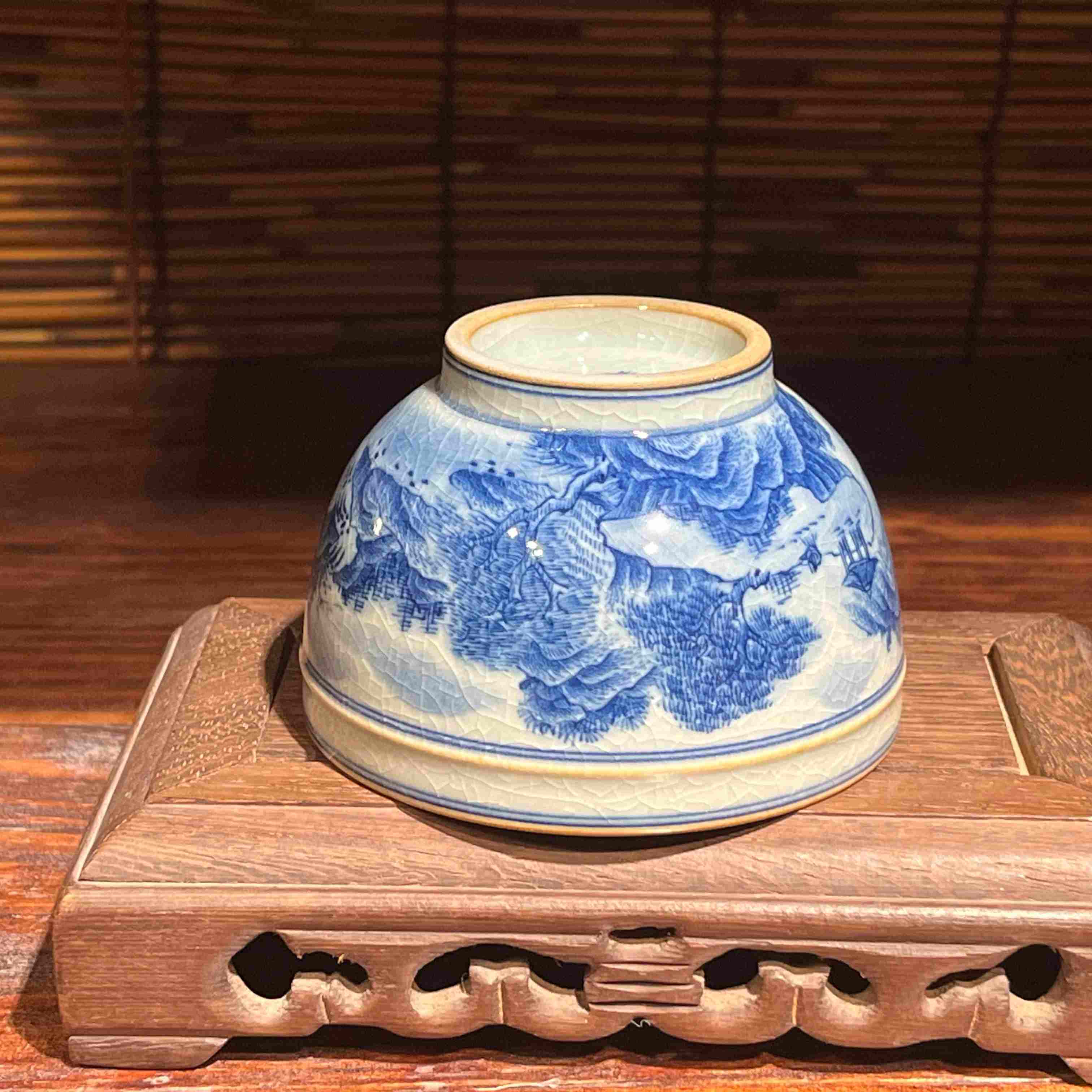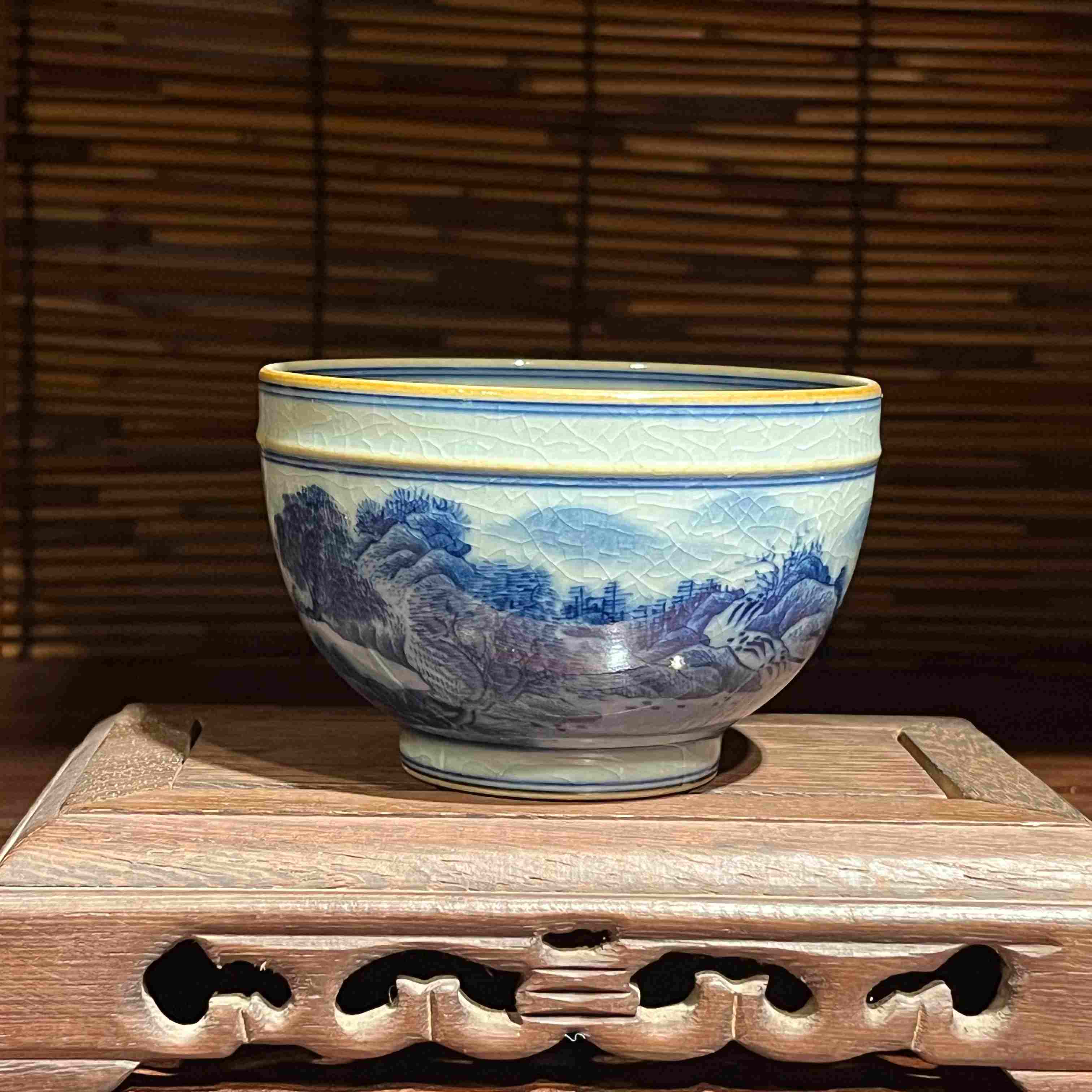 首页 / 茶器 / 主人杯系列 / 手绘山水青花杯(口:8.8cm高5.8cm容量:175cc)