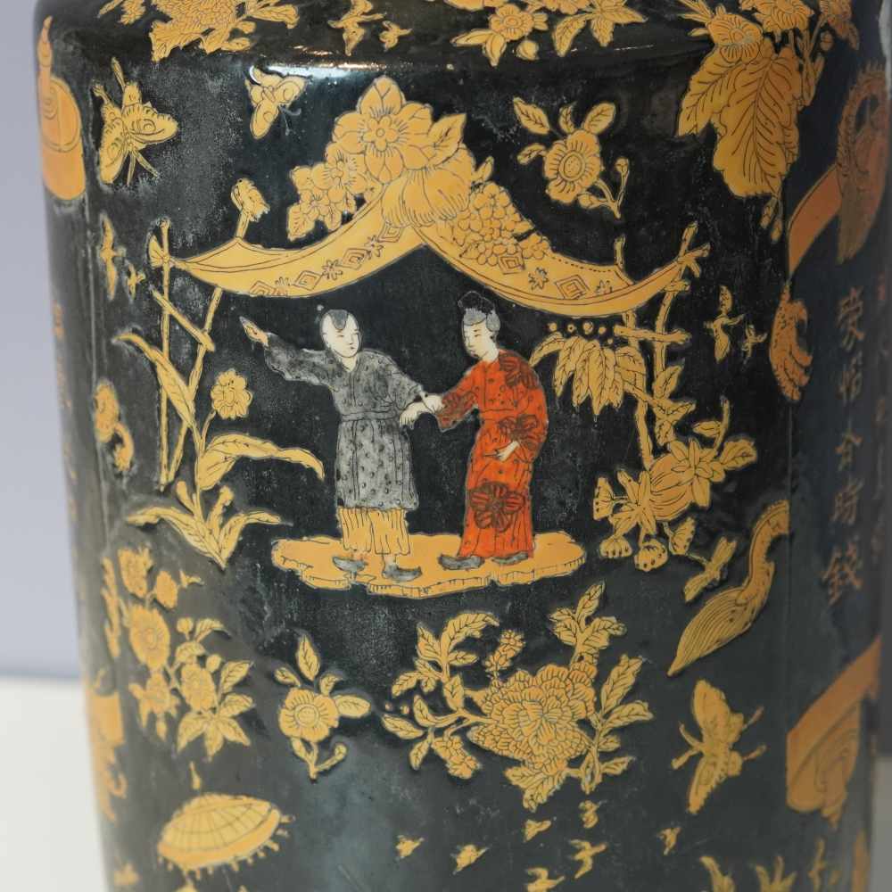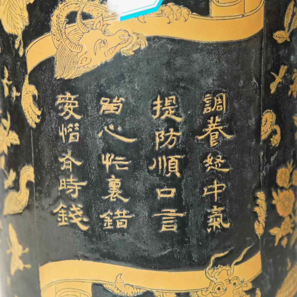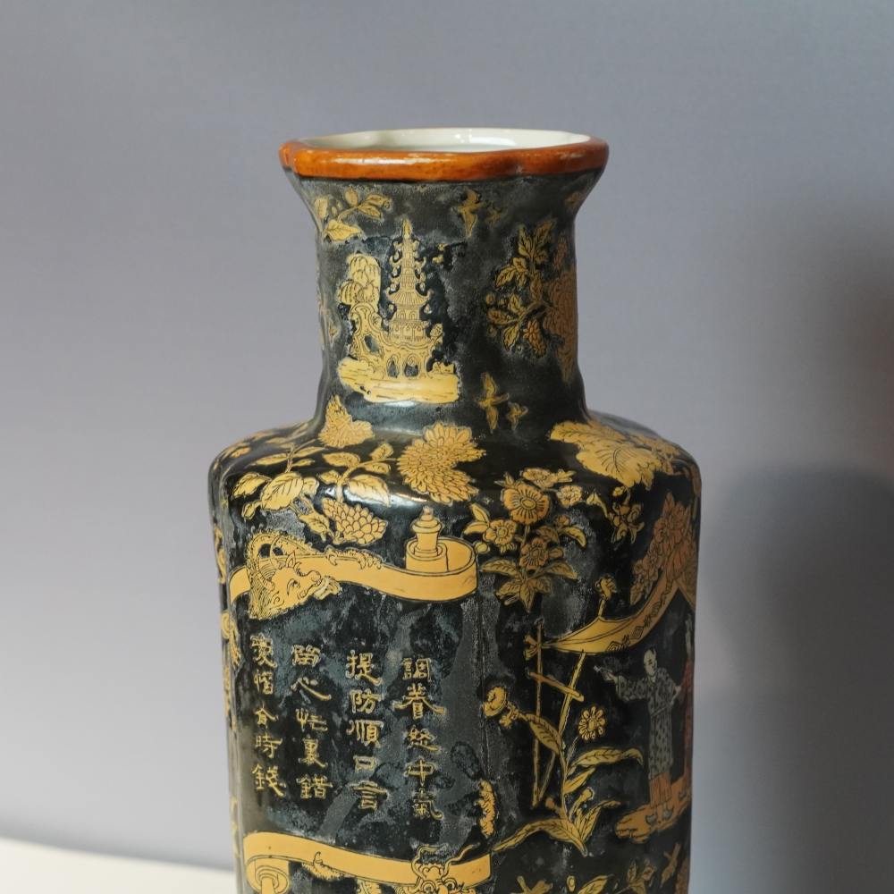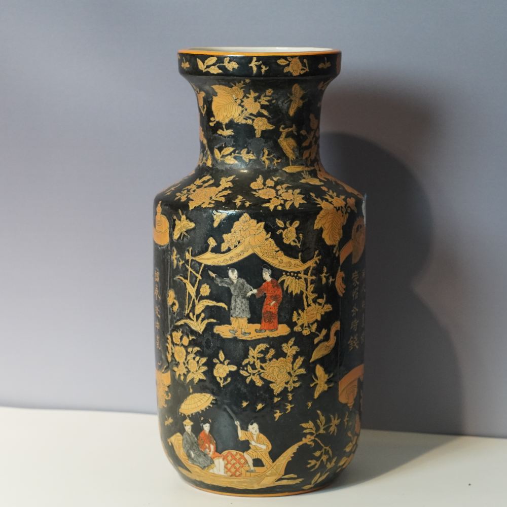 瓷器介绍 造型:这是一只直筒形的花瓶,瓶口微微外撇,瓶颈较短,瓶身较为修长,整体造型规整、端庄大气,具有稳重之感。 装饰工艺:采用了黑金配色的装饰手法,以黑色为底色,运用描金工艺绘制图案。瓶身上的图案丰富多样,有精美的花卉、枝叶,栩栩如生,展现出细腻的绘画功底;还有人物场景,如身着传统服饰的古人,有的似在交谈,有的似在进行某种活动,生动地呈现出古代生活的片段。此外,瓶身上还能看到一些文字,增添了文化韵味。这种描金工艺使得图案在黑色背景的衬托下显得格外醒目,彰显出华丽富贵的气质。