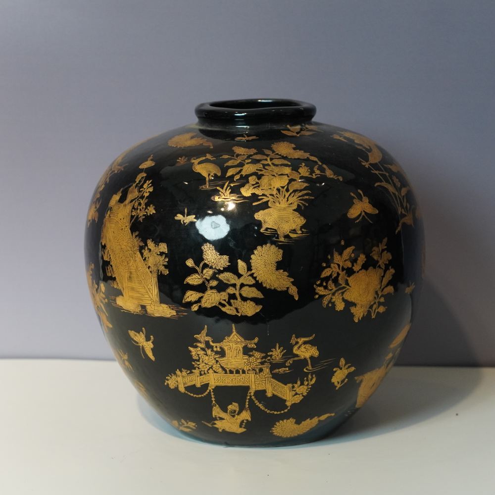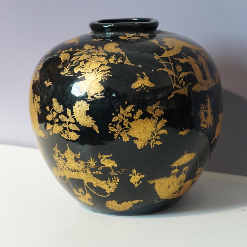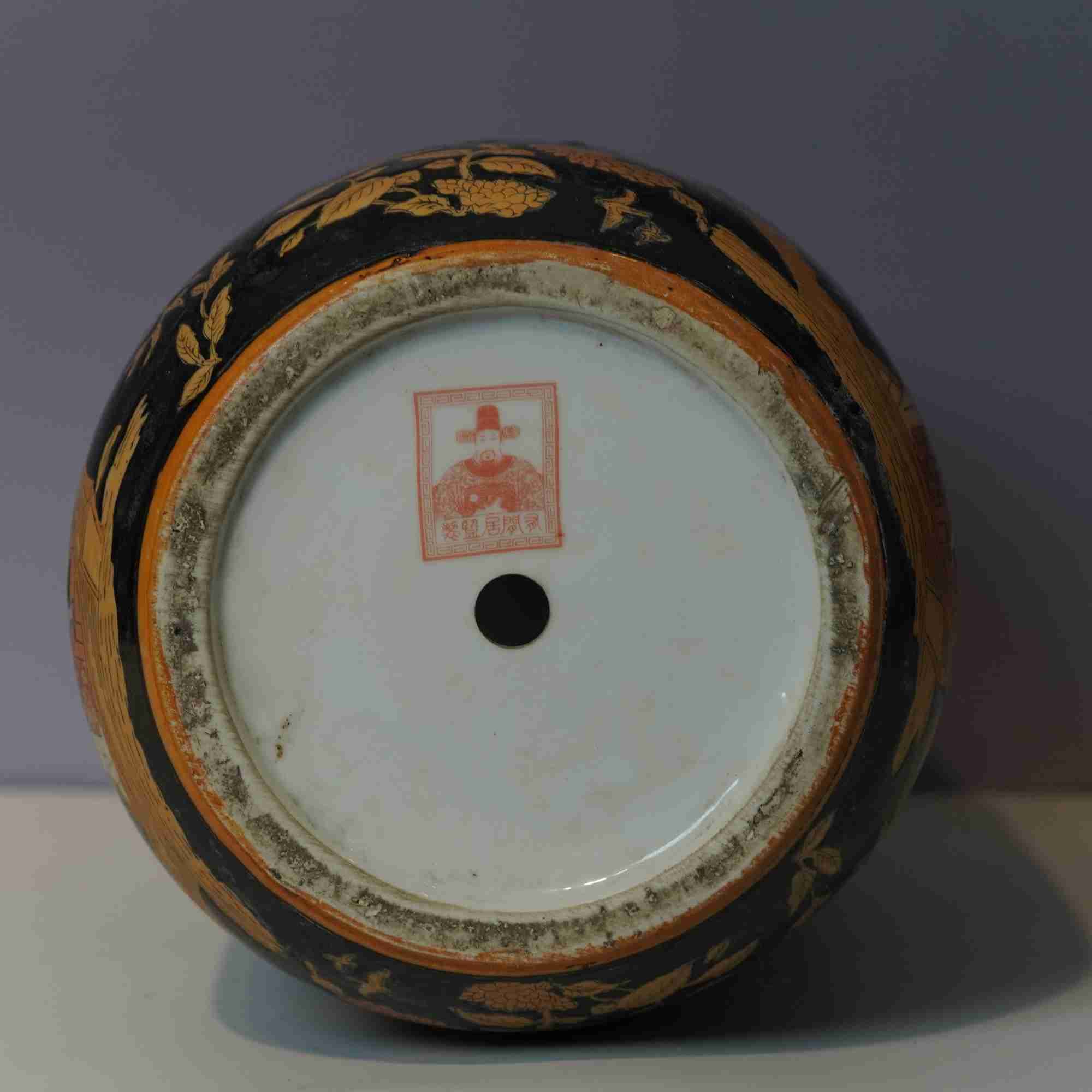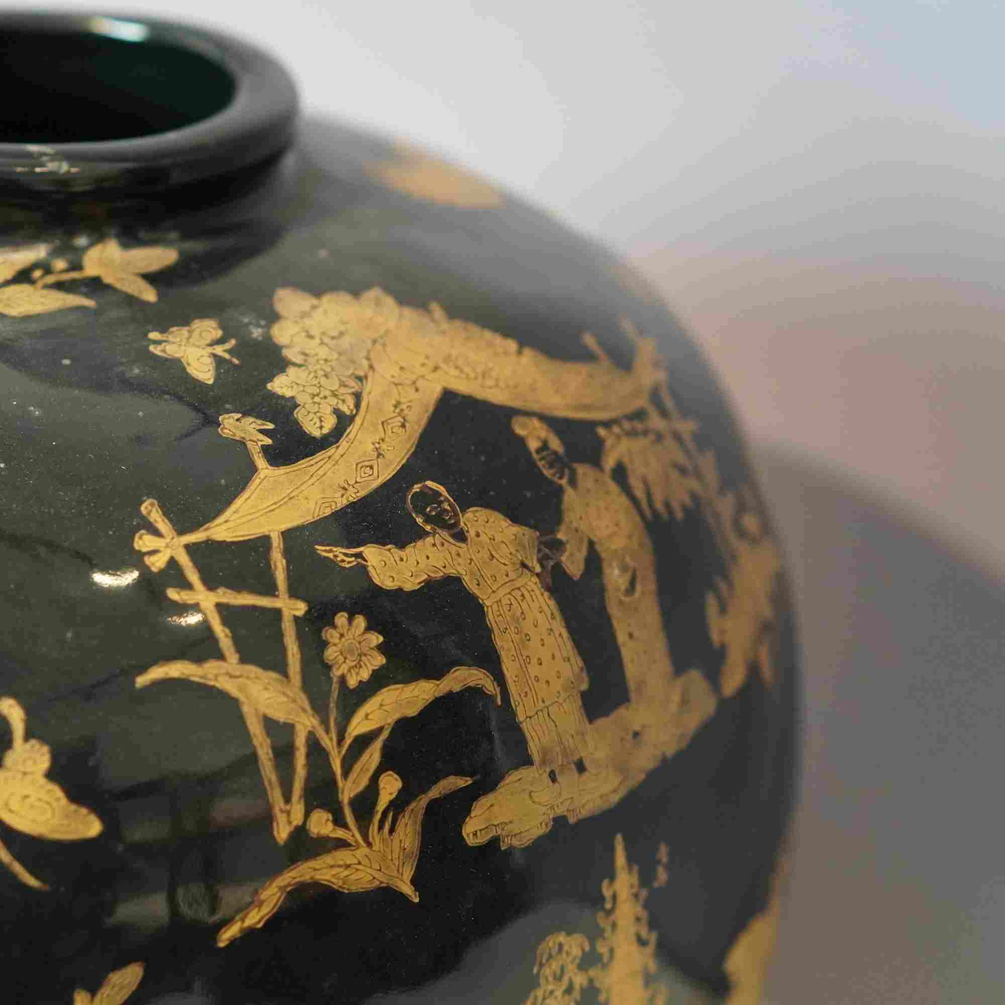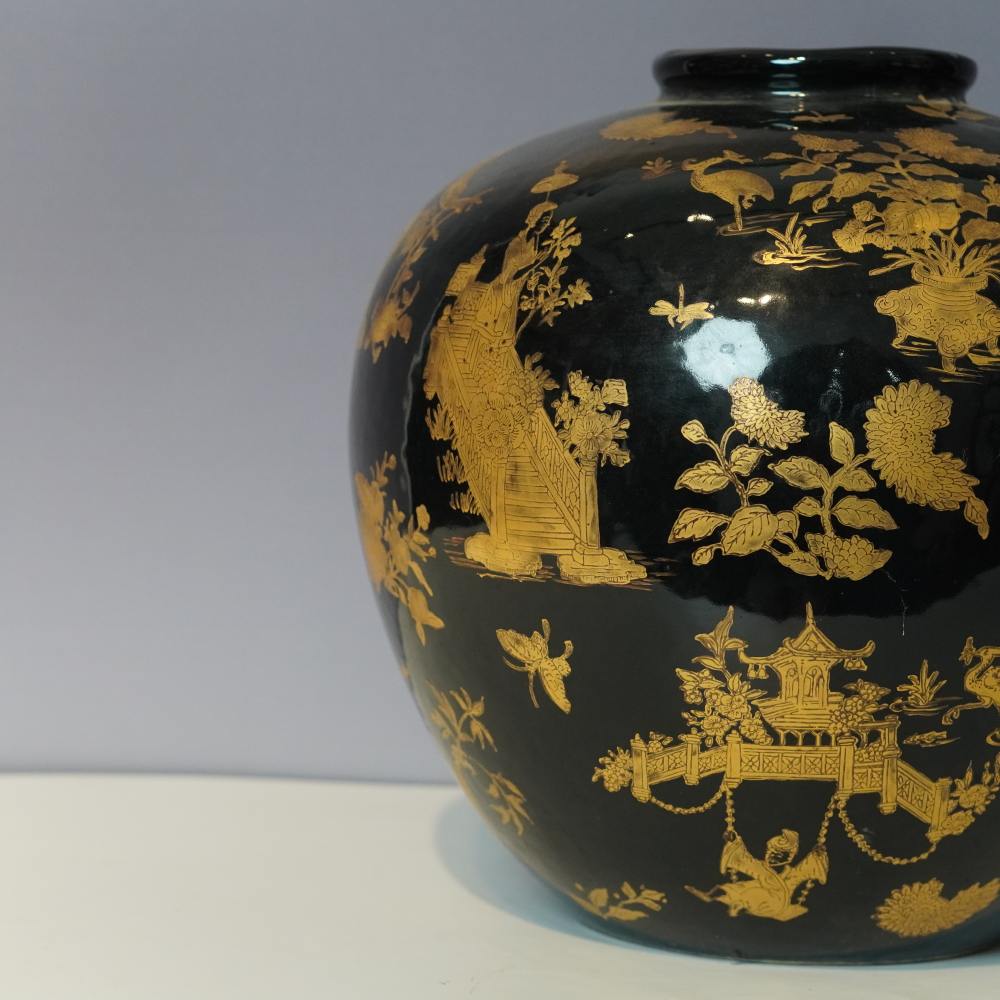 瓷器介绍 造型:这件海外回流瓷是一个圆腹罐形瓷器,罐口较小且内敛,罐身圆润饱满,整体造型敦实厚重,具有一种古朴的美感。这样的造型设计,在古时既方便储存物品,又适合作为陈设摆件。 装饰工艺:采用了黑地描金的装饰手法,以黑色作为底色,运用描金工艺在瓷体表面绘制丰富多样的图案。图案涵盖了花卉、鸟类、昆虫,还有亭台楼阁、人物等场景。花卉描绘细腻,展现出不同姿态;鸟类栩栩如生,仿佛即将振翅高飞;亭台楼阁与人物场景则生动地勾勒出古代生活的画面。金色的图案在黑色底色的衬托下,显得格外富丽堂皇,彰显出华贵的气质,同时也体现出较高的绘画技艺和装饰水准。