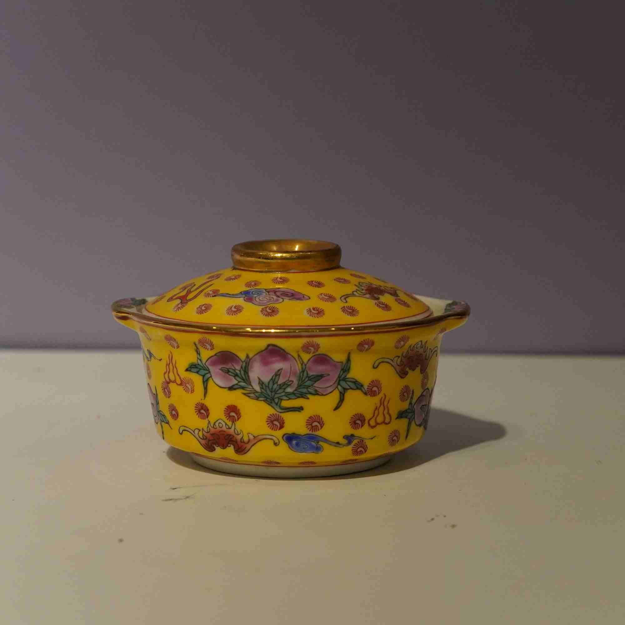 首页 / 徽章瓷 / 徽章瓷 / 金钮黄韵寿桃盖碗(长:11.5cm宽:10.5cm高:8cm)