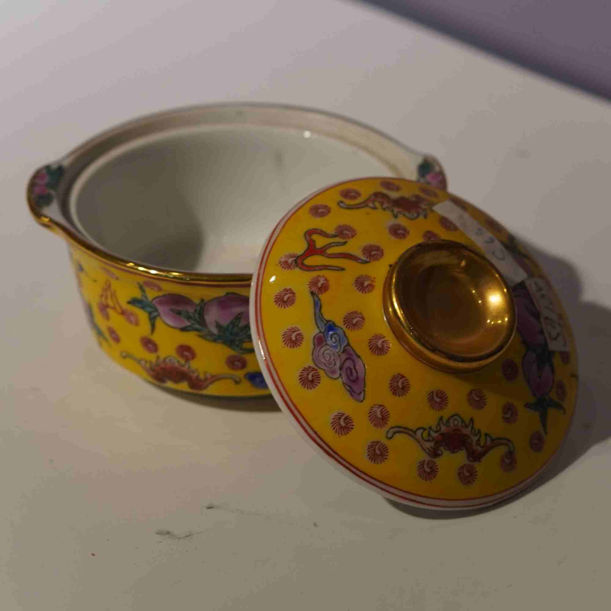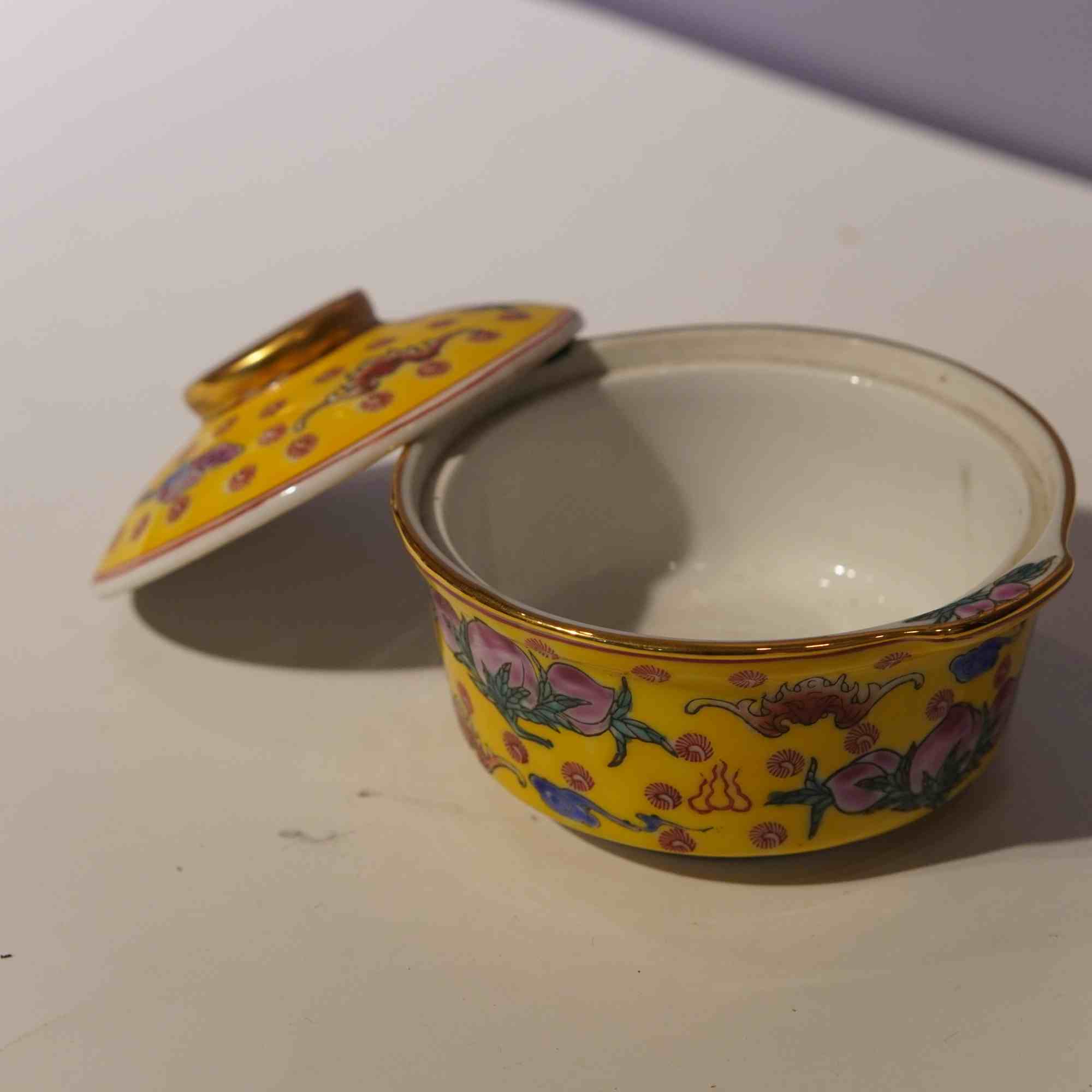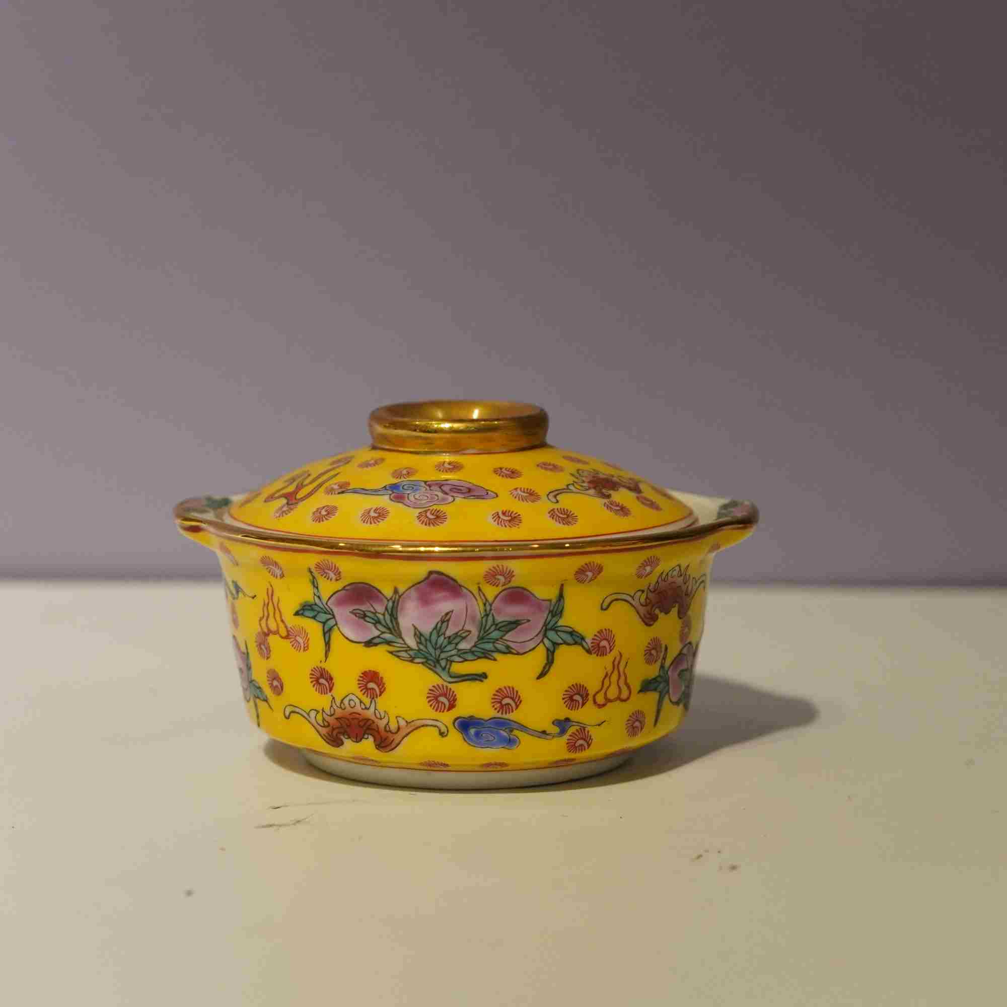 装饰工艺:以黄色为底色,色彩鲜艳明亮。采用了精美的彩绘工艺,碗身和盖子上绘制了丰富的图案。其中,桃子图案较为显眼,桃子色彩饱满,有粉色、紫色等,搭配绿色的叶子,栩栩如生,桃子在中国文化中常寓意长寿。此外,还装饰有各种祥瑞纹饰,如火焰纹、云纹等,线条流畅,色彩丰富,有红色、蓝色、粉色等,同时部分边缘还点缀有金色线条,增添了华贵之感。