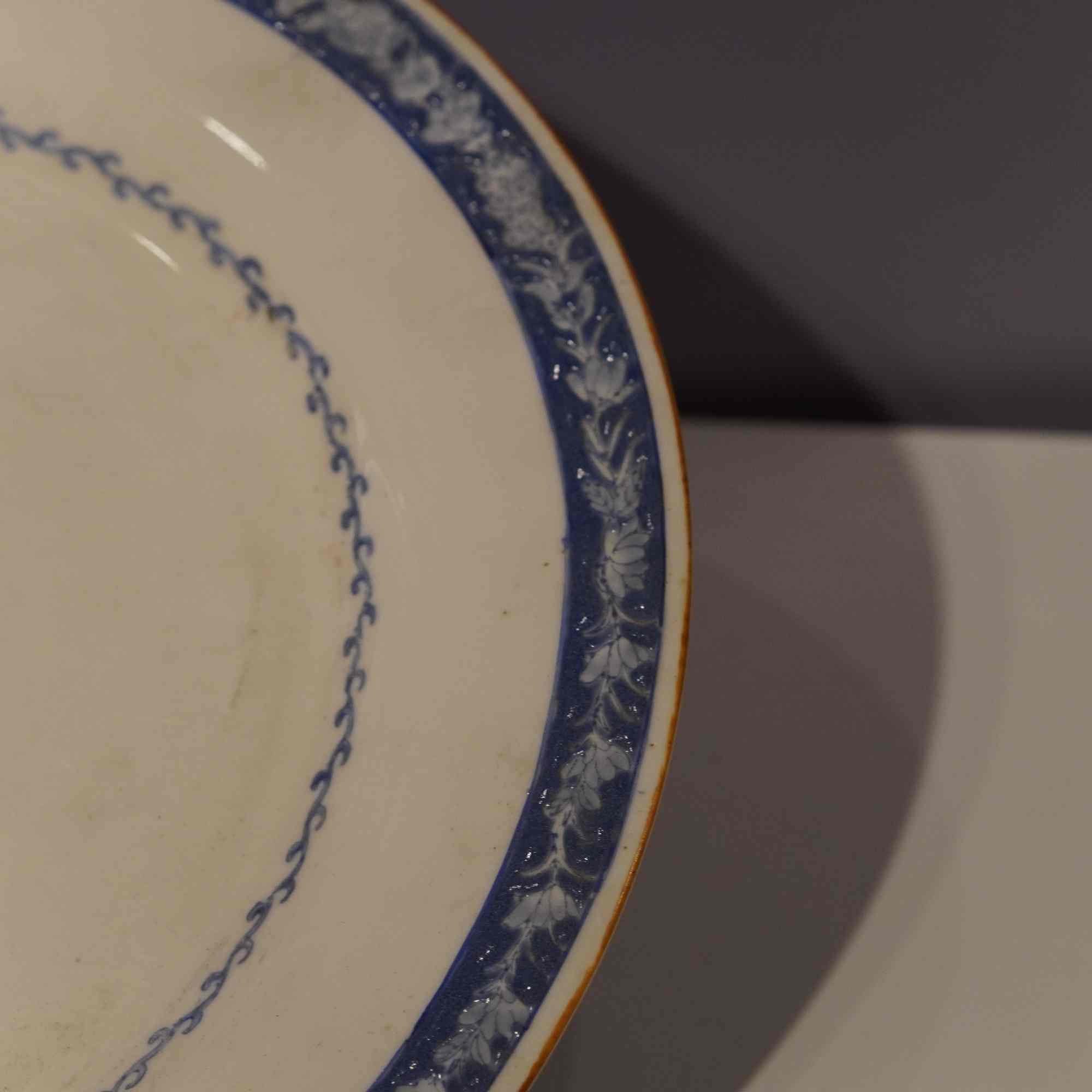 装饰工艺:采用蓝白配色的装饰手法,底色为米白色,显得古朴雅致。盘心绘制了一只卧着的鹿,鹿的造型较为写实,线条简洁流畅,展现出一种静谧的美感。盘心周围环绕着一圈细密的蓝色链条状花纹,边缘处则装饰有较为繁复的蓝白相间的花卉藤蔓图案,并且在最边缘还有一道细细的金色线条,为瓷盘增添了一丝精致感。