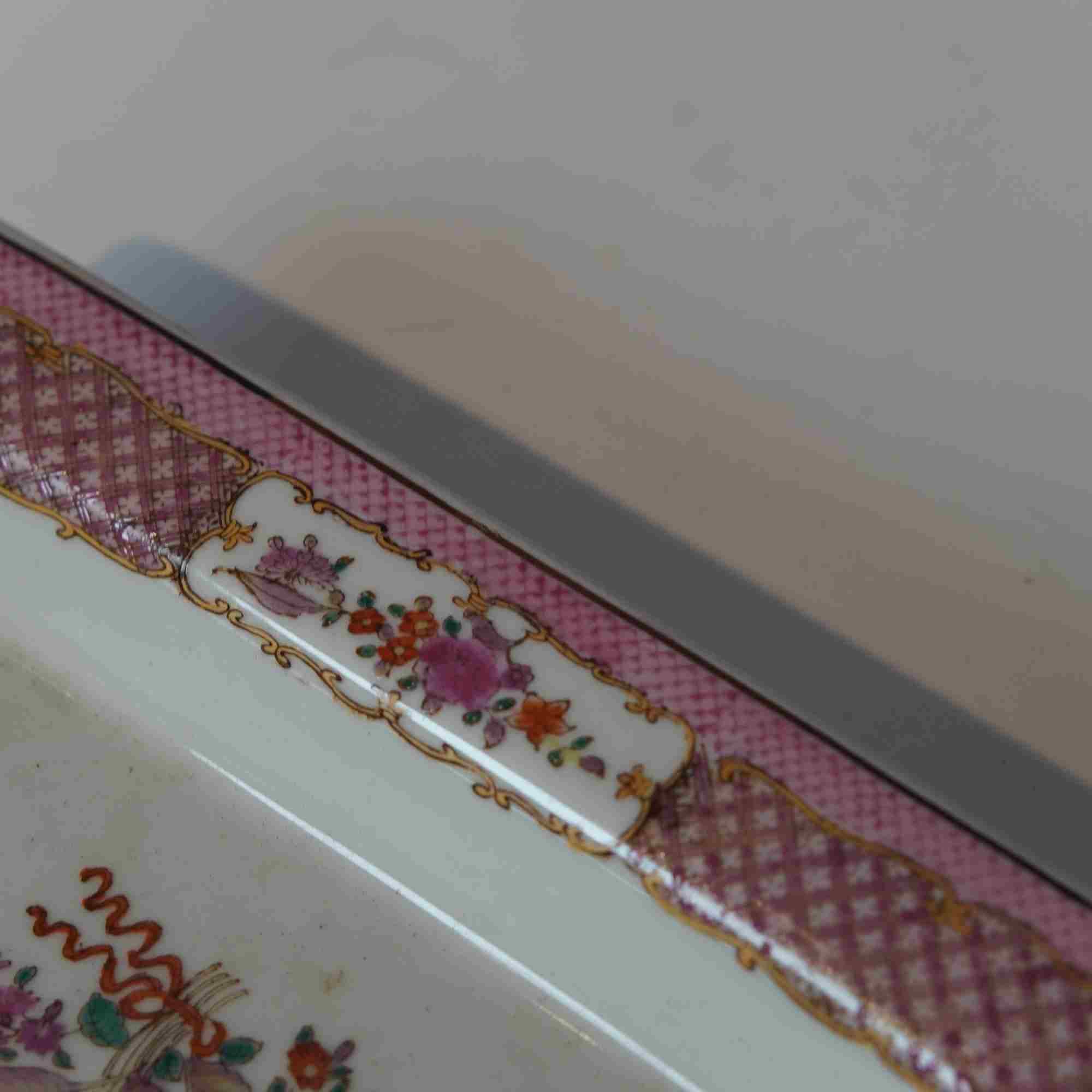装饰工艺:主体底色为白色,边缘装饰十分精美。外侧边缘是一圈紫红色的网格纹,其间点缀金色线条,增添华丽感。在紫红色网格纹内侧,还有花卉图案装饰带,花朵色彩丰富,包含粉色、红色、绿色等,绘制细腻,栩栩如生 。内部中心位置也有精美的花卉图案,以粉色系花卉为主,搭配绿叶,色彩搭配和谐,展现出较高的彩绘工艺水平。