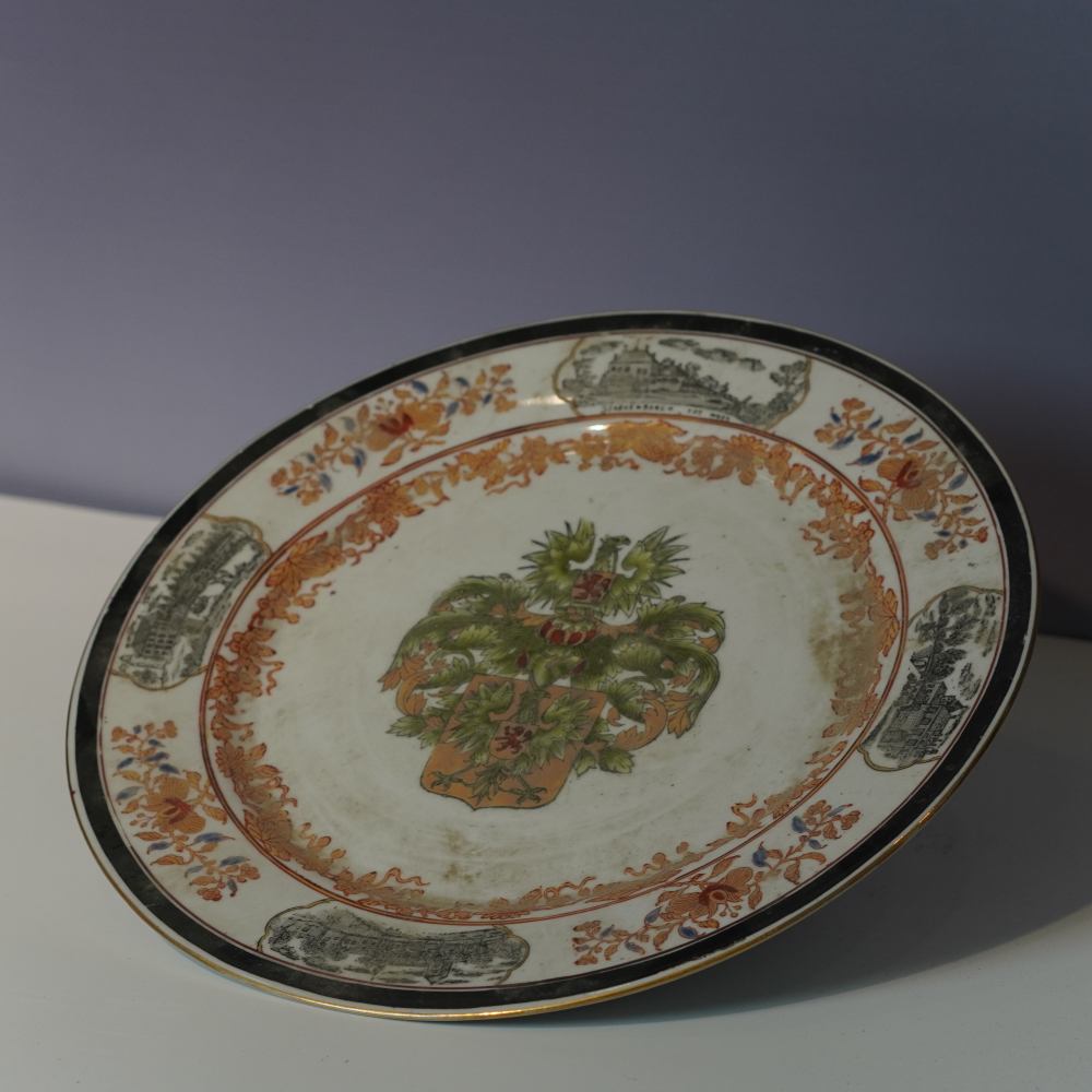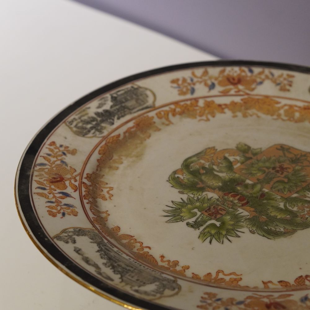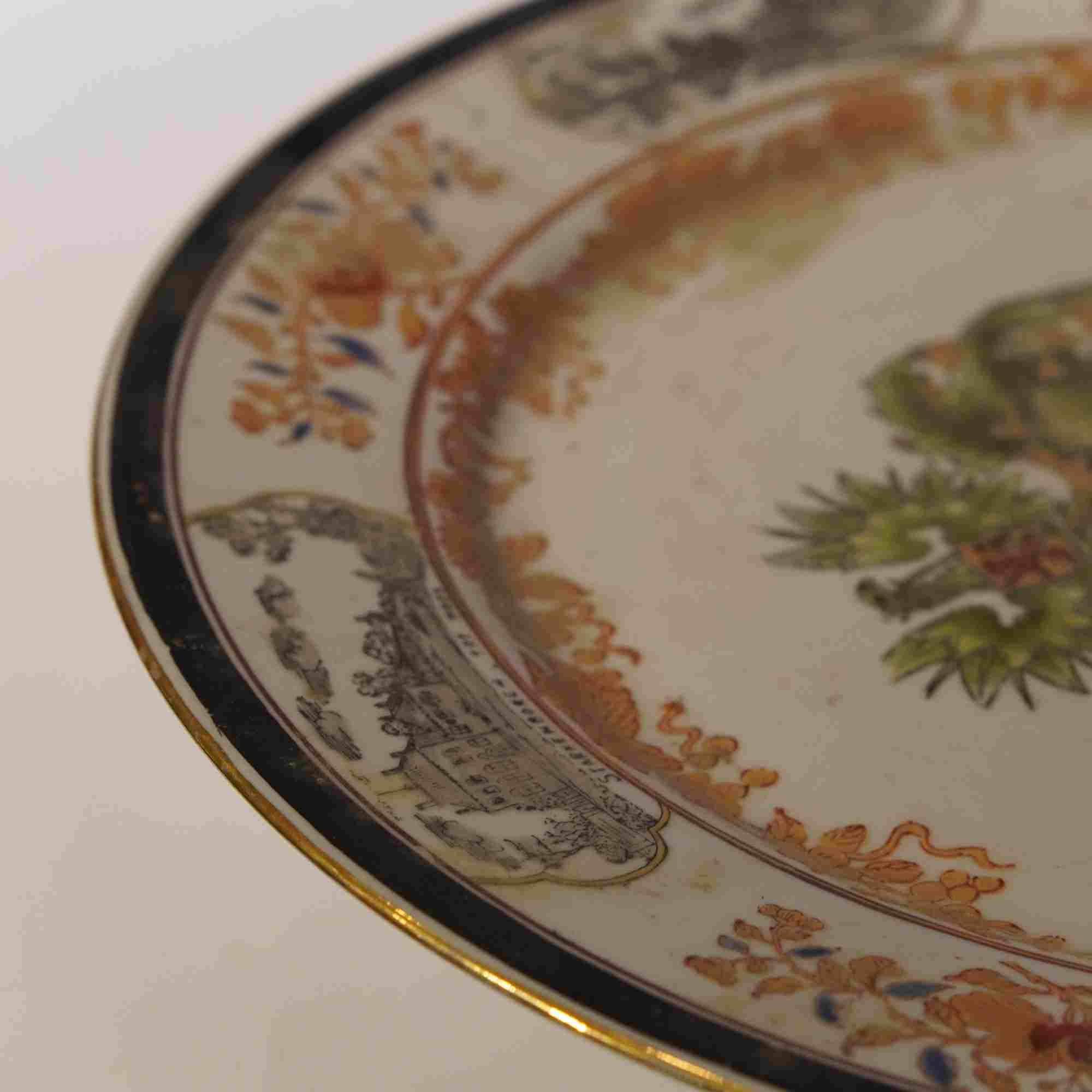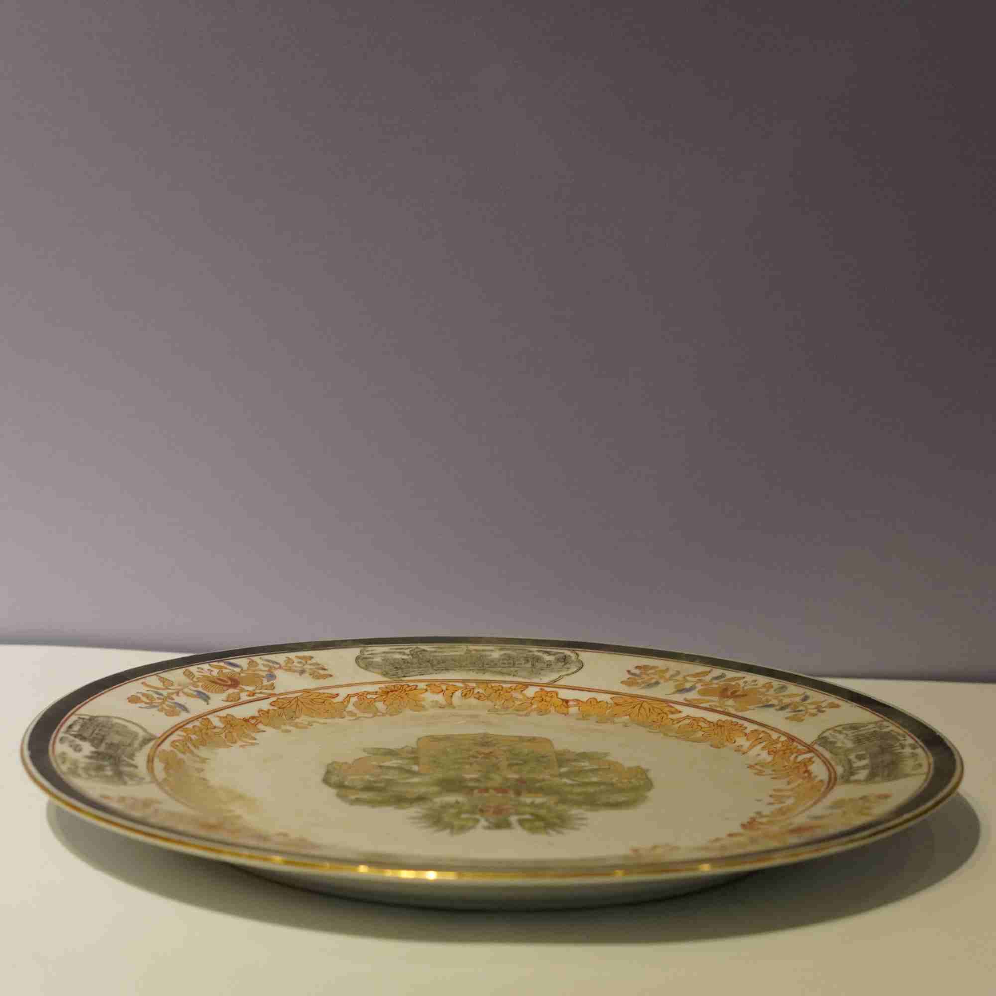 装饰工艺:采用了精美的彩绘工艺。瓷盘以白色为底色,盘心绘制有色彩丰富的徽章图案,徽章图案包含绿色、红色等多种颜色,细节丰富,具有标识和象征意义。围绕盘心的徽章,外侧有一圈装饰带,绘制有花卉图案,花朵颜色以橙色为主,间或点缀蓝色等色彩,并且还能看到一些类似风景的图案,如房屋等。边缘处有一道细细的金色线条,为瓷盘增添了精致感和华丽感。