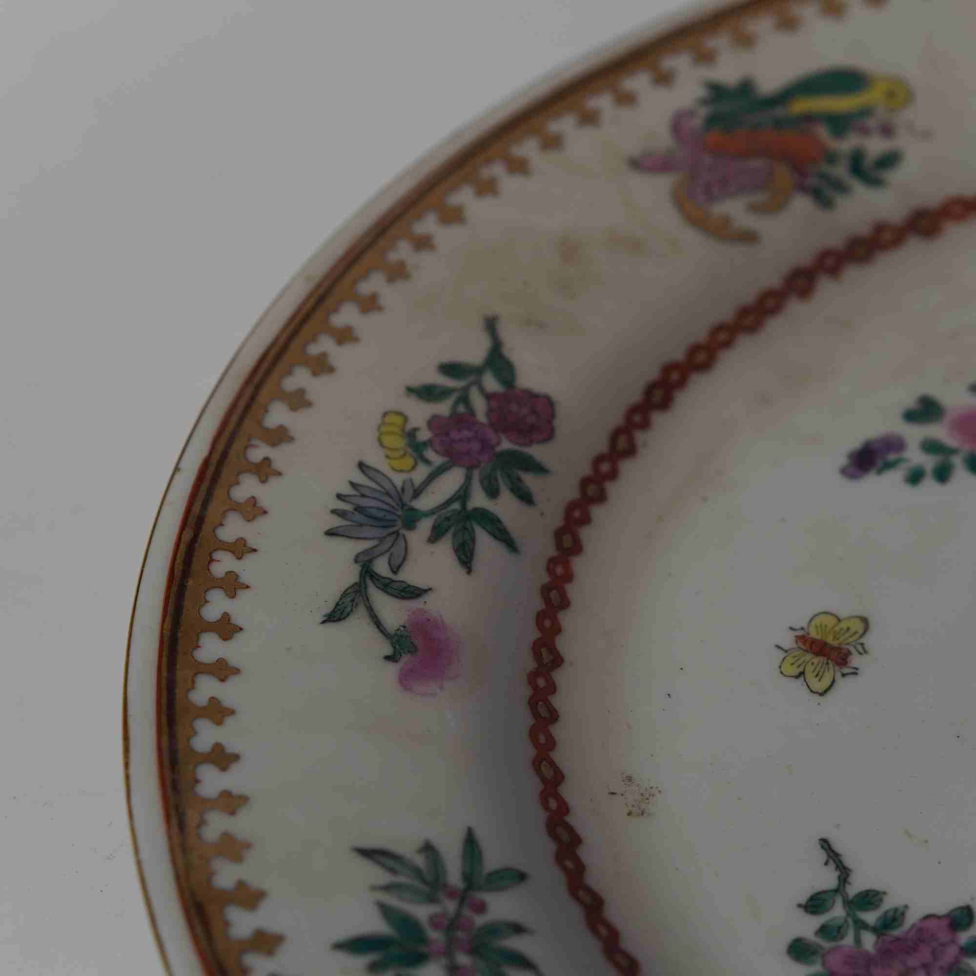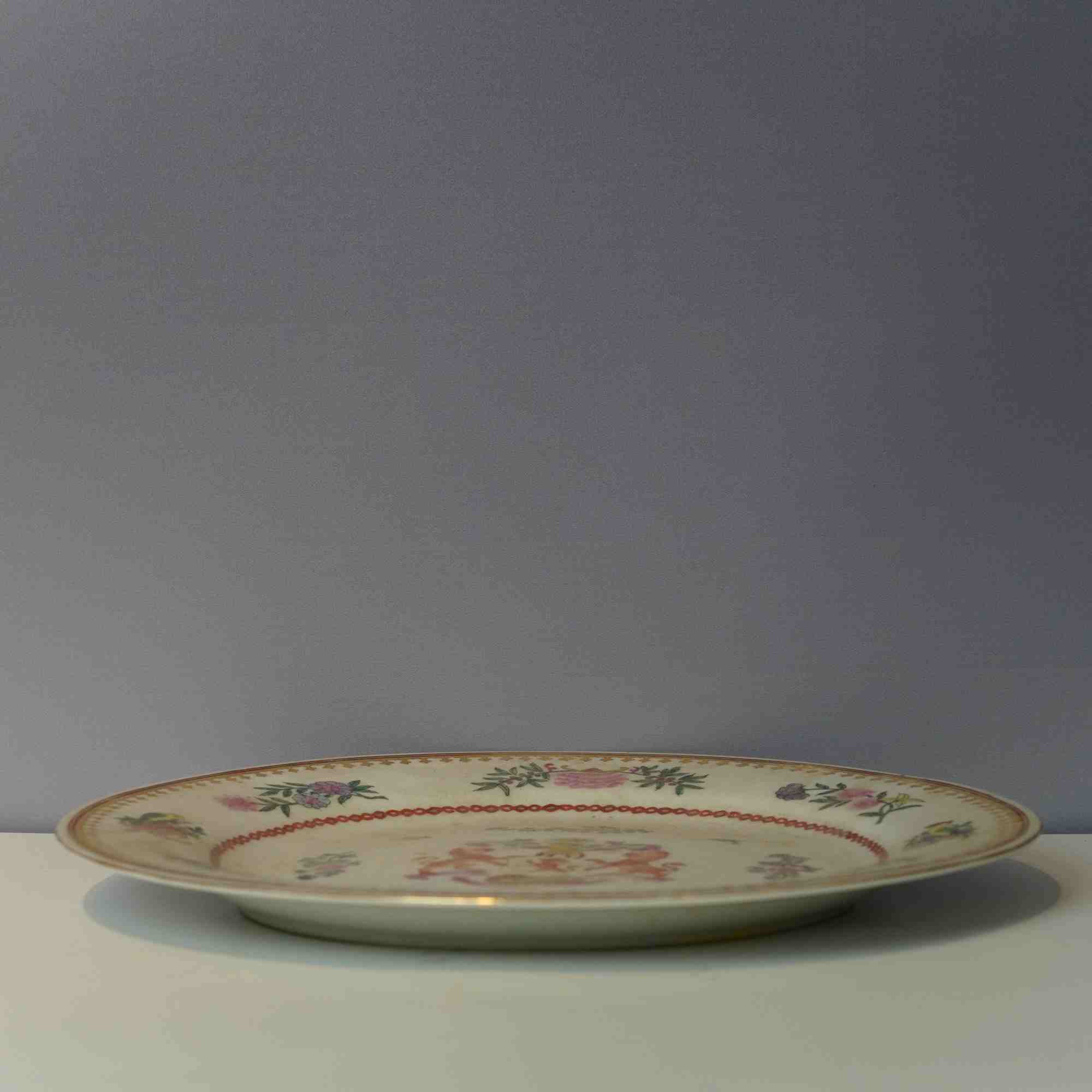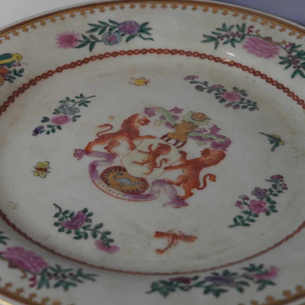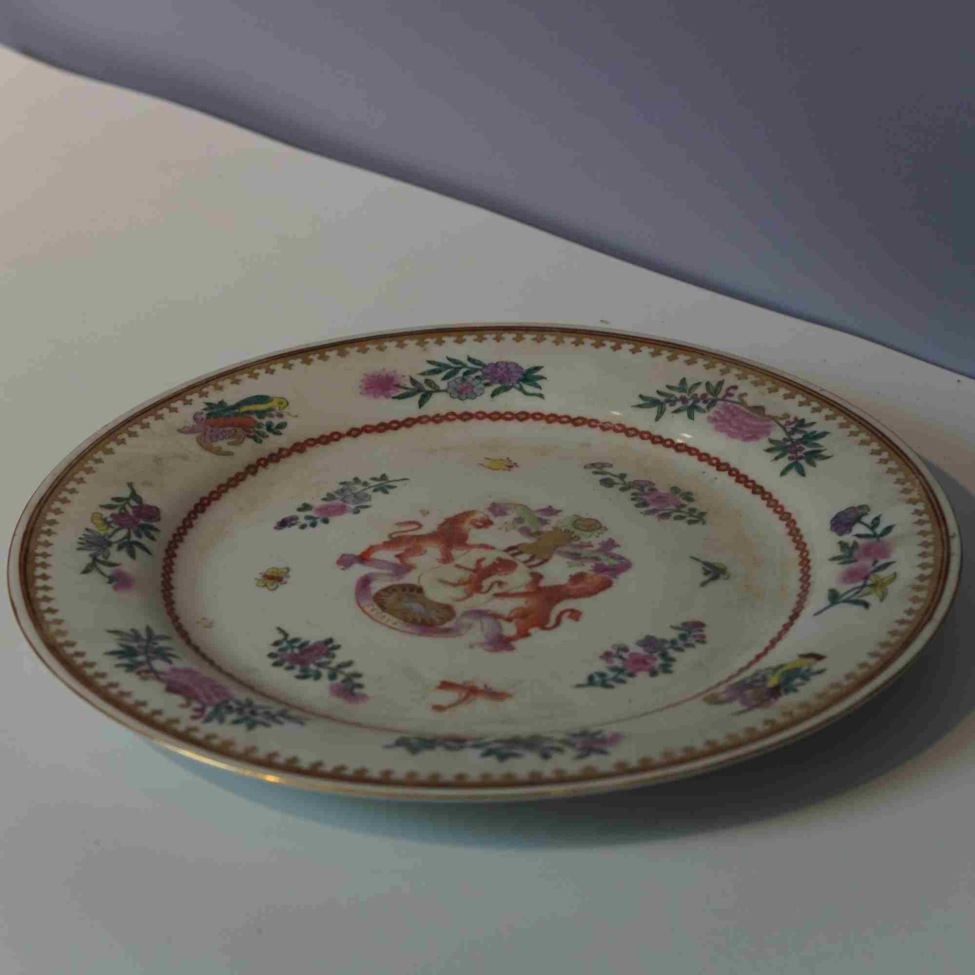 瓷器介绍 造型:这是一个圆形瓷盘,整体造型规整,边缘微微上翘,盘面较为平坦,适合盛放物品或作为装饰摆件。 装饰工艺:瓷盘以白色为底色,运用彩绘工艺进行装饰。盘心是精美的徽章图案,徽章中有狮子等形象,狮子色彩以红色为主,造型威严,具有特定的象征意义,代表着权力、守护等 ,徽章周围还有彩带、盾牌等元素,增添了图案的丰富性和层次感。盘面还分布着花卉、昆虫图案,花卉有粉色、紫色等,形态各异,昆虫如蜻蜓、蜜蜂等栩栩如生,点缀其间。盘边有一圈红色的线条装饰,并且在边缘处还饰有金色花纹,提升了瓷盘的精致感和华丽度。