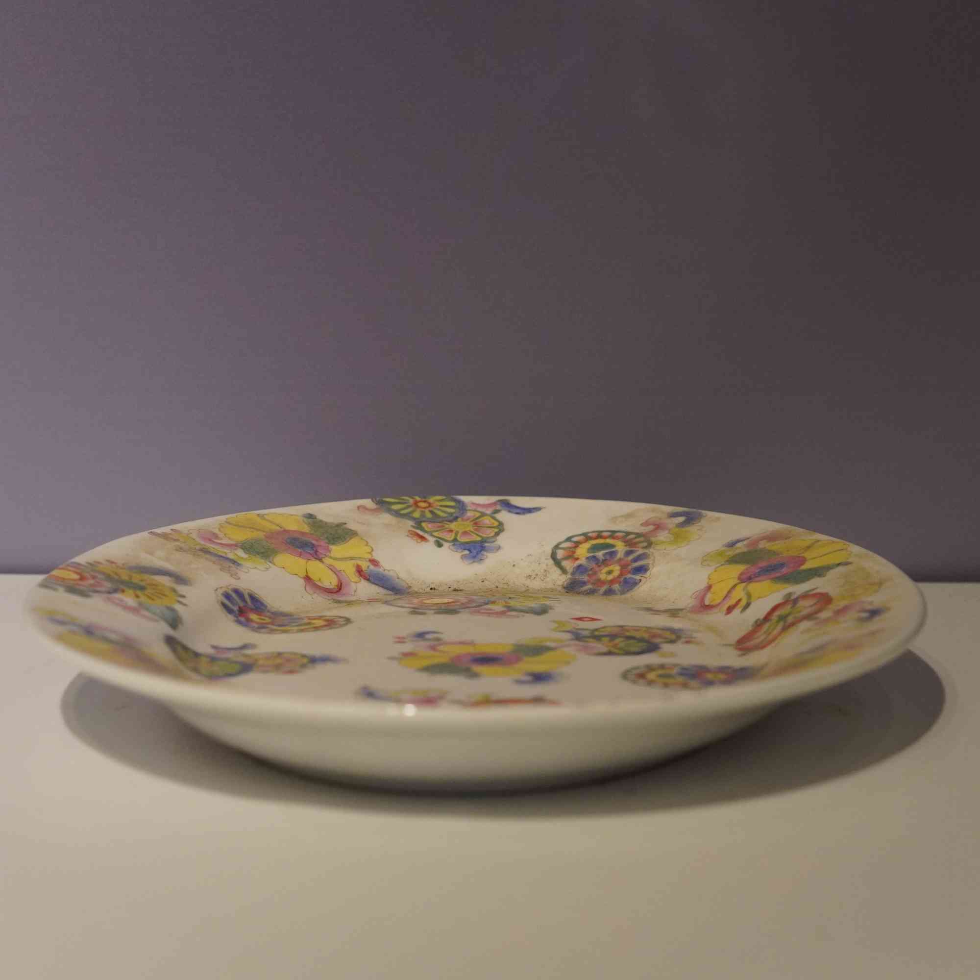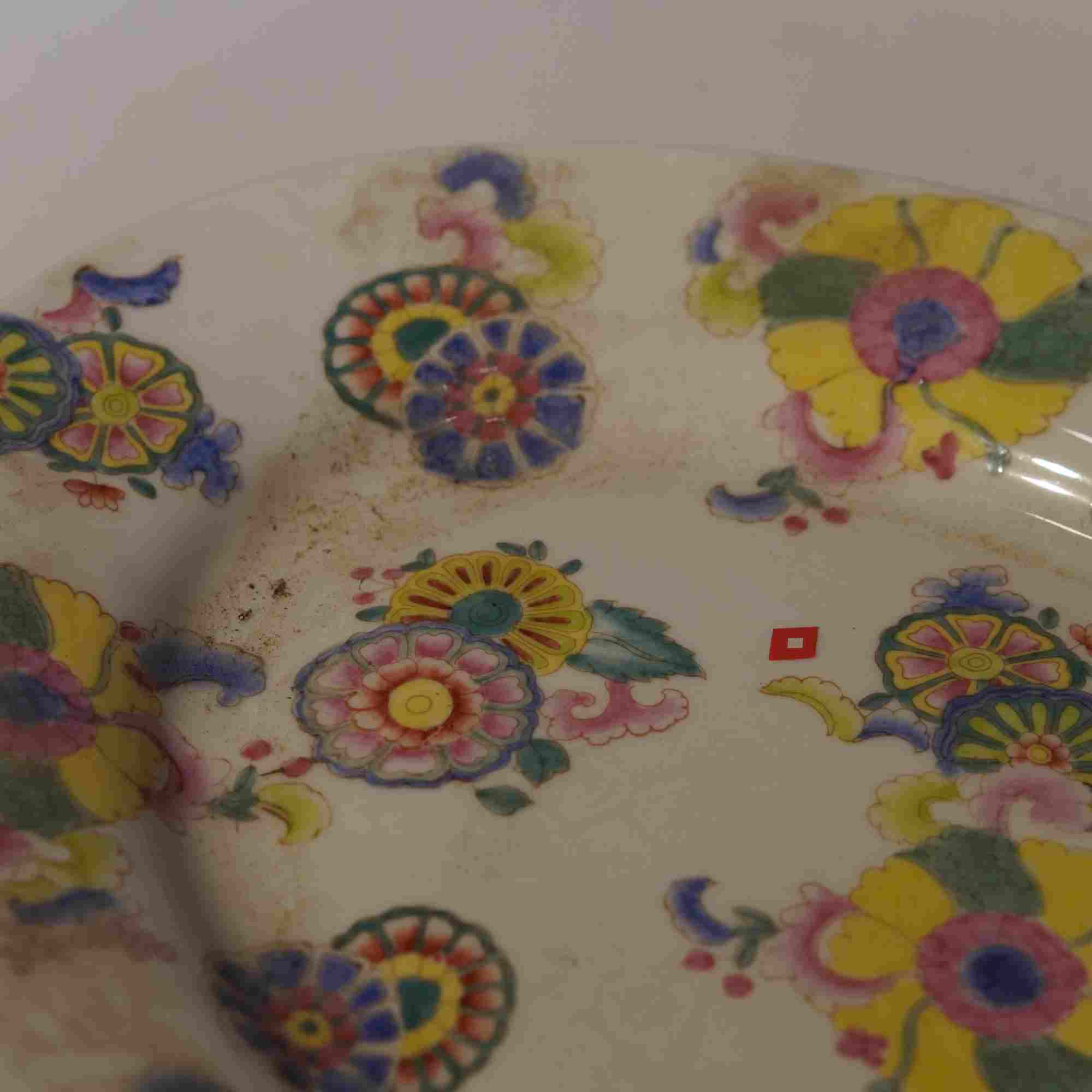 装饰工艺:采用彩绘工艺进行装饰,瓷盘以白色为底色,上面布满了色彩缤纷的花卉图案。花朵形态各异,有圆形、花瓣舒展形等,颜色丰富多样,包含黄色、红色、蓝色、粉色等,不同色彩相互搭配,形成了绚丽多彩的视觉效果。花卉之间还点缀着一些云纹等传统纹饰,整体图案布局较为松散,但又不失和谐,展现出一种自由灵动之美。